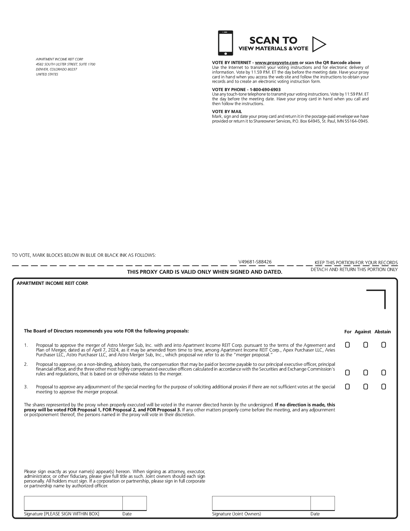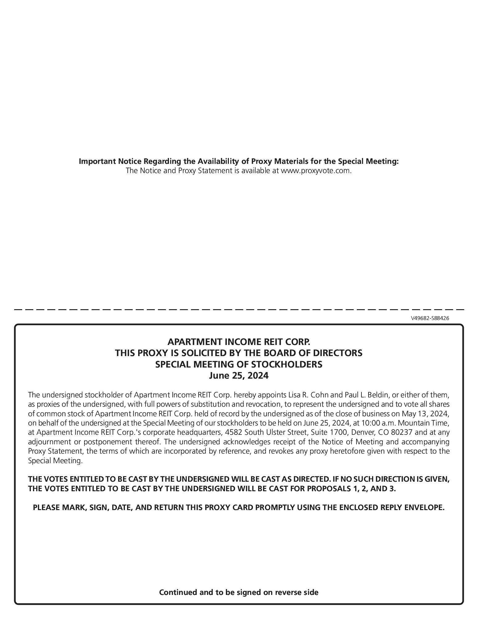 You are cordially invited to attend a special meeting of stockholders of Apartment Income REIT Corp., a Maryland corporation, to be held on June 25, 2024 at 10:00 a.m., Mountain Time, at Apartment Income REIT Corp.’s corporate headquarters, 4582 South Ulster Street, Suite 1700, Denver, CO 80237. The special meeting is being held for the purpose of acting on the following matters: