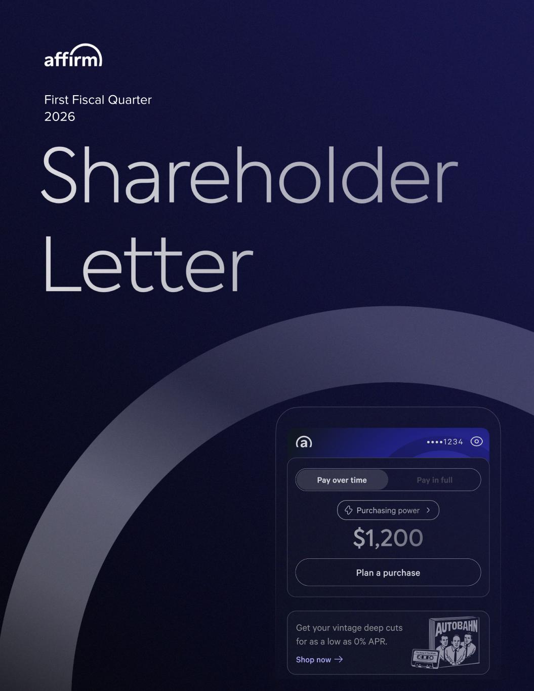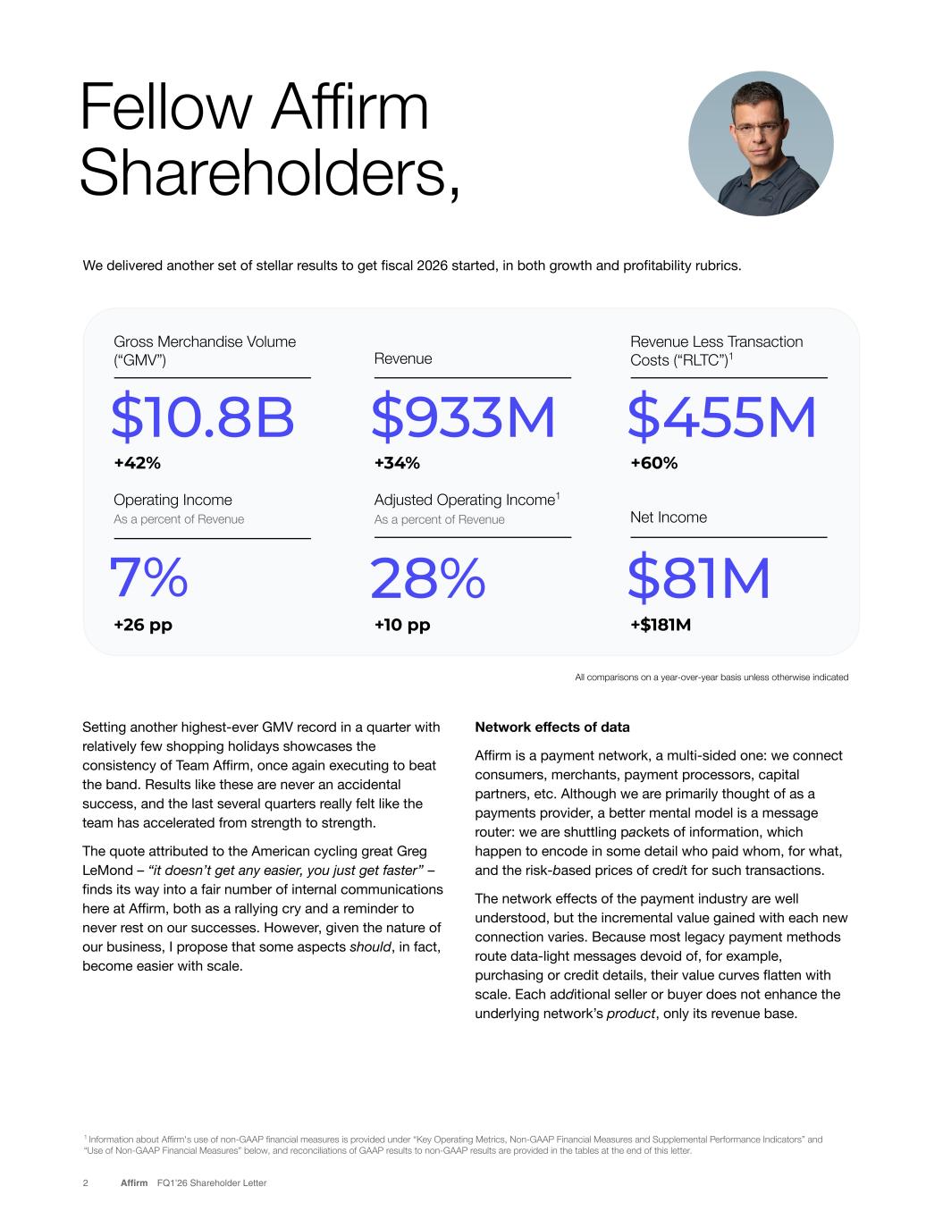 We delivered another set of stellar results to get fiscal 2026 started, in both growth and profitability rubrics. Fellow Affirm Shareholders, 2 Affirm FQ1’26 Shareholder Letter 1 Information about Affirm's use of non-GAAP financial measures is provided under “Key Operating Metrics, Non-GAAP Financial Measures and Supplemental Performance Indicators” and “Use of Non-GAAP Financial Measures” below, and reconciliations of GAAP results to non-GAAP results are provided in the tables at the end of this letter. Network effects of data Affirm is a payment network, a multi-sided one: we connect consumers, merchants, payment processors, capital partners, etc. Although we are primarily thought of as a payments provider, a better mental model is a message router: we are shuttling packets of information, which happen to encode in some detail who paid whom, for what, and the risk-based prices of credit for such transactions. The network effects of the payment industry are well understood, but the incremental value gained with each new connection varies. Because most legacy payment methods route data-light messages devoid of, for example, purchasing or credit details, their value curves flatten with scale. Each additional seller or buyer does not enhance the underlying network’s product, only its revenue base. Setting another highest-ever GMV record in a quarter with relatively few shopping holidays showcases the consistency of Team Affirm, once again executing to beat the band. Results like these are never an accidental success, and the last several quarters really felt like the team has accelerated from strength to strength. The quote attributed to the American cycling great Greg LeMond – “it doesn’t get any easier, you just get faster” – finds its way into a fair number of internal communications here at Affirm, both as a rallying cry and a reminder to never rest on our successes. However, given the nature of our business, I propose that some aspects should, in fact, become easier with scale. $455M Revenue Less Transaction Costs (“RLTC”)1 +60% $933M Revenue +34% $10.8B Gross Merchandise Volume (“GMV”) +42% Net Income +$181M 28% Adjusted Operating Income1 As a percent of Revenue +10 pp 7% Operating Income As a percent of Revenue +26 pp $81M All comparisons on a year-over-year basis unless otherwise indicated