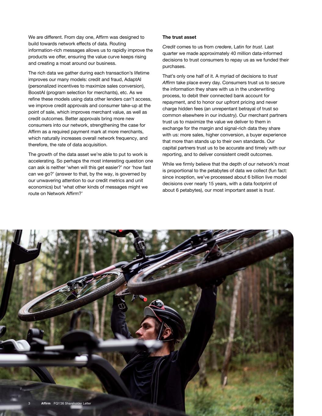 3 Affirm FQ1’26 Shareholder Letter We are different. From day one, Affirm was designed to build towards network effects of data. Routing information-rich messages allows us to rapidly improve the products we offer, ensuring the value curve keeps rising and creating a moat around our business. The rich data we gather during each transaction’s lifetime improves our many models: credit and fraud, AdaptAI (personalized incentives to maximize sales conversion), BoostAI (program selection for merchants), etc. As we refine these models using data other lenders can’t access, we improve credit approvals and consumer take-up at the point of sale, which improves merchant value, as well as credit outcomes. Better approvals bring more new consumers into our network, strengthening the case for Affirm as a required payment mark at more merchants, which naturally increases overall network frequency, and therefore, the rate of data acquisition. The growth of the data asset we’re able to put to work is accelerating. So perhaps the most interesting question one can ask is neither ‘when will this get easier?’ nor ‘how fast can we go?’ (answer to that, by the way, is governed by our unwavering attention to our credit metrics and unit economics) but ‘what other kinds of messages might we route on Network Affirm?’ The trust asset Credit comes to us from credere, Latin for trust. Last quarter we made approximately 40 million data-informed decisions to trust consumers to repay us as we funded their purchases. That’s only one half of it. A myriad of decisions to trust Affirm take place every day. Consumers trust us to secure the information they share with us in the underwriting process, to debit their connected bank account for repayment, and to honor our upfront pricing and never charge hidden fees (an unrepentant betrayal of trust so common elsewhere in our industry). Our merchant partners trust us to maximize the value we deliver to them in exchange for the margin and signal-rich data they share with us: more sales, higher conversion, a buyer experience that more than stands up to their own standards. Our capital partners trust us to be accurate and timely with our reporting, and to deliver consistent credit outcomes. While we firmly believe that the depth of our network’s moat is proportional to the petabytes of data we collect (fun fact: since inception, we’ve processed about 6 billion live model decisions over nearly 15 years, with a data footprint of about 6 petabytes), our most important asset is trust.