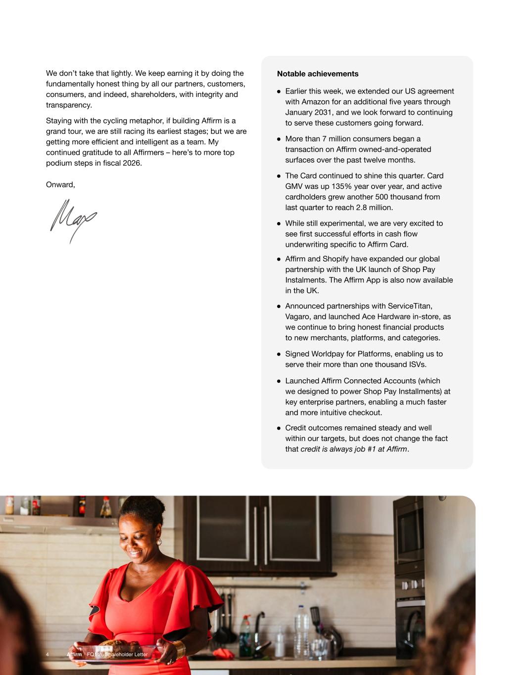 We don’t take that lightly. We keep earning it by doing the fundamentally honest thing by all our partners, customers, consumers, and indeed, shareholders, with integrity and transparency. Staying with the cycling metaphor, if building Affirm is a grand tour, we are still racing its earliest stages; but we are getting more efficient and intelligent as a team. My continued gratitude to all Affirmers – here’s to more top podium steps in fiscal 2026. Onward, 44 Affirm FQ1’26 Shareholder Letter ● Earlier this week, we extended our US agreement with Amazon for an additional five years through January 2031, and we look forward to continuing to serve these customers going forward. Notable achievements ● More than 7 million consumers began a transaction on Affirm owned-and-operated surfaces over the past twelve months. ● The Card continued to shine this quarter. Card GMV was up 135% year over year, and active cardholders grew another 500 thousand from last quarter to reach 2.8 million. ● While still experimental, we are very excited to see first successful efforts in cash flow underwriting specific to Affirm Card. ● Affirm and Shopify have expanded our global partnership with the UK launch of Shop Pay Instalments. The Affirm App is also now available in the UK. ● Announced partnerships with ServiceTitan, Vagaro, and launched Ace Hardware in-store, as we continue to bring honest financial products to new merchants, platforms, and categories. ● Signed Worldpay for Platforms, enabling us to serve their more than one thousand ISVs. ● Launched Affirm Connected Accounts (which we designed to power Shop Pay Installments) at key enterprise partners, enabling a much faster and more intuitive checkout. ● Credit outcomes remained steady and well within our targets, but does not change the fact that credit is always job #1 at Affirm.