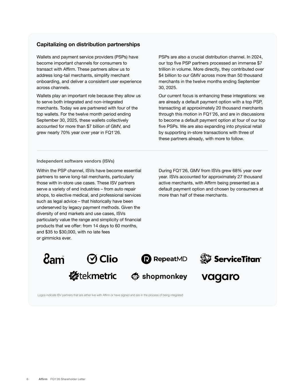 Within the PSP channel, ISVs have become essential partners to serve long-tail merchants, particularly those with in-store use cases. These ISV partners serve a variety of end industries – from auto repair shops, to elective medical, and professional services such as legal advice – that historically have been underserved by legacy payment methods. Given the diversity of end markets and use cases, ISVs particularly value the range and simplicity of financial products that we offer: from 14 days to 60 months, and $35 to $30,000, with no late fees or gimmicks ever. During FQ1’26, GMV from ISVs grew 68% year over year. ISVs accounted for approximately 27 thousand active merchants, with Affirm being presented as a default payment option and chosen by consumers at more than half of these merchants. Capitalizing on distribution partnerships Wallets and payment service providers (PSPs) have become important channels for consumers to transact with Affirm. These partners allow us to address long-tail merchants, simplify merchant onboarding, and deliver a consistent user experience across channels. Wallets play an important role because they allow us to serve both integrated and non-integrated merchants. Today we are partnered with four of the top wallets. For the twelve month period ending September 30, 2025, these wallets collectively accounted for more than $7 billion of GMV, and grew nearly 70% year over year in FQ1’26. Payment Service Provider U.S. TPV $1 E-comm status In-store status Default payment status Partner A $2.6T Partner B $2T Partner C $1.9T Partner D $600B Partner E $300B 1 Source: TSG eReport 2025 = Live = Currently being built or on commercial roadmap = In discussions Logos indicate ISV partners that are either live with Affirm or have signed and are in the process of being integrated 6 Affirm FQ1’26 Shareholder Letter PSPs are also a crucial distribution channel. In 2024, our top five PSP partners processed an immense $7 trillion in volume. More directly, they contributed over $4 billion to our GMV across more than 50 thousand merchants in the twelve months ending September 30, 2025. Our current focus is enhancing these integrations: we are already a default payment option with a top PSP, transacting at approximately 20 thousand merchants through this motion in FQ1’26, and are in discussions to become a default payment option at four of our top five PSPs. We are also expanding into physical retail by supporting in-store transactions with three of these partners already, with more to follow. Independent software vendors (ISVs)