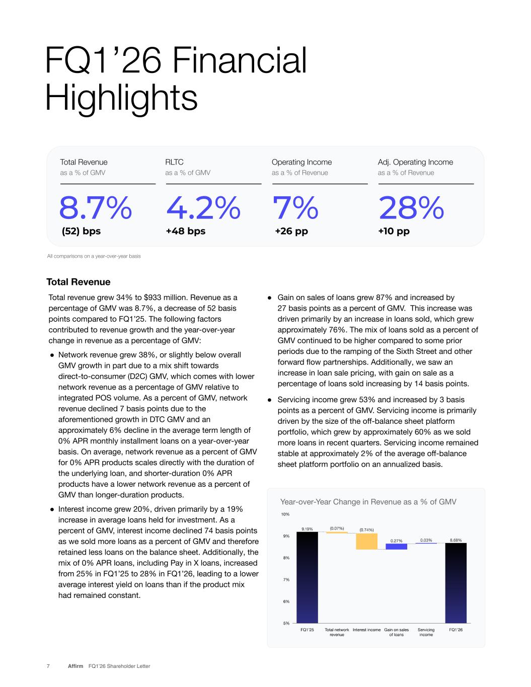 Total revenue grew 34% to $933 million. Revenue as a percentage of GMV was 8.7%, a decrease of 52 basis points compared to FQ1’25. The following factors contributed to revenue growth and the year-over-year change in revenue as a percentage of GMV: ● Network revenue grew 38%, or slightly below overall GMV growth in part due to a mix shift towards direct-to-consumer (D2C) GMV, which comes with lower network revenue as a percentage of GMV relative to integrated POS volume. As a percent of GMV, network revenue declined 7 basis points due to the aforementioned growth in DTC GMV and an approximately 6% decline in the average term length of 0% APR monthly installment loans on a year-over-year basis. On average, network revenue as a percent of GMV for 0% APR products scales directly with the duration of the underlying loan, and shorter-duration 0% APR products have a lower network revenue as a percent of GMV than longer-duration products. ● Interest income grew 20%, driven primarily by a 19% increase in average loans held for investment. As a percent of GMV, interest income declined 74 basis points as we sold more loans as a percent of GMV and therefore retained less loans on the balance sheet. Additionally, the mix of 0% APR loans, including Pay in X loans, increased from 25% in FQ1’25 to 28% in FQ1’26, leading to a lower average interest yield on loans than if the product mix had remained constant. ● Gain on sales of loans grew 87% and increased by 27 basis points as a percent of GMV. This increase was driven primarily by an increase in loans sold, which grew approximately 76%. The mix of loans sold as a percent of GMV continued to be higher compared to some prior periods due to the ramping of the Sixth Street and other forward flow partnerships. Additionally, we saw an increase in loan sale pricing, with gain on sale as a percentage of loans sold increasing by 14 basis points. ● Servicing income grew 53% and increased by 3 basis points as a percent of GMV. Servicing income is primarily driven by the size of the off-balance sheet platform portfolio, which grew by approximately 60% as we sold more loans in recent quarters. Servicing income remained stable at approximately 2% of the average off-balance sheet platform portfolio on an annualized basis. FQ1’26 Financial Highlights 7 Affirm FQ1’26 Shareholder Letter Total Revenue Adj. Operating Income as a % of Revenue 27% +4 pp Total Revenue as a % of GMV 8.7% RLTC as a % of GMV 4.2% +48 bps Operating Income as a % of Revenue 7% +26 pp All comparisons on a year-over-year basis (52) bps j i I f 8 10 pp Year-over-Year Change in Revenue as a % of GMV