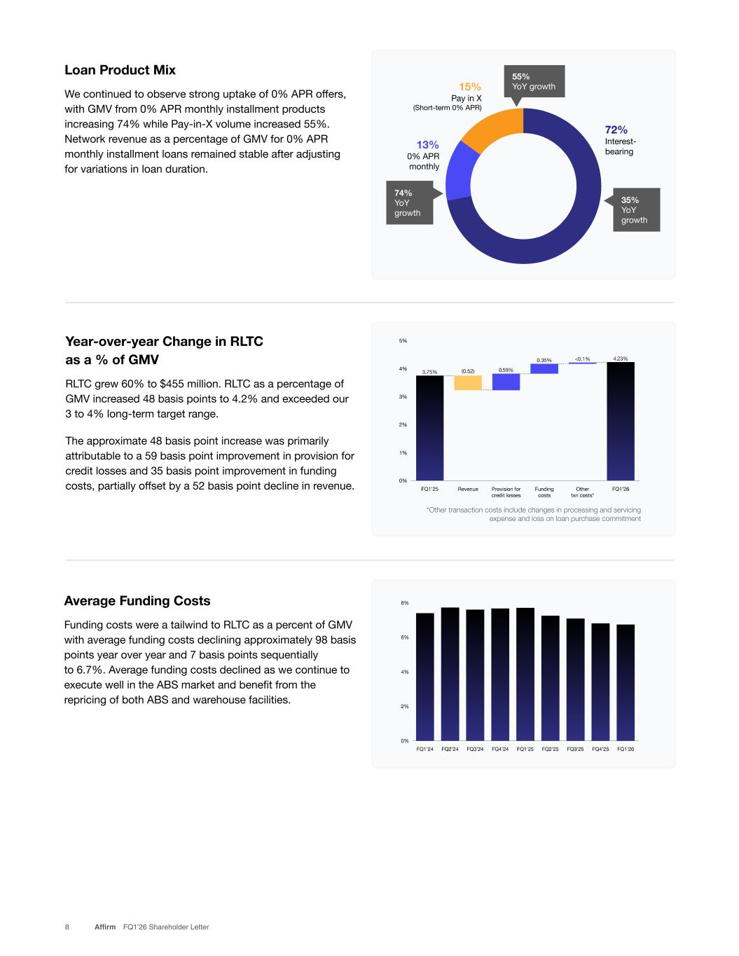 8 Affirm FQ1’26 Shareholder Letter Mix-stabilized network revenue as a % of 0% APR Monthly Installment GMV Loan Product Mix We continued to observe strong uptake of 0% APR offers, with GMV from 0% APR monthly installment products increasing 74% while Pay-in-X volume increased 55%. Network revenue as a percentage of GMV for 0% APR monthly installment loans remained stable after adjusting for variations in loan duration. *Other transaction costs include changes in processing and servicing expense and loss on loan purchase commitment Year-over-year Change in RLTC as a % of GMV RLTC grew 60% to $455 million. RLTC as a percentage of GMV increased 48 basis points to 4.2% and exceeded our 3 to 4% long-term target range. The approximate 48 basis point increase was primarily attributable to a 59 basis point improvement in provision for credit losses and 35 basis point improvement in funding costs, partially offset by a 52 basis point decline in revenue. Average Funding Costs Funding costs were a tailwind to RLTC as a percent of GMV with average funding costs declining approximately 98 basis points year over year and 7 basis points sequentially to 6.7%. Average funding costs declined as we continue to execute well in the ABS market and benefit from the repricing of both ABS and warehouse facilities. 15% Pay in X (Short-term 0% APR) 72% Interest- bearing 13% 0% APR monthly 15% Pay in X (Short-term 0% APR) 72% Interest- bearing 13% 0% APR monthly 68% YoY growth 35% YoY growth 55% YoY growth 55% YoY growth 35% YoY growth 74% YoY growth