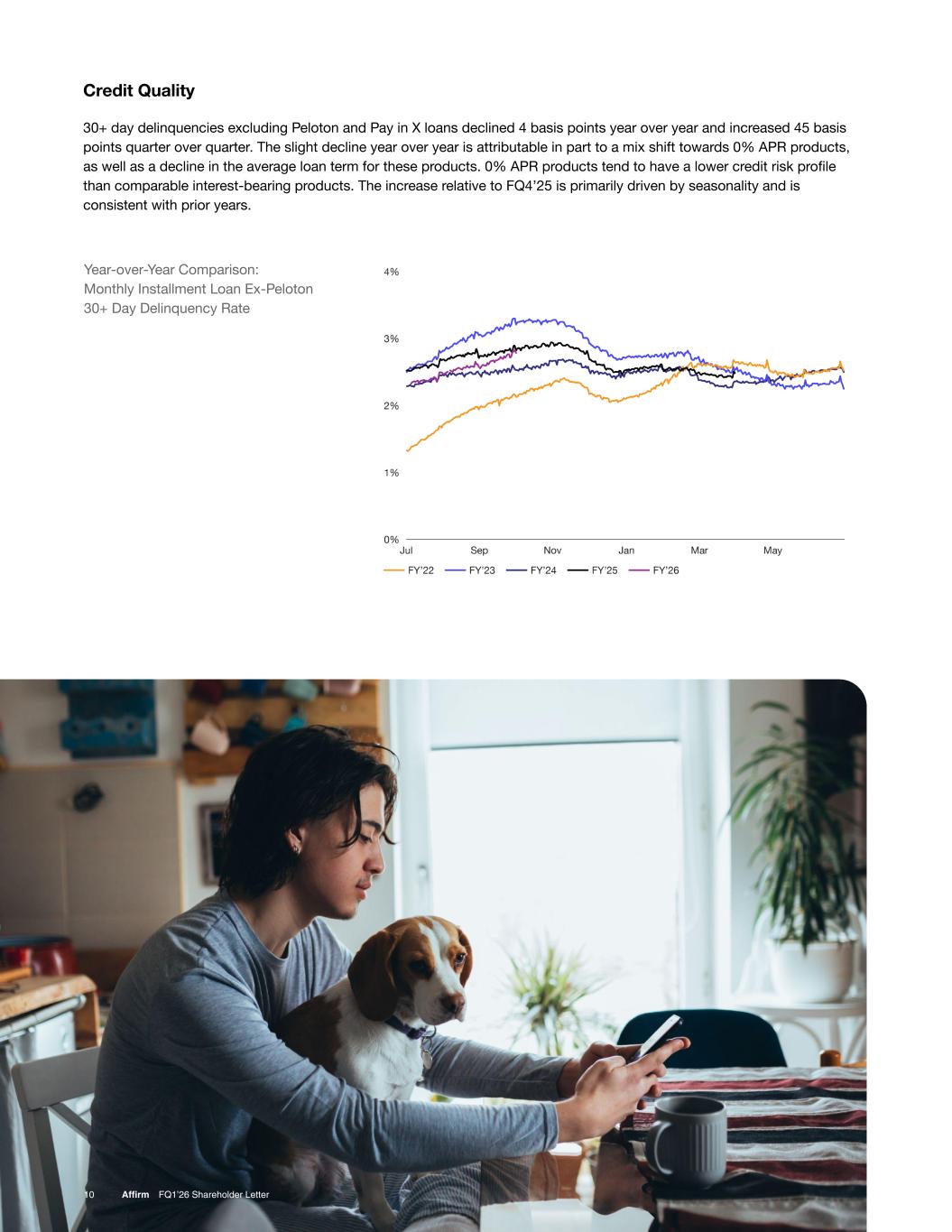 Year-over-Year Comparison: Monthly Installment Loan Ex-Peloton 30+ Day Delinquency Rate 10 Affirm FQ1’26 Shareholder Letter Credit Quality 30+ day delinquencies excluding Peloton and Pay in X loans declined 4 basis points year over year and increased 45 basis points quarter over quarter. The slight decline year over year is attributable in part to a mix shift towards 0% APR products, as well as a decline in the average loan term for these products. 0% APR products tend to have a lower credit risk profile than comparable interest-bearing products. The increase relative to FQ4’25 is primarily driven by seasonality and is consistent with prior years.
