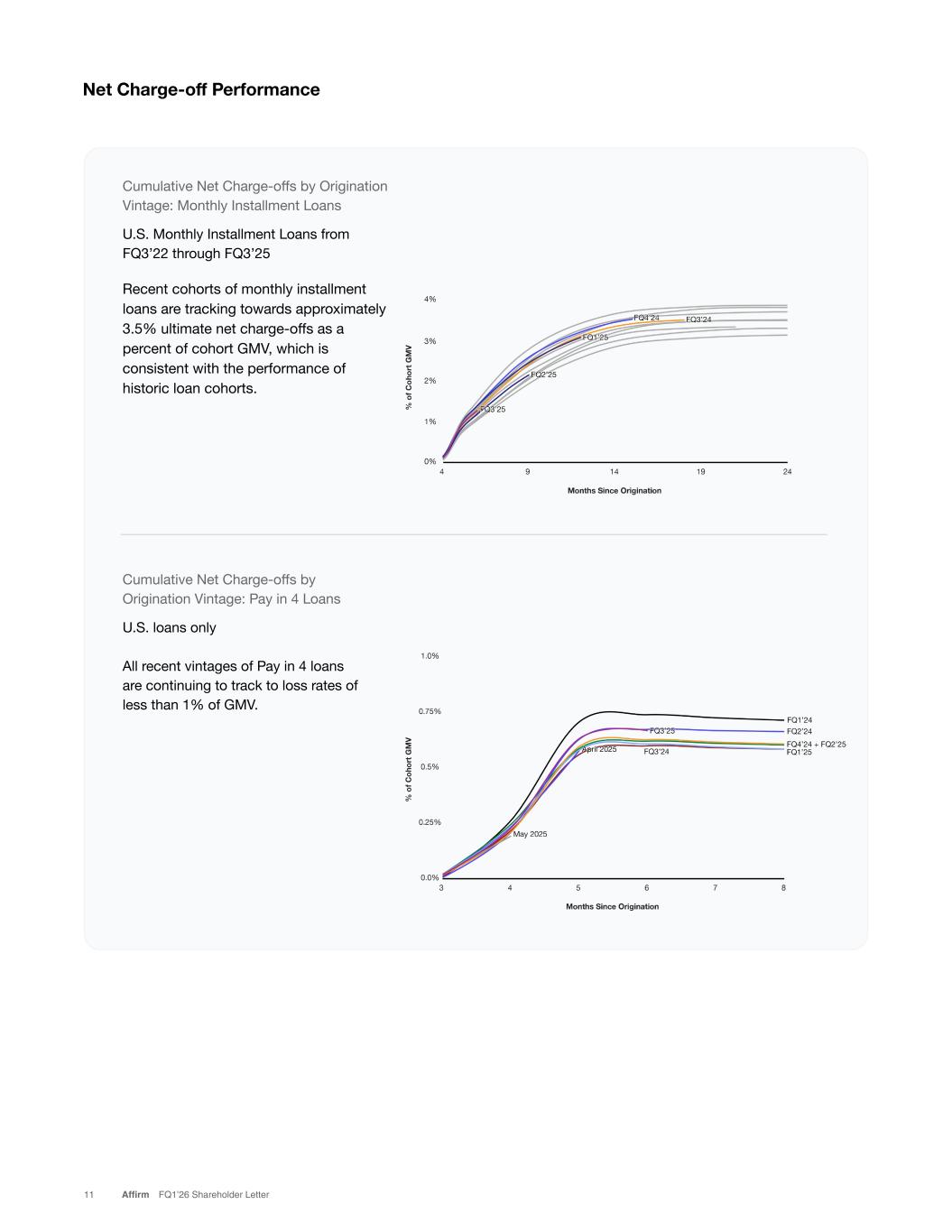 Cumulative Net Charge-offs by Origination Vintage: Monthly Installment Loans U.S. Monthly Installment Loans from FQ3’22 through FQ3’25 Recent cohorts of monthly installment loans are tracking towards approximately 3.5% ultimate net charge-offs as a percent of cohort GMV, which is consistent with the performance of historic loan cohorts. 11 Affirm FQ1’26 Shareholder Letter Cumulative Net Charge-offs by Origination Vintage: Pay in 4 Loans U.S. loans only All recent vintages of Pay in 4 loans are continuing to track to loss rates of less than 1% of GMV. Net Charge-off Performance