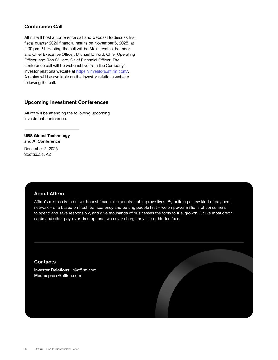 14 Affirm FQ1’26 Shareholder Letter About Affirm Affirm’s mission is to deliver honest financial products that improve lives. By building a new kind of payment network – one based on trust, transparency and putting people first – we empower millions of consumers to spend and save responsibly, and give thousands of businesses the tools to fuel growth. Unlike most credit cards and other pay-over-time options, we show consumers exactly what they will pay up front, and never charge any late or hidden fees. Contacts Investor Relations: ir@affirm.com Media: press@affirm.com Conference Call Affirm will host a conference call and webcast to discuss first fiscal quarter 2026 financial results on November 6, 2025, at 2:00 pm PT. Hosting the call will be Max Levchin, Founder and Chief Executive Officer, Michael Linford, Chief Operating Officer, and Rob O’Hare, Chief Financial Officer. The conference call will be webcast live from the Company’s investor relations website at https://investors.affirm.com/. A replay will be available on the investor relations website following the call. UBS Global Technology and AI Conference December 2, 2025 Scottsdale, AZ Upcoming Investment Conferences Affirm will be attending the following upcoming investment conference: never harge any late or hidden f es.