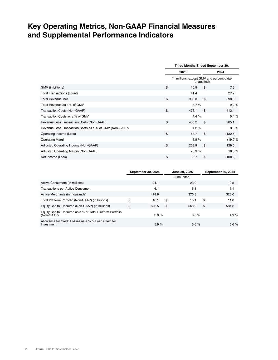 Three Months Ended September 30, 2025 2024 (in millions, except GMV and percent data) (unaudited) GMV (in billions) $ 10.8 $ 7.6 Total Transactions (count) 41.4 27.2 Total Revenue, net $ 933.3 $ 698.5 Total Revenue as a % of GMV 8.7 % 9.2 % Transaction Costs (Non-GAAP) $ 478.1 $ 413.4 Transaction Costs as a % of GMV 4.4 % 5.4 % Revenue Less Transaction Costs (Non-GAAP) $ 455.2 $ 285.1 Revenue Less Transaction Costs as a % of GMV (Non-GAAP) 4.2 % 3.8 % Operating Income (Loss) $ 63.7 $ (132.6) Operating Margin 6.8 % (19.0) % Adjusted Operating Income (Non-GAAP) $ 263.9 $ 129.6 Adjusted Operating Margin (Non-GAAP) 28.3 % 18.6 % Net Income (Loss) $ 80.7 $ (100.2) Key Operating Metrics, Non-GAAP Financial Measures and Supplemental Performance Indicators September 30, 2025 June 30, 2025 September 30, 2024 (unaudited) Active Consumers (in millions) 24.1 23.0 19.5 Transactions per Active Consumer 6.1 5.8 5.1 Active Merchants (in thousands) 418.9 376.8 323.0 Total Platform Portfolio (Non-GAAP) (in billions) $ 16.1 $ 15.1 $ 11.8 Equity Capital Required (Non-GAAP) (in millions) $ 626.5 $ 568.9 $ 581.3 Equity Capital Required as a % of Total Platform Portfolio (Non-GAAP) 3.9 % 3.8 % 4.9 % Allowance for Credit Losses as a % of Loans Held for Investment 5.9 % 5.6 % 5.6 % 15 Affirm FQ1’26 Shareholder Letter