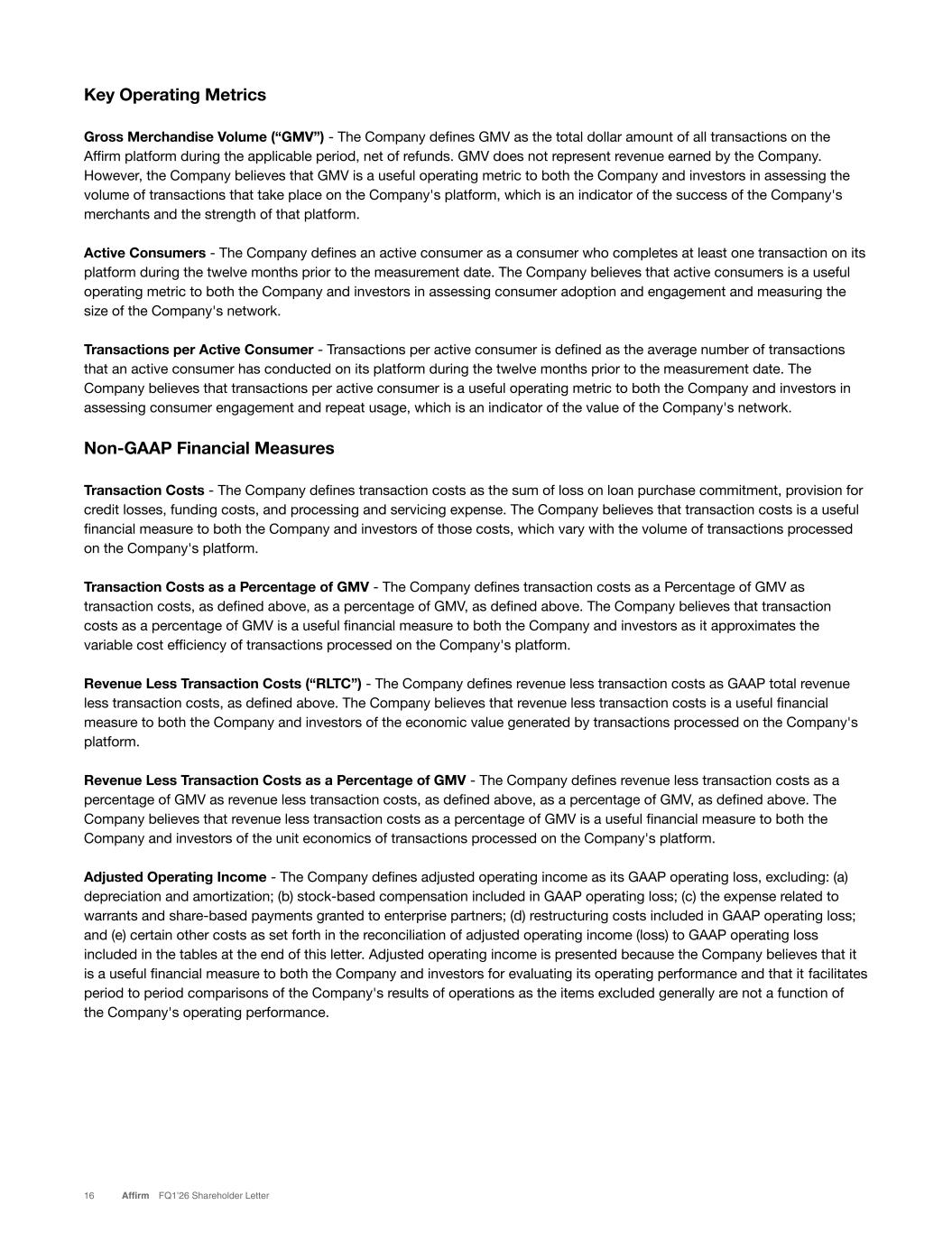 Key Operating Metrics Gross Merchandise Volume (“GMV”) - The Company defines GMV as the total dollar amount of all transactions on the Affirm platform during the applicable period, net of refunds. GMV does not represent revenue earned by the Company. However, the Company believes that GMV is a useful operating metric to both the Company and investors in assessing the volume of transactions that take place on the Company's platform, which is an indicator of the success of the Company's merchants and the strength of that platform. Active Consumers - The Company defines an active consumer as a consumer who completes at least one transaction on its platform during the twelve months prior to the measurement date. The Company believes that active consumers is a useful operating metric to both the Company and investors in assessing consumer adoption and engagement and measuring the size of the Company's network. Transactions per Active Consumer - Transactions per active consumer is defined as the average number of transactions that an active consumer has conducted on its platform during the twelve months prior to the measurement date. The Company believes that transactions per active consumer is a useful operating metric to both the Company and investors in assessing consumer engagement and repeat usage, which is an indicator of the value of the Company's network. Non-GAAP Financial Measures Transaction Costs - The Company defines transaction costs as the sum of loss on loan purchase commitment, provision for credit losses, funding costs, and processing and servicing expense. The Company believes that transaction costs is a useful financial measure to both the Company and investors of those costs, which vary with the volume of transactions processed on the Company's platform. Transaction Costs as a Percentage of GMV - The Company defines transaction costs as a Percentage of GMV as transaction costs, as defined above, as a percentage of GMV, as defined above. The Company believes that transaction costs as a percentage of GMV is a useful financial measure to both the Company and investors as it approximates the variable cost efficiency of transactions processed on the Company's platform. Revenue Less Transaction Costs (“RLTC”) - The Company defines revenue less transaction costs as GAAP total revenue less transaction costs, as defined above. The Company believes that revenue less transaction costs is a useful financial measure to both the Company and investors of the economic value generated by transactions processed on the Company's platform. Revenue Less Transaction Costs as a Percentage of GMV - The Company defines revenue less transaction costs as a percentage of GMV as revenue less transaction costs, as defined above, as a percentage of GMV, as defined above. The Company believes that revenue less transaction costs as a percentage of GMV is a useful financial measure to both the Company and investors of the unit economics of transactions processed on the Company's platform. Adjusted Operating Income - The Company defines adjusted operating income as its GAAP operating loss, excluding: (a) depreciation and amortization; (b) stock-based compensation included in GAAP operating loss; (c) the expense related to warrants and share-based payments granted to enterprise partners; (d) restructuring costs included in GAAP operating loss; and (e) certain other costs as set forth in the reconciliation of adjusted operating income (loss) to GAAP operating loss included in the tables at the end of this letter. Adjusted operating income is presented because the Company believes that it is a useful financial measure to both the Company and investors for evaluating its operating performance and that it facilitates period to period comparisons of the Company's results of operations as the items excluded generally are not a function of the Company's operating performance. 16 Affirm FQ1’26 Shareholder Letter