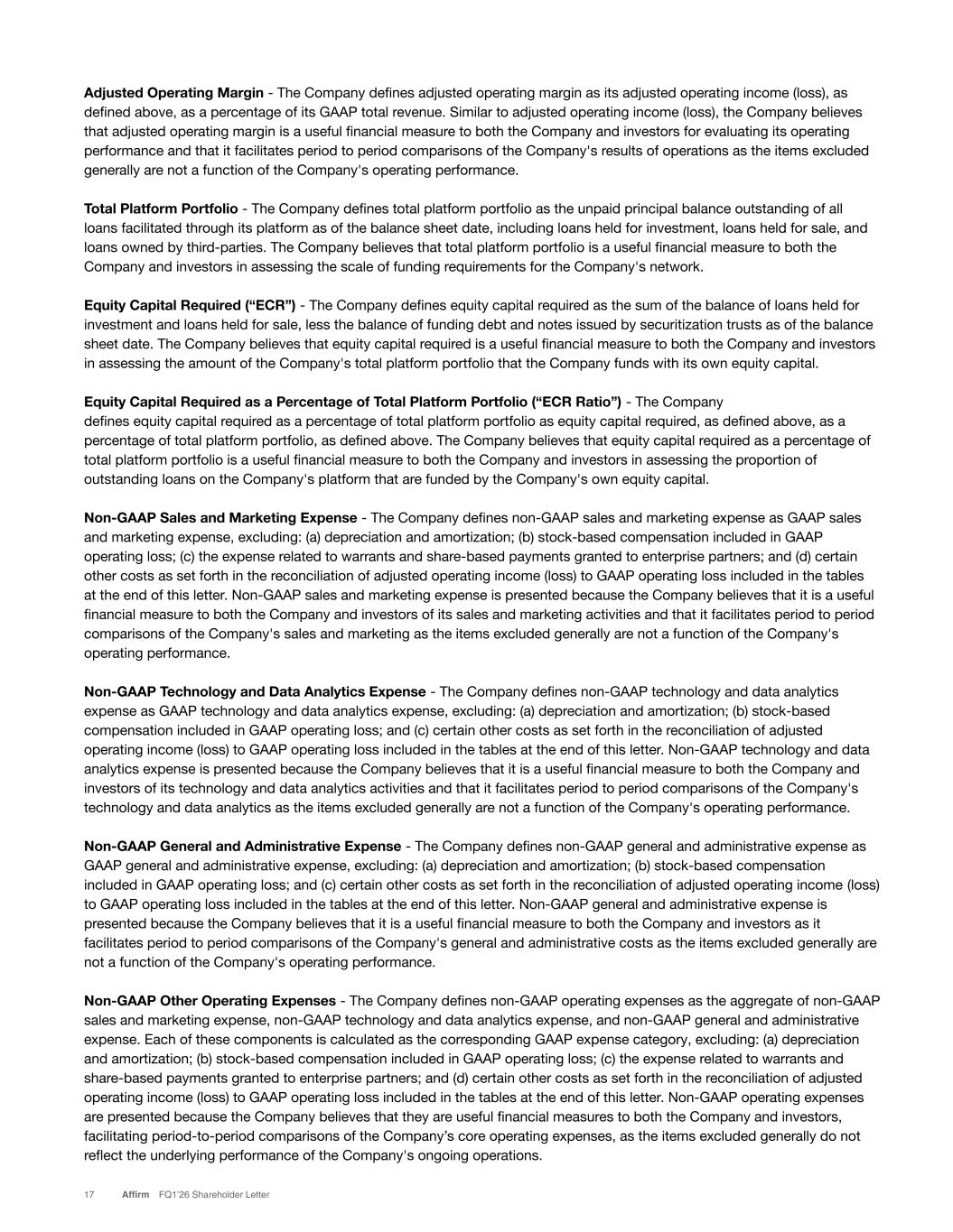 Adjusted Operating Margin - The Company defines adjusted operating margin as its adjusted operating income (loss), as defined above, as a percentage of its GAAP total revenue. Similar to adjusted operating income (loss), the Company believes that adjusted operating margin is a useful financial measure to both the Company and investors for evaluating its operating performance and that it facilitates period to period comparisons of the Company's results of operations as the items excluded generally are not a function of the Company's operating performance. Total Platform Portfolio - The Company defines total platform portfolio as the unpaid principal balance outstanding of all loans facilitated through its platform as of the balance sheet date, including loans held for investment, loans held for sale, and loans owned by third-parties. The Company believes that total platform portfolio is a useful financial measure to both the Company and investors in assessing the scale of funding requirements for the Company's network. Equity Capital Required (“ECR”) - The Company defines equity capital required as the sum of the balance of loans held for investment and loans held for sale, less the balance of funding debt and notes issued by securitization trusts as of the balance sheet date. The Company believes that equity capital required is a useful financial measure to both the Company and investors in assessing the amount of the Company's total platform portfolio that the Company funds with its own equity capital. Equity Capital Required as a Percentage of Total Platform Portfolio (“ECR Ratio”) - The Company defines equity capital required as a percentage of total platform portfolio as equity capital required, as defined above, as a percentage of total platform portfolio, as defined above. The Company believes that equity capital required as a percentage of total platform portfolio is a useful financial measure to both the Company and investors in assessing the proportion of outstanding loans on the Company's platform that are funded by the Company's own equity capital. Non-GAAP Sales and Marketing Expense - The Company defines non-GAAP sales and marketing expense as GAAP sales and marketing expense, excluding: (a) depreciation and amortization; (b) stock-based compensation included in GAAP operating loss; (c) the expense related to warrants and share-based payments granted to enterprise partners; and (d) certain other costs as set forth in the reconciliation of adjusted operating income (loss) to GAAP operating loss included in the tables at the end of this letter. Non-GAAP sales and marketing expense is presented because the Company believes that it is a useful financial measure to both the Company and investors of its sales and marketing activities and that it facilitates period to period comparisons of the Company's sales and marketing as the items excluded generally are not a function of the Company's operating performance. Non-GAAP Technology and Data Analytics Expense - The Company defines non-GAAP technology and data analytics expense as GAAP technology and data analytics expense, excluding: (a) depreciation and amortization; (b) stock-based compensation included in GAAP operating loss; and (c) certain other costs as set forth in the reconciliation of adjusted operating income (loss) to GAAP operating loss included in the tables at the end of this letter. Non-GAAP technology and data analytics expense is presented because the Company believes that it is a useful financial measure to both the Company and investors of its technology and data analytics activities and that it facilitates period to period comparisons of the Company's technology and data analytics as the items excluded generally are not a function of the Company's operating performance. Non-GAAP General and Administrative Expense - The Company defines non-GAAP general and administrative expense as GAAP general and administrative expense, excluding: (a) depreciation and amortization; (b) stock-based compensation included in GAAP operating loss; and (c) certain other costs as set forth in the reconciliation of adjusted operating income (loss) to GAAP operating loss included in the tables at the end of this letter. Non-GAAP general and administrative expense is presented because the Company believes that it is a useful financial measure to both the Company and investors as it facilitates period to period comparisons of the Company's general and administrative costs as the items excluded generally are not a function of the Company's operating performance. Non-GAAP Other Operating Expenses - The Company defines non-GAAP operating expenses as the aggregate of non-GAAP sales and marketing expense, non-GAAP technology and data analytics expense, and non-GAAP general and administrative expense. Each of these components is calculated as the corresponding GAAP expense category, excluding: (a) depreciation and amortization; (b) stock-based compensation included in GAAP operating loss; (c) the expense related to warrants and share-based payments granted to enterprise partners; and (d) certain other costs as set forth in the reconciliation of adjusted operating income (loss) to GAAP operating loss included in the tables at the end of this letter. Non-GAAP operating expenses are presented because the Company believes that they are useful financial measures to both the Company and investors, facilitating period-to-period comparisons of the Company’s core operating expenses, as the items excluded generally do not reflect the underlying performance of the Company's ongoing operations. 17 Affirm FQ1’26 Shareholder Letter