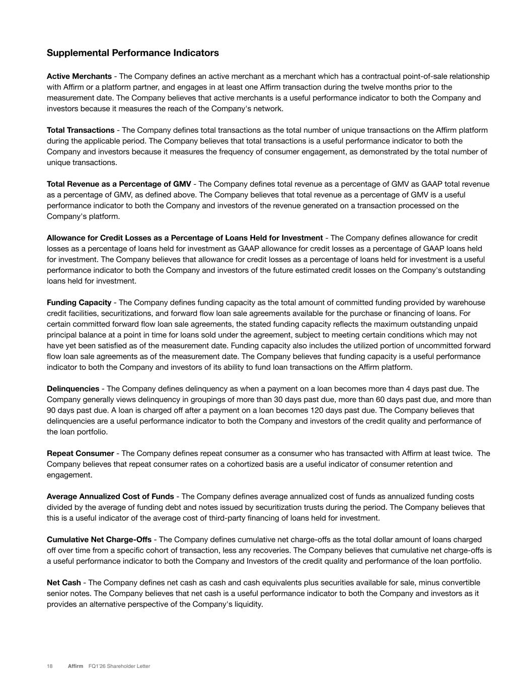 Supplemental Performance Indicators Active Merchants - The Company defines an active merchant as a merchant which has a contractual point-of-sale relationship with Affirm or a platform partner, and engages in at least one Affirm transaction during the twelve months prior to the measurement date. The Company believes that active merchants is a useful performance indicator to both the Company and investors because it measures the reach of the Company's network. Total Transactions - The Company defines total transactions as the total number of unique transactions on the Affirm platform during the applicable period. The Company believes that total transactions is a useful performance indicator to both the Company and investors because it measures the frequency of consumer engagement, as demonstrated by the total number of unique transactions. Total Revenue as a Percentage of GMV - The Company defines total revenue as a percentage of GMV as GAAP total revenue as a percentage of GMV, as defined above. The Company believes that total revenue as a percentage of GMV is a useful performance indicator to both the Company and investors of the revenue generated on a transaction processed on the Company's platform. Allowance for Credit Losses as a Percentage of Loans Held for Investment - The Company defines allowance for credit losses as a percentage of loans held for investment as GAAP allowance for credit losses as a percentage of GAAP loans held for investment. The Company believes that allowance for credit losses as a percentage of loans held for investment is a useful performance indicator to both the Company and investors of the future estimated credit losses on the Company's outstanding loans held for investment. Funding Capacity - The Company defines funding capacity as the total amount of committed funding provided by warehouse credit facilities, securitizations, and forward flow loan sale agreements available for the purchase or financing of loans. For certain committed forward flow loan sale agreements, the stated funding capacity reflects the maximum outstanding unpaid principal balance at a point in time for loans sold under the agreement, subject to meeting certain conditions which may not have yet been satisfied as of the measurement date. Funding capacity also includes the utilized portion of uncommitted forward flow loan sale agreements as of the measurement date. The Company believes that funding capacity is a useful performance indicator to both the Company and investors of its ability to fund loan transactions on the Affirm platform. Delinquencies - The Company defines delinquency as when a payment on a loan becomes more than 4 days past due. The Company generally views delinquency in groupings of more than 30 days past due, more than 60 days past due, and more than 90 days past due. A loan is charged off after a payment on a loan becomes 120 days past due. The Company believes that delinquencies are a useful performance indicator to both the Company and investors of the credit quality and performance of the loan portfolio. Repeat Consumer - The Company defines repeat consumer as a consumer who has transacted with Affirm at least twice. The Company believes that repeat consumer rates on a cohortized basis are a useful indicator of consumer retention and engagement. Average Annualized Cost of Funds - The Company defines average annualized cost of funds as annualized funding costs divided by the average of funding debt and notes issued by securitization trusts during the period. The Company believes that this is a useful indicator of the average cost of third-party financing of loans held for investment. Cumulative Net Charge-Offs - The Company defines cumulative net charge-offs as the total dollar amount of loans charged off over time from a specific cohort of transaction, less any recoveries. The Company believes that cumulative net charge-offs is a useful performance indicator to both the Company and Investors of the credit quality and performance of the loan portfolio. Net Cash - The Company defines net cash as cash and cash equivalents plus securities available for sale, minus convertible senior notes. The Company believes that net cash is a useful performance indicator to both the Company and investors as it provides an alternative perspective of the Company's liquidity. 18 Affirm FQ1’26 Shareholder Letter