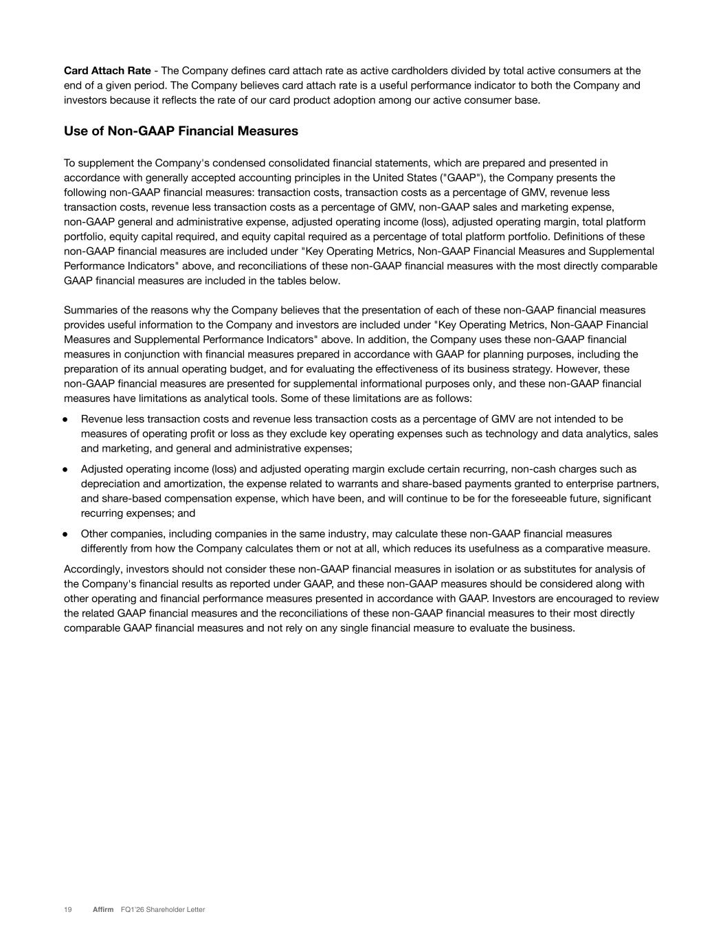 Card Attach Rate - The Company defines card attach rate as active cardholders divided by total active consumers at the end of a given period. The Company believes card attach rate is a useful performance indicator to both the Company and investors because it reflects the rate of our card product adoption among our active consumer base. Use of Non-GAAP Financial Measures To supplement the Company's condensed consolidated financial statements, which are prepared and presented in accordance with generally accepted accounting principles in the United States ("GAAP"), the Company presents the following non-GAAP financial measures: transaction costs, transaction costs as a percentage of GMV, revenue less transaction costs, revenue less transaction costs as a percentage of GMV, non-GAAP sales and marketing expense, non-GAAP general and administrative expense, adjusted operating income (loss), adjusted operating margin, total platform portfolio, equity capital required, and equity capital required as a percentage of total platform portfolio. Definitions of these non-GAAP financial measures are included under "Key Operating Metrics, Non-GAAP Financial Measures and Supplemental Performance Indicators" above, and reconciliations of these non-GAAP financial measures with the most directly comparable GAAP financial measures are included in the tables below. Summaries of the reasons why the Company believes that the presentation of each of these non-GAAP financial measures provides useful information to the Company and investors are included under "Key Operating Metrics, Non-GAAP Financial Measures and Supplemental Performance Indicators" above. In addition, the Company uses these non-GAAP financial measures in conjunction with financial measures prepared in accordance with GAAP for planning purposes, including the preparation of its annual operating budget, and for evaluating the effectiveness of its business strategy. However, these non-GAAP financial measures are presented for supplemental informational purposes only, and these non-GAAP financial measures have limitations as analytical tools. Some of these limitations are as follows: ● Revenue less transaction costs and revenue less transaction costs as a percentage of GMV are not intended to be measures of operating profit or loss as they exclude key operating expenses such as technology and data analytics, sales and marketing, and general and administrative expenses; ● Adjusted operating income (loss) and adjusted operating margin exclude certain recurring, non-cash charges such as depreciation and amortization, the expense related to warrants and share-based payments granted to enterprise partners, and share-based compensation expense, which have been, and will continue to be for the foreseeable future, significant recurring expenses; and ● Other companies, including companies in the same industry, may calculate these non-GAAP financial measures differently from how the Company calculates them or not at all, which reduces its usefulness as a comparative measure. Accordingly, investors should not consider these non-GAAP financial measures in isolation or as substitutes for analysis of the Company's financial results as reported under GAAP, and these non-GAAP measures should be considered along with other operating and financial performance measures presented in accordance with GAAP. Investors are encouraged to review the related GAAP financial measures and the reconciliations of these non-GAAP financial measures to their most directly comparable GAAP financial measures and not rely on any single financial measure to evaluate the business. 19 Affirm FQ1’26 Shareholder Letter