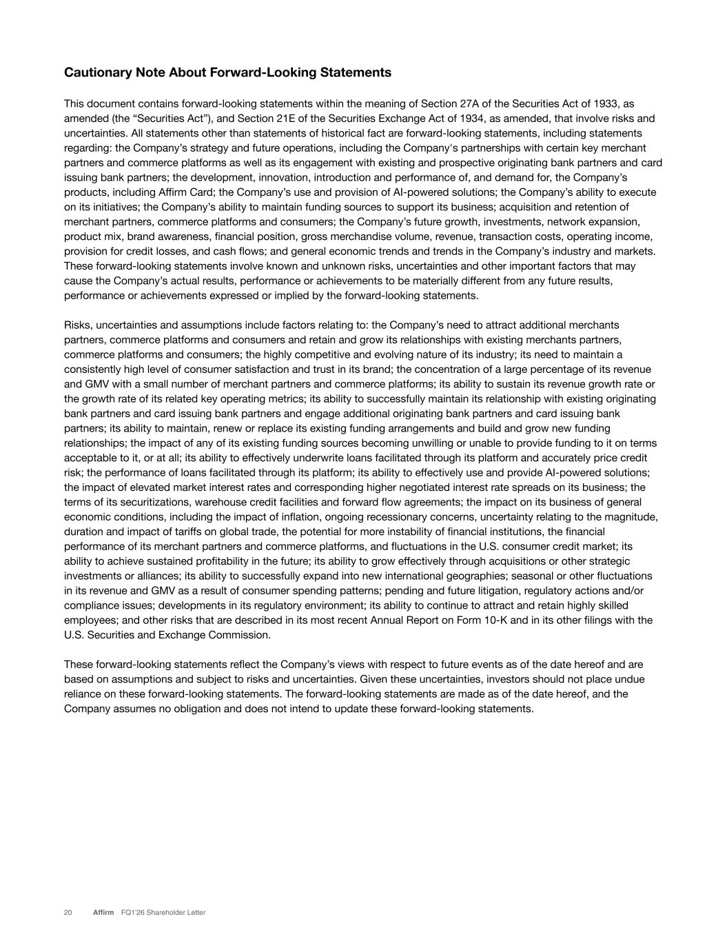 Cautionary Note About Forward-Looking Statements This document contains forward-looking statements within the meaning of Section 27A of the Securities Act of 1933, as amended (the “Securities Act”), and Section 21E of the Securities Exchange Act of 1934, as amended, that involve risks and uncertainties. All statements other than statements of historical fact are forward-looking statements, including statements regarding: the Company’s strategy and future operations, including the Company's partnerships with certain key merchant partners and commerce platforms as well as its engagement with existing and prospective originating bank partners and card issuing bank partners; the development, innovation, introduction and performance of, and demand for, the Company’s products, including Affirm Card; the Company’s use and provision of AI-powered solutions; the Company’s ability to execute on its initiatives; the Company’s ability to maintain funding sources to support its business; acquisition and retention of merchant partners, commerce platforms and consumers; the Company’s future growth, investments, network expansion, product mix, brand awareness, financial position, gross merchandise volume, revenue, transaction costs, operating income, provision for credit losses, and cash flows; and general economic trends and trends in the Company’s industry and markets. These forward-looking statements involve known and unknown risks, uncertainties and other important factors that may cause the Company’s actual results, performance or achievements to be materially different from any future results, performance or achievements expressed or implied by the forward-looking statements. Risks, uncertainties and assumptions include factors relating to: the Company’s need to attract additional merchants partners, commerce platforms and consumers and retain and grow its relationships with existing merchants partners, commerce platforms and consumers; the highly competitive and evolving nature of its industry; its need to maintain a consistently high level of consumer satisfaction and trust in its brand; the concentration of a large percentage of its revenue and GMV with a small number of merchant partners and commerce platforms; its ability to sustain its revenue growth rate or the growth rate of its related key operating metrics; its ability to successfully maintain its relationship with existing originating bank partners and card issuing bank partners and engage additional originating bank partners and card issuing bank partners; its ability to maintain, renew or replace its existing funding arrangements and build and grow new funding relationships; the impact of any of its existing funding sources becoming unwilling or unable to provide funding to it on terms acceptable to it, or at all; its ability to effectively underwrite loans facilitated through its platform and accurately price credit risk; the performance of loans facilitated through its platform; its ability to effectively use and provide AI-powered solutions; the impact of elevated market interest rates and corresponding higher negotiated interest rate spreads on its business; the terms of its securitizations, warehouse credit facilities and forward flow agreements; the impact on its business of general economic conditions, including the impact of inflation, ongoing recessionary concerns, uncertainty relating to the magnitude, duration and impact of tariffs on global trade, the potential for more instability of financial institutions, the financial performance of its merchant partners and commerce platforms, and fluctuations in the U.S. consumer credit market; its ability to achieve sustained profitability in the future; its ability to grow effectively through acquisitions or other strategic investments or alliances; its ability to successfully expand into new international geographies; seasonal or other fluctuations in its revenue and GMV as a result of consumer spending patterns; pending and future litigation, regulatory actions and/or compliance issues; developments in its regulatory environment; its ability to continue to attract and retain highly skilled employees; and other risks that are described in its most recent Annual Report on Form 10-K and in its other filings with the U.S. Securities and Exchange Commission. These forward-looking statements reflect the Company’s views with respect to future events as of the date hereof and are based on assumptions and subject to risks and uncertainties. Given these uncertainties, investors should not place undue reliance on these forward-looking statements. The forward-looking statements are made as of the date hereof, and the Company assumes no obligation and does not intend to update these forward-looking statements. 20 Affirm FQ1’26 Shareholder Letter