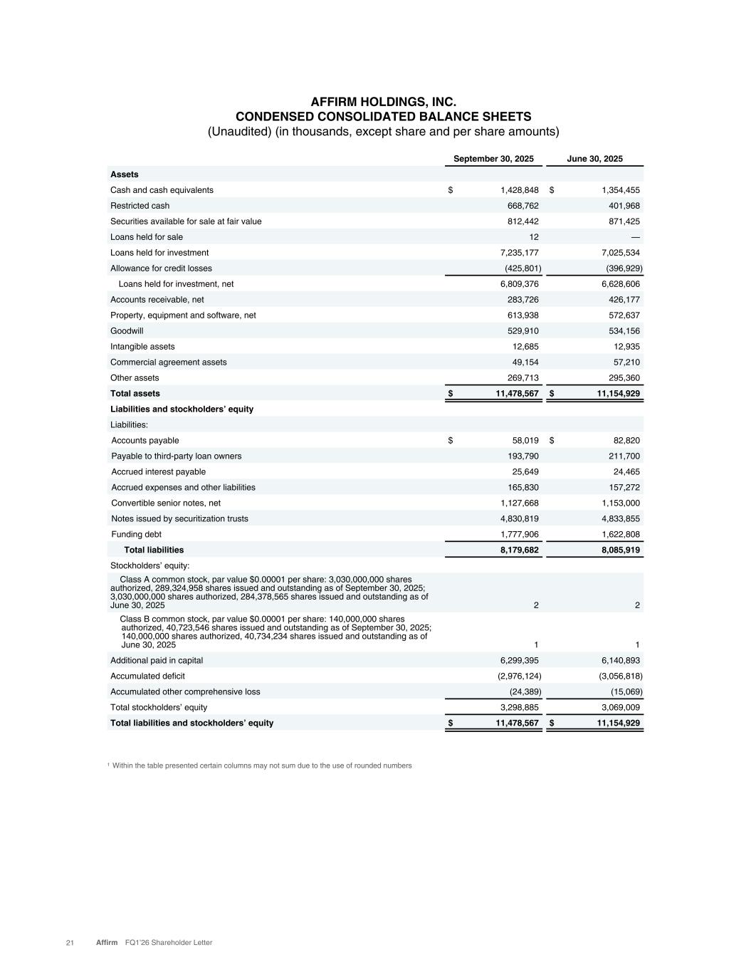 September 30, 2025 June 30, 2025 Assets Cash and cash equivalents $ 1,428,848 $ 1,354,455 Restricted cash 668,762 401,968 Securities available for sale at fair value 812,442 871,425 Loans held for sale 12 — Loans held for investment 7,235,177 7,025,534 Allowance for credit losses (425,801) (396,929) Loans held for investment, net 6,809,376 6,628,606 Accounts receivable, net 283,726 426,177 Property, equipment and software, net 613,938 572,637 Goodwill 529,910 534,156 Intangible assets 12,685 12,935 Commercial agreement assets 49,154 57,210 Other assets 269,713 295,360 Total assets $ 11,478,567 $ 11,154,929 Liabilities and stockholders’ equity Liabilities: Accounts payable $ 58,019 $ 82,820 Payable to third-party loan owners 193,790 211,700 Accrued interest payable 25,649 24,465 Accrued expenses and other liabilities 165,830 157,272 Convertible senior notes, net 1,127,668 1,153,000 Notes issued by securitization trusts 4,830,819 4,833,855 Funding debt 1,777,906 1,622,808 Total liabilities 8,179,682 8,085,919 Stockholders’ equity: Class A common stock, par value $0.00001 per share: 3,030,000,000 shares authorized, 289,324,958 shares issued and outstanding as of September 30, 2025; 3,030,000,000 shares authorized, 284,378,565 shares issued and outstanding as of June 30, 2025 2 2 Class B common stock, par value $0.00001 per share: 140,000,000 shares authorized, 40,723,546 shares issued and outstanding as of September 30, 2025; 140,000,000 shares authorized, 40,734,234 shares issued and outstanding as of June 30, 2025 1 1 Additional paid in capital 6,299,395 6,140,893 Accumulated deficit (2,976,124) (3,056,818) Accumulated other comprehensive loss (24,389) (15,069) Total stockholders’ equity 3,298,885 3,069,009 Total liabilities and stockholders’ equity $ 11,478,567 $ 11,154,929 AFFIRM HOLDINGS, INC. CONDENSED CONSOLIDATED BALANCE SHEETS (Unaudited) (in thousands, except share and per share amounts) 1 Within the table presented certain columns may not sum due to the use of rounded numbers 21 Affirm FQ1’26 Shareholder Letter