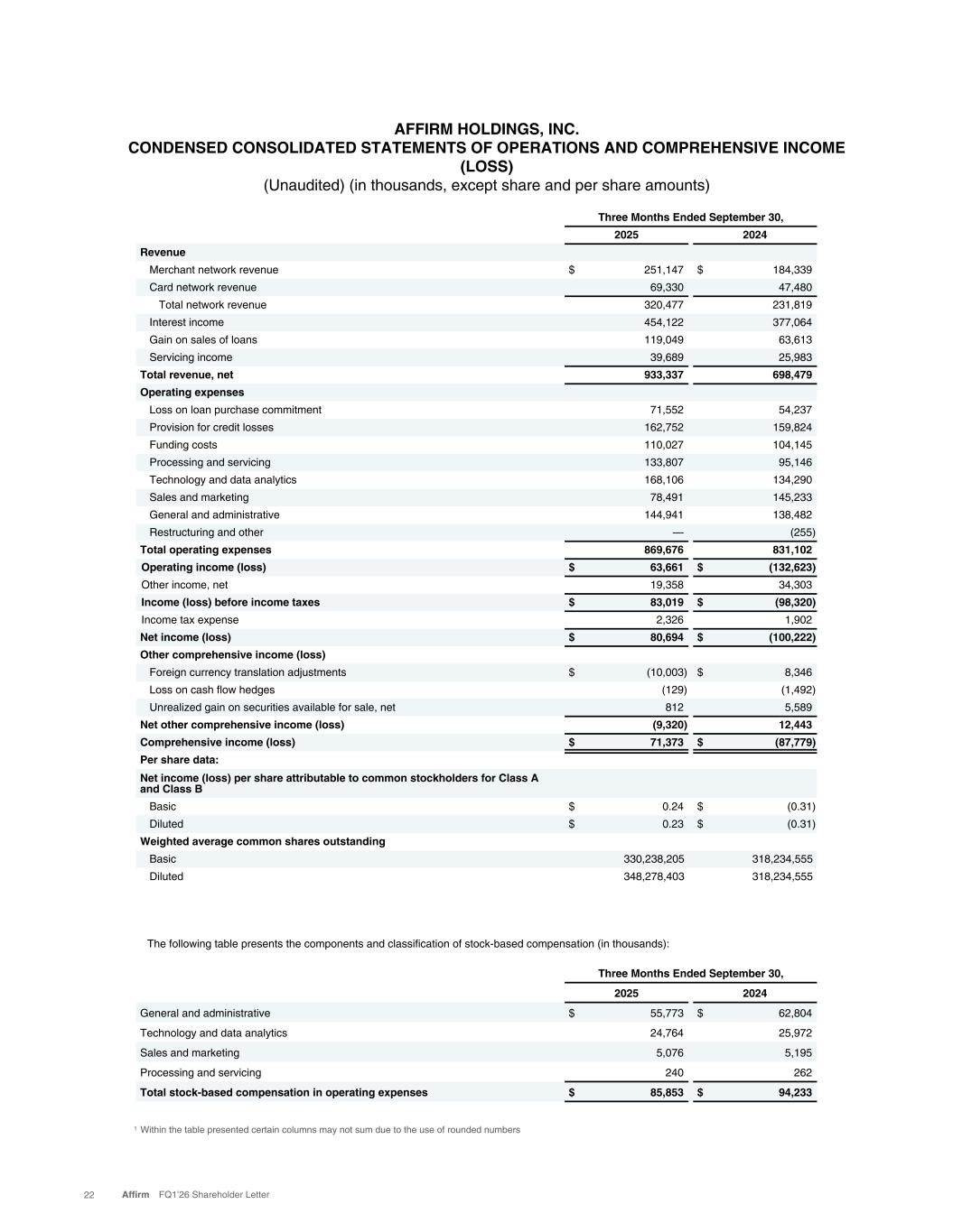 AFFIRM HOLDINGS, INC. CONDENSED CONSOLIDATED STATEMENTS OF OPERATIONS AND COMPREHENSIVE INCOME (LOSS) (Unaudited) (in thousands, except share and per share amounts) Three Months Ended September 30, 2025 2024 Revenue Merchant network revenue $ 251,147 $ 184,339 Card network revenue 69,330 47,480 Total network revenue 320,477 231,819 Interest income 454,122 377,064 Gain on sales of loans 119,049 63,613 Servicing income 39,689 25,983 Total revenue, net 933,337 698,479 Operating expenses Loss on loan purchase commitment 71,552 54,237 Provision for credit losses 162,752 159,824 Funding costs 110,027 104,145 Processing and servicing 133,807 95,146 Technology and data analytics 168,106 134,290 Sales and marketing 78,491 145,233 General and administrative 144,941 138,482 Restructuring and other — (255) Total operating expenses 869,676 831,102 Operating income (loss) $ 63,661 $ (132,623) Other income, net 19,358 34,303 Income (loss) before income taxes $ 83,019 $ (98,320) Income tax expense 2,326 1,902 Net income (loss) $ 80,694 $ (100,222) Other comprehensive income (loss) Foreign currency translation adjustments $ (10,003) $ 8,346 Loss on cash flow hedges (129) (1,492) Unrealized gain on securities available for sale, net 812 5,589 Net other comprehensive income (loss) (9,320) 12,443 Comprehensive income (loss) $ 71,373 $ (87,779) Per share data: Net income (loss) per share attributable to common stockholders for Class A and Class B Basic $ 0.24 $ (0.31) Diluted $ 0.23 $ (0.31) Weighted average common shares outstanding Basic 330,238,205 318,234,555 Diluted 348,278,403 318,234,555 Three Months Ended September 30, 2025 2024 General and administrative $ 55,773 $ 62,804 Technology and data analytics 24,764 25,972 Sales and marketing 5,076 5,195 Processing and servicing 240 262 Total stock-based compensation in operating expenses $ 85,853 $ 94,233 The following table presents the components and classification of stock-based compensation (in thousands): 1 Within the table presented certain columns may not sum due to the use of rounded numbers 22 Affirm FQ1’26 Shareholder Letter