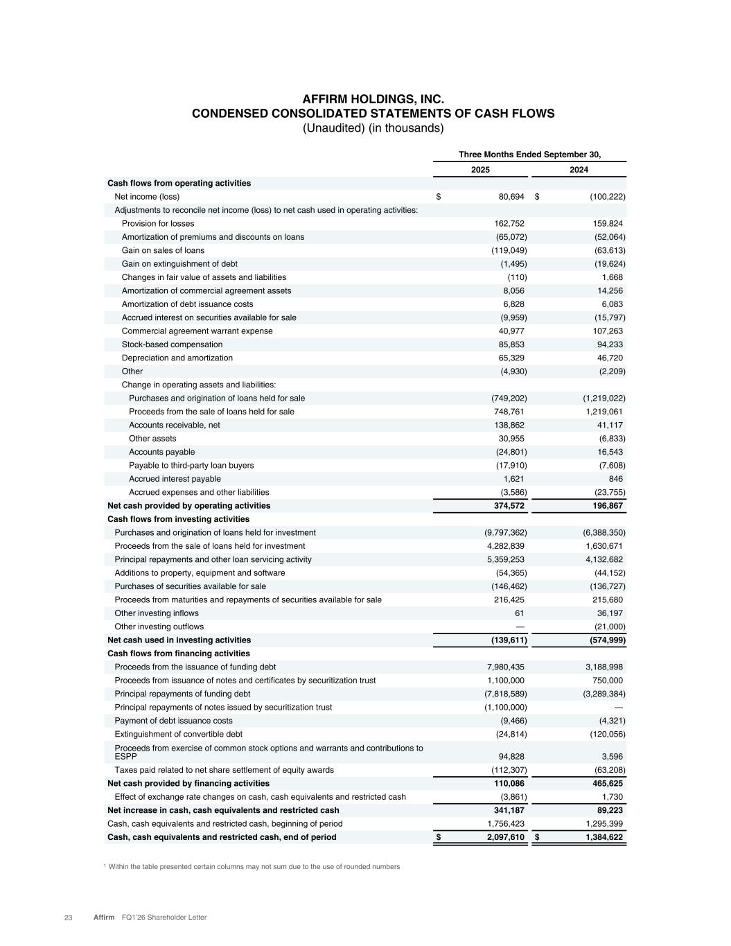AFFIRM HOLDINGS, INC. CONDENSED CONSOLIDATED STATEMENTS OF CASH FLOWS (Unaudited) (in thousands) Three Months Ended September 30, 2025 2024 Cash flows from operating activities Net income (loss) $ 80,694 $ (100,222) Adjustments to reconcile net income (loss) to net cash used in operating activities: Provision for losses 162,752 159,824 Amortization of premiums and discounts on loans (65,072) (52,064) Gain on sales of loans (119,049) (63,613) Gain on extinguishment of debt (1,495) (19,624) Changes in fair value of assets and liabilities (110) 1,668 Amortization of commercial agreement assets 8,056 14,256 Amortization of debt issuance costs 6,828 6,083 Accrued interest on securities available for sale (9,959) (15,797) Commercial agreement warrant expense 40,977 107,263 Stock-based compensation 85,853 94,233 Depreciation and amortization 65,329 46,720 Other (4,930) (2,209) Change in operating assets and liabilities: Purchases and origination of loans held for sale (749,202) (1,219,022) Proceeds from the sale of loans held for sale 748,761 1,219,061 Accounts receivable, net 138,862 41,117 Other assets 30,955 (6,833) Accounts payable (24,801) 16,543 Payable to third-party loan buyers (17,910) (7,608) Accrued interest payable 1,621 846 Accrued expenses and other liabilities (3,586) (23,755) Net cash provided by operating activities 374,572 196,867 Cash flows from investing activities Purchases and origination of loans held for investment (9,797,362) (6,388,350) Proceeds from the sale of loans held for investment 4,282,839 1,630,671 Principal repayments and other loan servicing activity 5,359,253 4,132,682 Additions to property, equipment and software (54,365) (44,152) Purchases of securities available for sale (146,462) (136,727) Proceeds from maturities and repayments of securities available for sale 216,425 215,680 Other investing inflows 61 36,197 Other investing outflows — (21,000) Net cash used in investing activities (139,611) (574,999) Cash flows from financing activities Proceeds from the issuance of funding debt 7,980,435 3,188,998 Proceeds from issuance of notes and certificates by securitization trust 1,100,000 750,000 Principal repayments of funding debt (7,818,589) (3,289,384) Principal repayments of notes issued by securitization trust (1,100,000) — Payment of debt issuance costs (9,466) (4,321) Extinguishment of convertible debt (24,814) (120,056) Proceeds from exercise of common stock options and warrants and contributions to ESPP 94,828 3,596 Taxes paid related to net share settlement of equity awards (112,307) (63,208) Net cash provided by financing activities 110,086 465,625 Effect of exchange rate changes on cash, cash equivalents and restricted cash (3,861) 1,730 Net increase in cash, cash equivalents and restricted cash 341,187 89,223 Cash, cash equivalents and restricted cash, beginning of period 1,756,423 1,295,399 Cash, cash equivalents and restricted cash, end of period $ 2,097,610 $ 1,384,622 1 Within the table presented certain columns may not sum due to the use of rounded numbers 23 Affirm FQ1’26 Shareholder Letter
