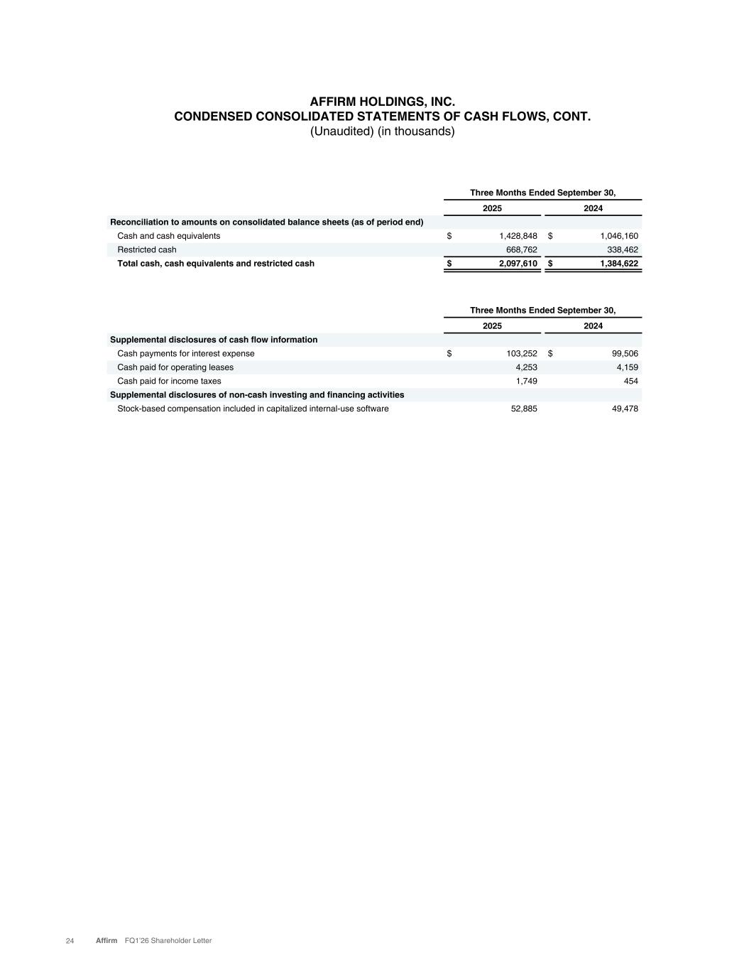 AFFIRM HOLDINGS, INC. CONDENSED CONSOLIDATED STATEMENTS OF CASH FLOWS, CONT. (Unaudited) (in thousands) Three Months Ended September 30, 2025 2024 Supplemental disclosures of cash flow information Cash payments for interest expense $ 103,252 $ 99,506 Cash paid for operating leases 4,253 4,159 Cash paid for income taxes 1,749 454 Supplemental disclosures of non-cash investing and financing activities Stock-based compensation included in capitalized internal-use software 52,885 49,478 Three Months Ended September 30, 2025 2024 Reconciliation to amounts on consolidated balance sheets (as of period end) Cash and cash equivalents $ 1,428,848 $ 1,046,160 Restricted cash 668,762 338,462 Total cash, cash equivalents and restricted cash $ 2,097,610 $ 1,384,622 24 Affirm FQ1’26 Shareholder Letter