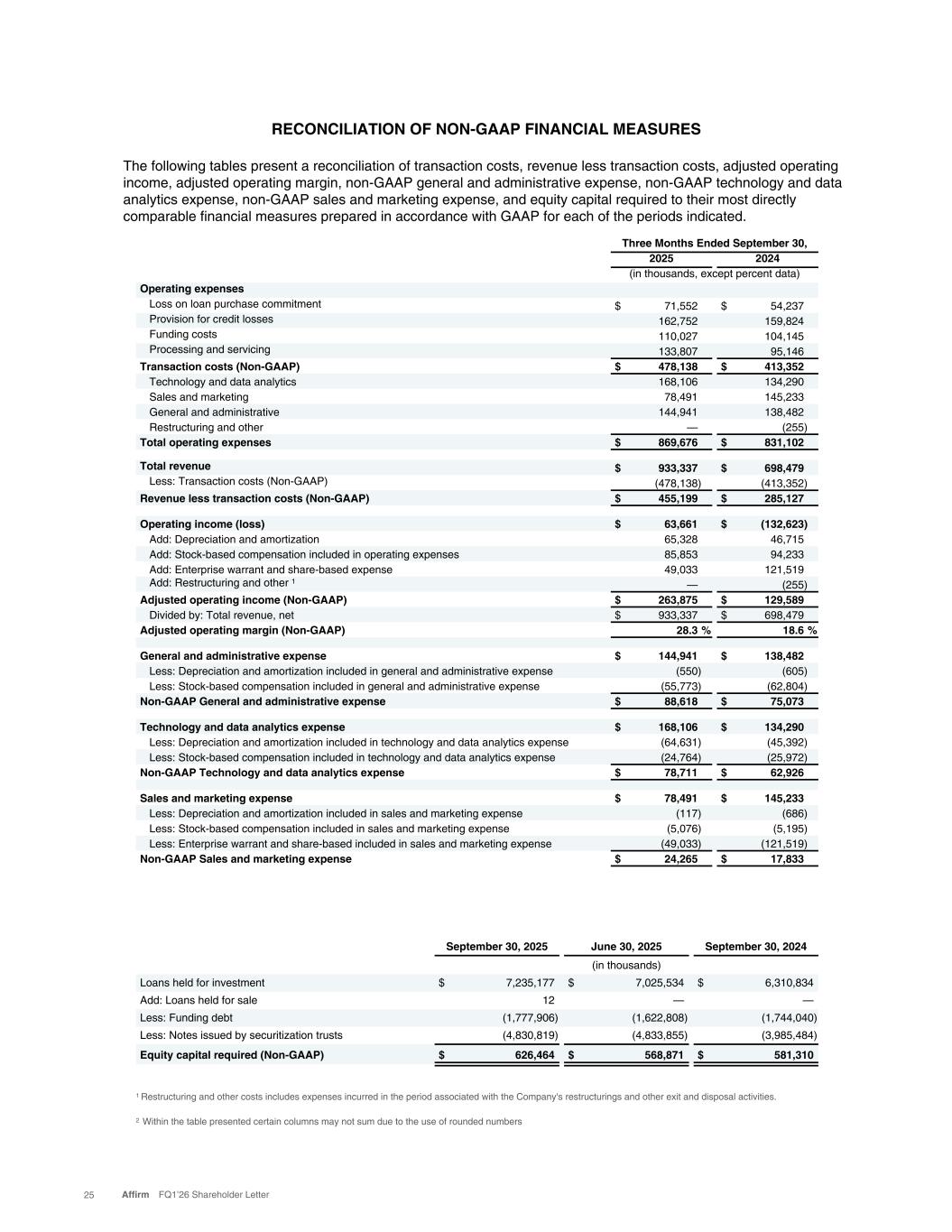 RECONCILIATION OF NON-GAAP FINANCIAL MEASURES The following tables present a reconciliation of transaction costs, revenue less transaction costs, adjusted operating income, adjusted operating margin, non-GAAP general and administrative expense, non-GAAP technology and data analytics expense, non-GAAP sales and marketing expense, and equity capital required to their most directly comparable financial measures prepared in accordance with GAAP for each of the periods indicated. Three Months Ended September 30, 2025 2024 (in thousands, except percent data) Operating expenses Loss on loan purchase commitment $ 71,552 $ 54,237 Provision for credit losses 162,752 159,824 Funding costs 110,027 104,145 Processing and servicing 133,807 95,146 Transaction costs (Non-GAAP) $ 478,138 $ 413,352 Technology and data analytics 168,106 134,290 Sales and marketing 78,491 145,233 General and administrative 144,941 138,482 Restructuring and other — (255) Total operating expenses $ 869,676 $ 831,102 Total revenue $ 933,337 $ 698,479 Less: Transaction costs (Non-GAAP) (478,138) (413,352) Revenue less transaction costs (Non-GAAP) $ 455,199 $ 285,127 Operating income (loss) $ 63,661 $ (132,623) Add: Depreciation and amortization 65,328 46,715 Add: Stock-based compensation included in operating expenses 85,853 94,233 Add: Enterprise warrant and share-based expense 49,033 121,519 Add: Restructuring and other 1 — (255) Adjusted operating income (Non-GAAP) $ 263,875 $ 129,589 Divided by: Total revenue, net $ 933,337 $ 698,479 Adjusted operating margin (Non-GAAP) 28.3 % 18.6 % General and administrative expense $ 144,941 $ 138,482 Less: Depreciation and amortization included in general and administrative expense (550) (605) Less: Stock-based compensation included in general and administrative expense (55,773) (62,804) Non-GAAP General and administrative expense $ 88,618 $ 75,073 Technology and data analytics expense $ 168,106 $ 134,290 Less: Depreciation and amortization included in technology and data analytics expense (64,631) (45,392) Less: Stock-based compensation included in technology and data analytics expense (24,764) (25,972) Non-GAAP Technology and data analytics expense $ 78,711 $ 62,926 Sales and marketing expense $ 78,491 $ 145,233 Less: Depreciation and amortization included in sales and marketing expense (117) (686) Less: Stock-based compensation included in sales and marketing expense (5,076) (5,195) Less: Enterprise warrant and share-based included in sales and marketing expense (49,033) (121,519) Non-GAAP Sales and marketing expense $ 24,265 $ 17,833 September 30, 2025 June 30, 2025 September 30, 2024 (in thousands) Loans held for investment $ 7,235,177 $ 7,025,534 $ 6,310,834 Add: Loans held for sale 12 — — Less: Funding debt (1,777,906) (1,622,808) (1,744,040) Less: Notes issued by securitization trusts (4,830,819) (4,833,855) (3,985,484) Equity capital required (Non-GAAP) $ 626,464 $ 568,871 $ 581,310 1 Restructuring and other costs includes expenses incurred in the period associated with the Company's restructurings and other exit and disposal activities. 2 Within the table presented certain columns may not sum due to the use of rounded numbers 25 Affirm FQ1’26 Shareholder Letter