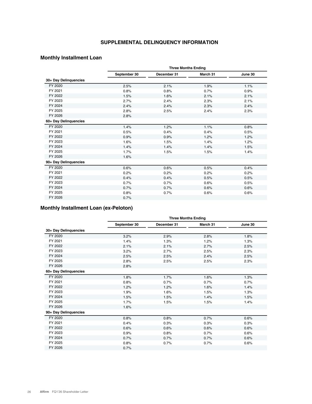 SUPPLEMENTAL DELINQUENCY INFORMATION Three Months Ending September 30 December 31 March 31 June 30 30+ Day Delinquencies FY 2020 2.5% 2.1% 1.9% 1.1% FY 2021 0.8% 0.8% 0.7% 0.9% FY 2022 1.5% 1.6% 2.1% 2.1% FY 2023 2.7% 2.4% 2.3% 2.1% FY 2024 2.4% 2.4% 2.3% 2.4% FY 2025 2.8% 2.5% 2.4% 2.3% FY 2026 2.8% 60+ Day Delinquencies FY 2020 1.4% 1.2% 1.1% 0.8% FY 2021 0.5% 0.4% 0.4% 0.5% FY 2022 0.9% 0.9% 1.2% 1.2% FY 2023 1.6% 1.5% 1.4% 1.2% FY 2024 1.4% 1.4% 1.4% 1.5% FY 2025 1.7% 1.5% 1.5% 1.4% FY 2026 1.6% 90+ Day Delinquencies FY 2020 0.6% 0.6% 0.5% 0.4% FY 2021 0.2% 0.2% 0.2% 0.2% FY 2022 0.4% 0.4% 0.5% 0.5% FY 2023 0.7% 0.7% 0.6% 0.5% FY 2024 0.7% 0.7% 0.6% 0.6% FY 2025 0.8% 0.7% 0.6% 0.6% FY 2026 0.7% Three Months Ending September 30 December 31 March 31 June 30 30+ Day Delinquencies FY 2020 3.2% 2.9% 2.8% 1.8% FY 2021 1.4% 1.3% 1.2% 1.3% FY 2022 2.1% 2.1% 2.7% 2.5% FY 2023 3.2% 2.7% 2.5% 2.3% FY 2024 2.5% 2.5% 2.4% 2.5% FY 2025 2.8% 2.5% 2.5% 2.3% FY 2026 2.8% 60+ Day Delinquencies FY 2020 1.8% 1.7% 1.6% 1.3% FY 2021 0.8% 0.7% 0.7% 0.7% FY 2022 1.2% 1.2% 1.6% 1.4% FY 2023 1.9% 1.6% 1.5% 1.3% FY 2024 1.5% 1.5% 1.4% 1.5% FY 2025 1.7% 1.5% 1.5% 1.4% FY 2026 1.6% 90+ Day Delinquencies FY 2020 0.8% 0.8% 0.7% 0.6% FY 2021 0.4% 0.3% 0.3% 0.3% FY 2022 0.6% 0.6% 0.6% 0.6% FY 2023 0.9% 0.8% 0.7% 0.6% FY 2024 0.7% 0.7% 0.7% 0.6% FY 2025 0.8% 0.7% 0.7% 0.6% FY 2026 0.7% Monthly Installment Loan (ex-Peloton) Monthly Installment Loan 26 Affirm FQ1’26 Shareholder Letter