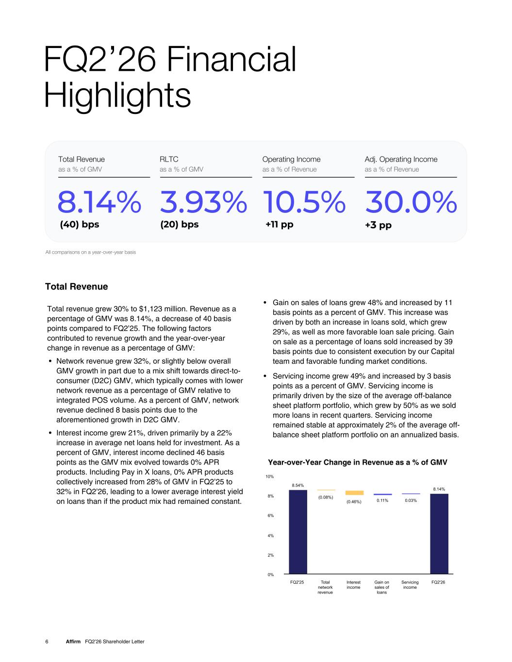 Total revenue grew 30% to $1,123 million. Revenue as a percentage of GMV was 8.14%, a decrease of 40 basis points compared to FQ2’25. The following factors contributed to revenue growth and the year-over-year change in revenue as a percentage of GMV: • Network revenue grew 32%, or slightly below overall GMV growth in part due to a mix shift towards direct-to- consumer (D2C) GMV, which typically comes with lower network revenue as a percentage of GMV relative to integrated POS volume. As a percent of GMV, network revenue declined 8 basis points due to the aforementioned growth in D2C GMV. • Interest income grew 21%, driven primarily by a 22% increase in average net loans held for investment. As a percent of GMV, interest income declined 46 basis points as the GMV mix evolved towards 0% APR products. Including Pay in X loans, 0% APR products collectively increased from 28% of GMV in FQ2’25 to 32% in FQ2’26, leading to a lower average interest yield on loans than if the product mix had remained constant. • Gain on sales of loans grew 48% and increased by 11 basis points as a percent of GMV. This increase was driven by both an increase in loans sold, which grew 29%, as well as more favorable loan sale pricing. Gain on sale as a percentage of loans sold increased by 39 basis points due to consistent execution by our Capital team and favorable funding market conditions. • Servicing income grew 49% and increased by 3 basis points as a percent of GMV. Servicing income is primarily driven by the size of the average off-balance sheet platform portfolio, which grew by 50% as we sold more loans in recent quarters. Servicing income remained stable at approximately 2% of the average off- balance sheet platform portfolio on an annualized basis. FQ2’26 Financial Highlights 6 Affirm FQ2’26 Shareholder Letter Total Revenue Adj. Operating Income as a % of Revenue 27% +4 pp Total Revenue as a % of GMV 8.14% RLTC as a % of GMV 3.93% (20) bps Operating Income as a % of Revenue 10.5% +11 pp All comparisons on a year-over-year basis (40) bps Adj. Operating Income as a % of Revenue 30.0% 3 Year-over-Year Change in Revenue as a % of GMV 8.54% (0.08%) (0.46%) 0.11% 0.03% 8.14% FQ2'25 Total network revenue Interest income Gain on sales of loans Servicing income FQ2'26 0% 2% 4% 6% 8% 10%