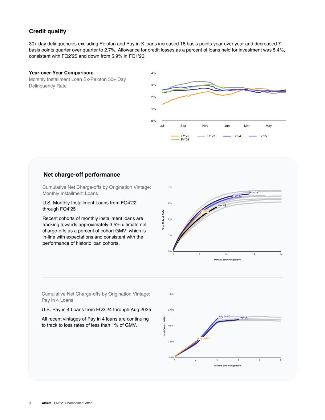 Year-over-Year Comparison: Monthly Installment Loan Ex-Peloton 30+ Day Delinquency Rate 9 Affirm FQ2’26 Shareholder Letter Credit quality 30+ day delinquencies excluding Peloton and Pay in X loans increased 18 basis points year over year and decreased 7 basis points quarter over quarter to 2.7%. Allowance for credit losses as a percent of loans held for investment was 5.4%, consistent with FQ2’25 and down from 5.9% in FQ1'26. FY’22 FY’23 FY’24 FY’25 FY’26 Jul Sep Nov Jan Mar May 0% 1% 2% 3% 4% Cumulative Net Charge-offs by Origination Vintage: Monthly Installment Loans U.S. Monthly Installment Loans from FQ4’22 through FQ4’25 Recent cohorts of monthly installment loans are tracking towards approximately 3.5% ultimate net charge-offs as a percent of cohort GMV, which is in-line with expectations and consistent with the performance of historic loan cohorts. Net charge-off performance Cumulative Net Charge-offs by Origination Vintage: Pay in 4 Loans U.S. Pay in 4 Loans from FQ3’24 through Aug 2025 All recent vintages of Pay in 4 loans are continuing to track to loss rates of less than 1% of GMV.