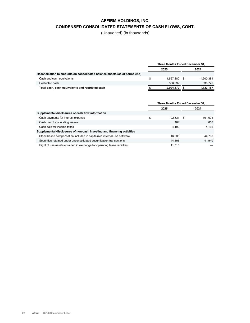 AFFIRM HOLDINGS, INC. CONDENSED CONSOLIDATED STATEMENTS OF CASH FLOWS, CONT. (Unaudited) (in thousands) 22 Affirm FQ2’26 Shareholder Letter Three Months Ended December 31, 2025 2024 Supplemental disclosures of cash flow information Cash payments for interest expense $ 102,537 $ 101,623 Cash paid for operating leases 484 656 Cash paid for income taxes 4,190 4,163 Supplemental disclosures of non-cash investing and financing activities Stock-based compensation included in capitalized internal-use software 46,636 44,708 Securities retained under unconsolidated securitization transactions 44,608 41,940 Right of use assets obtained in exchange for operating lease liabilities 11,513 — Three Months Ended December 31, 2025 2024 Reconciliation to amounts on consolidated balance sheets (as of period end) Cash and cash equivalents $ 1,527,880 $ 1,200,381 Restricted cash 566,692 536,776 Total cash, cash equivalents and restricted cash $ 2,094,572 $ 1,737,157