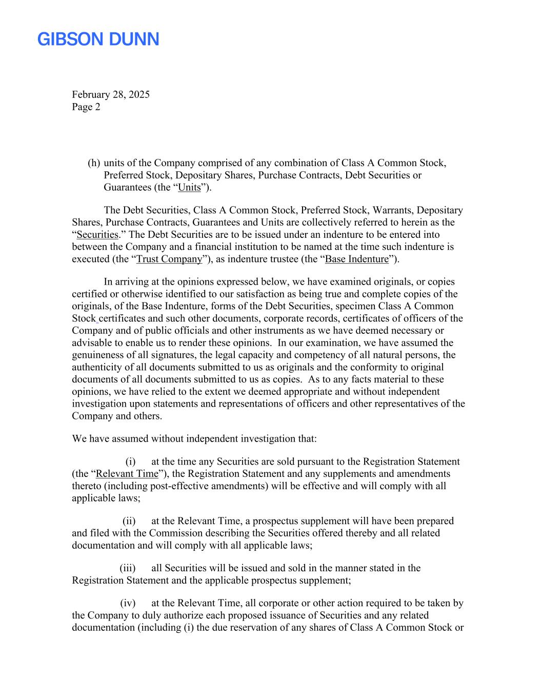 February 28, 2025 Page 2 (h) units of the Company comprised of any combination of Class A Common Stock, Preferred Stock, Depositary Shares, Purchase Contracts, Debt Securities or Guarantees (the “Units”). The Debt Securities, Class A Common Stock, Preferred Stock, Warrants, Depositary Shares, Purchase Contracts, Guarantees and Units are collectively referred to herein as the “Securities.” The Debt Securities are to be issued under an indenture to be entered into between the Company and a financial institution to be named at the time such indenture is executed (the “Trust Company”), as indenture trustee (the “Base Indenture”). In arriving at the opinions expressed below, we have examined originals, or copies certified or otherwise identified to our satisfaction as being true and complete copies of the originals, of the Base Indenture, forms of the Debt Securities, specimen Class A Common Stock certificates and such other documents, corporate records, certificates of officers of the Company and of public officials and other instruments as we have deemed necessary or advisable to enable us to render these opinions. In our examination, we have assumed the genuineness of all signatures, the legal capacity and competency of all natural persons, the authenticity of all documents submitted to us as originals and the conformity to original documents of all documents submitted to us as copies. As to any facts material to these opinions, we have relied to the extent we deemed appropriate and without independent investigation upon statements and representations of officers and other representatives of the Company and others. We have assumed without independent investigation that: (i) at the time any Securities are sold pursuant to the Registration Statement (the “Relevant Time”), the Registration Statement and any supplements and amendments thereto (including post-effective amendments) will be effective and will comply with all applicable laws; (ii) at the Relevant Time, a prospectus supplement will have been prepared and filed with the Commission describing the Securities offered thereby and all related documentation and will comply with all applicable laws; (iii) all Securities will be issued and sold in the manner stated in the Registration Statement and the applicable prospectus supplement; (iv) at the Relevant Time, all corporate or other action required to be taken by the Company to duly authorize each proposed issuance of Securities and any related documentation (including (i) the due reservation of any shares of Class A Common Stock or