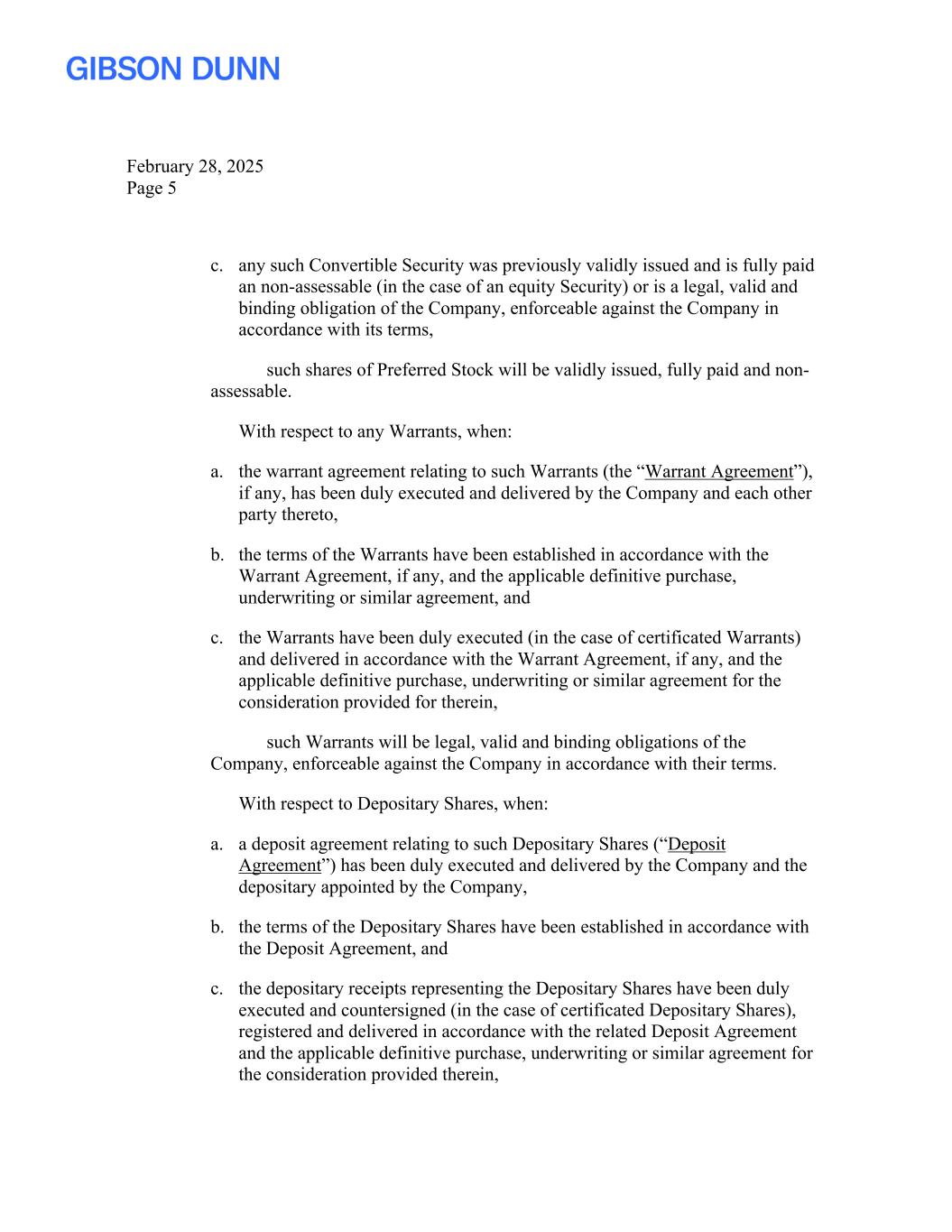 February 28, 2025 Page 5 c. any such Convertible Security was previously validly issued and is fully paid an non-assessable (in the case of an equity Security) or is a legal, valid and binding obligation of the Company, enforceable against the Company in accordance with its terms, such shares of Preferred Stock will be validly issued, fully paid and non- assessable. With respect to any Warrants, when: a. the warrant agreement relating to such Warrants (the “Warrant Agreement”), if any, has been duly executed and delivered by the Company and each other party thereto, b. the terms of the Warrants have been established in accordance with the Warrant Agreement, if any, and the applicable definitive purchase, underwriting or similar agreement, and c. the Warrants have been duly executed (in the case of certificated Warrants) and delivered in accordance with the Warrant Agreement, if any, and the applicable definitive purchase, underwriting or similar agreement for the consideration provided for therein, such Warrants will be legal, valid and binding obligations of the Company, enforceable against the Company in accordance with their terms. With respect to Depositary Shares, when: a. a deposit agreement relating to such Depositary Shares (“Deposit Agreement”) has been duly executed and delivered by the Company and the depositary appointed by the Company, b. the terms of the Depositary Shares have been established in accordance with the Deposit Agreement, and c. the depositary receipts representing the Depositary Shares have been duly executed and countersigned (in the case of certificated Depositary Shares), registered and delivered in accordance with the related Deposit Agreement and the applicable definitive purchase, underwriting or similar agreement for the consideration provided therein,