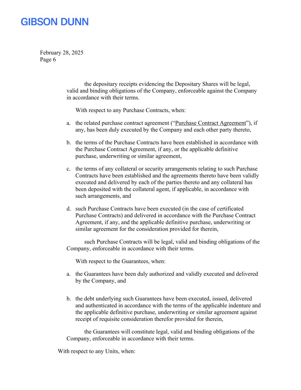 February 28, 2025 Page 6 the depositary receipts evidencing the Depositary Shares will be legal, valid and binding obligations of the Company, enforceable against the Company in accordance with their terms. With respect to any Purchase Contracts, when: a. the related purchase contract agreement (“Purchase Contract Agreement”), if any, has been duly executed by the Company and each other party thereto, b. the terms of the Purchase Contracts have been established in accordance with the Purchase Contract Agreement, if any, or the applicable definitive purchase, underwriting or similar agreement, c. the terms of any collateral or security arrangements relating to such Purchase Contracts have been established and the agreements thereto have been validly executed and delivered by each of the parties thereto and any collateral has been deposited with the collateral agent, if applicable, in accordance with such arrangements, and d. such Purchase Contracts have been executed (in the case of certificated Purchase Contracts) and delivered in accordance with the Purchase Contract Agreement, if any, and the applicable definitive purchase, underwriting or similar agreement for the consideration provided for therein, such Purchase Contracts will be legal, valid and binding obligations of the Company, enforceable in accordance with their terms. With respect to the Guarantees, when: a. the Guarantees have been duly authorized and validly executed and delivered by the Company, and b. the debt underlying such Guarantees have been executed, issued, delivered and authenticated in accordance with the terms of the applicable indenture and the applicable definitive purchase, underwriting or similar agreement against receipt of requisite consideration therefor provided for therein, the Guarantees will constitute legal, valid and binding obligations of the Company, enforceable in accordance with their terms. With respect to any Units, when:
