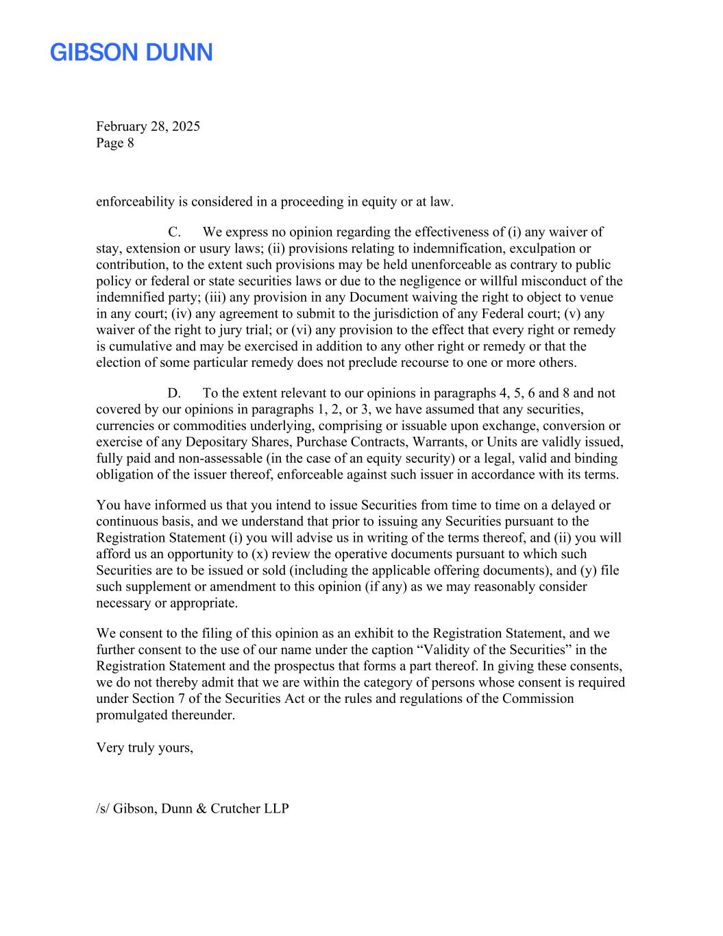 February 28, 2025 Page 8 enforceability is considered in a proceeding in equity or at law. C. We express no opinion regarding the effectiveness of (i) any waiver of stay, extension or usury laws; (ii) provisions relating to indemnification, exculpation or contribution, to the extent such provisions may be held unenforceable as contrary to public policy or federal or state securities laws or due to the negligence or willful misconduct of the indemnified party; (iii) any provision in any Document waiving the right to object to venue in any court; (iv) any agreement to submit to the jurisdiction of any Federal court; (v) any waiver of the right to jury trial; or (vi) any provision to the effect that every right or remedy is cumulative and may be exercised in addition to any other right or remedy or that the election of some particular remedy does not preclude recourse to one or more others. D. To the extent relevant to our opinions in paragraphs 4, 5, 6 and 8 and not covered by our opinions in paragraphs 1, 2, or 3, we have assumed that any securities, currencies or commodities underlying, comprising or issuable upon exchange, conversion or exercise of any Depositary Shares, Purchase Contracts, Warrants, or Units are validly issued, fully paid and non-assessable (in the case of an equity security) or a legal, valid and binding obligation of the issuer thereof, enforceable against such issuer in accordance with its terms. You have informed us that you intend to issue Securities from time to time on a delayed or continuous basis, and we understand that prior to issuing any Securities pursuant to the Registration Statement (i) you will advise us in writing of the terms thereof, and (ii) you will afford us an opportunity to (x) review the operative documents pursuant to which such Securities are to be issued or sold (including the applicable offering documents), and (y) file such supplement or amendment to this opinion (if any) as we may reasonably consider necessary or appropriate. We consent to the filing of this opinion as an exhibit to the Registration Statement, and we further consent to the use of our name under the caption “Validity of the Securities” in the Registration Statement and the prospectus that forms a part thereof. In giving these consents, we do not thereby admit that we are within the category of persons whose consent is required under Section 7 of the Securities Act or the rules and regulations of the Commission promulgated thereunder. Very truly yours, /s/ Gibson, Dunn & Crutcher LLP