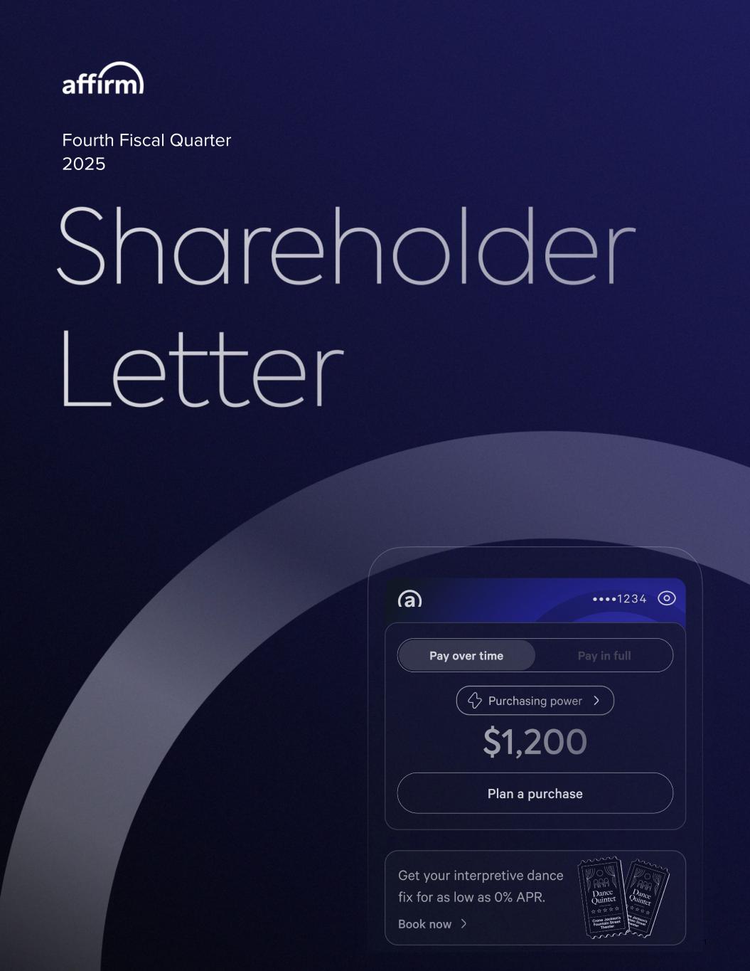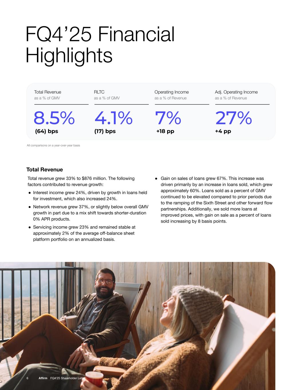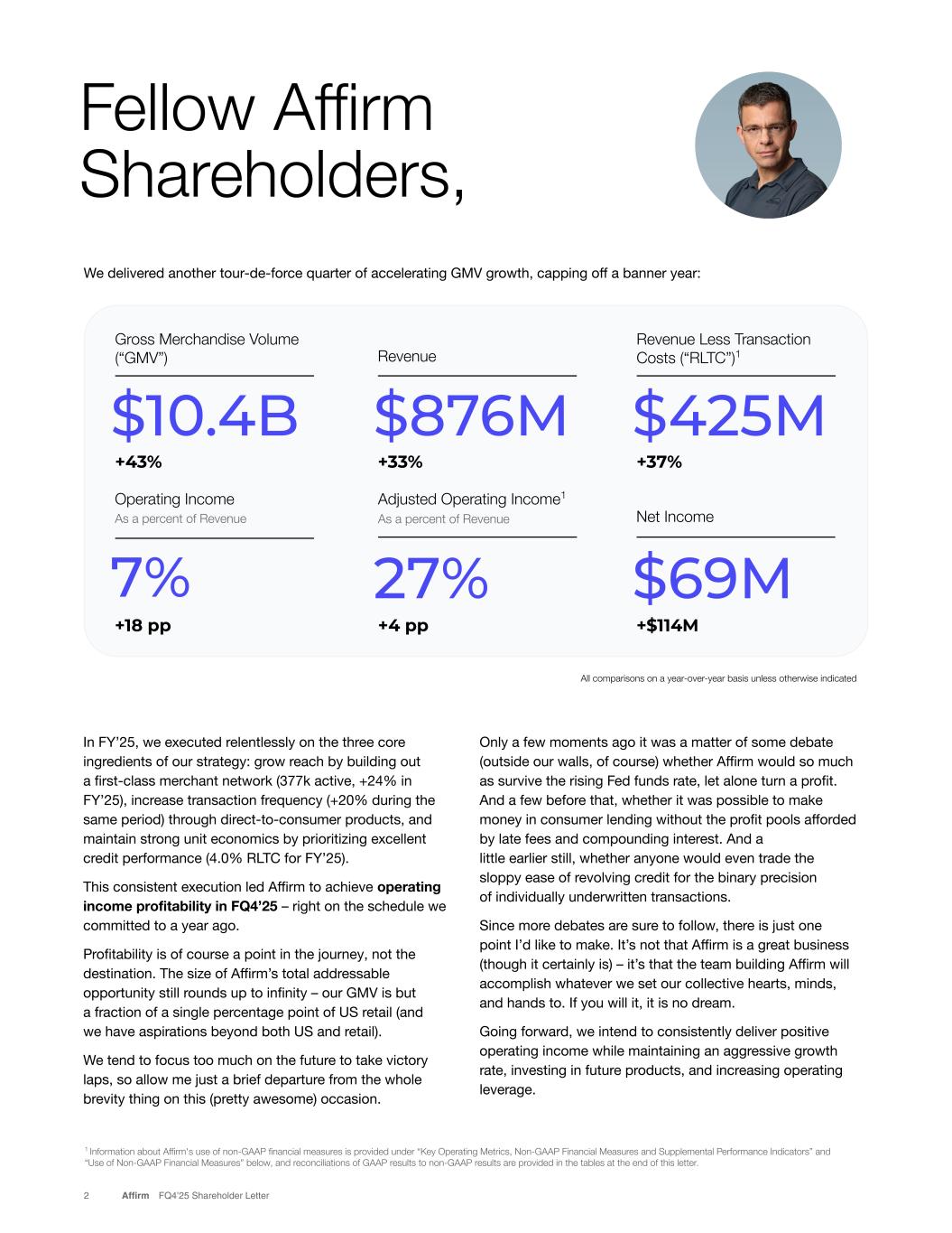 We delivered another tour-de-force quarter of accelerating GMV growth, capping off a banner year: Fellow Affirm Shareholders, 2 Affirm FQ4’25 Shareholder Letter 1 Information about Affirm's use of non-GAAP financial measures is provided under “Key Operating Metrics, Non-GAAP Financial Measures and Supplemental Performance Indicators” and “Use of Non-GAAP Financial Measures” below, and reconciliations of GAAP results to non-GAAP results are provided in the tables at the end of this letter. $425M Revenue Less Transaction Costs (“RLTC”)1 +37% $876M Revenue +33% $10.4B Gross Merchandise Volume (“GMV”) +43% Net Income +$114M 27% Adjusted Operating Income1 As a percent of Revenue +4 pp 7% Operating Income As a percent of Revenue +18 pp $69M Only a few moments ago it was a matter of some debate (outside our walls, of course) whether Affirm would so much as survive the rising Fed funds rate, let alone turn a profit. And a few before that, whether it was possible to make money in consumer lending without the profit pools afforded by late fees and compounding interest. And a little earlier still, whether anyone would even trade the sloppy ease of revolving credit for the binary precision of individually underwritten transactions. Since more debates are sure to follow, there is just one point I’d like to make. It’s not that Affirm is a great business (though it certainly is) – it’s that the team building Affirm will accomplish whatever we set our collective hearts, minds, and hands to. If you will it, it is no dream. Going forward, we intend to consistently deliver positive operating income while maintaining an aggressive growth rate, investing in future products, and increasing operating leverage. In FY’25, we executed relentlessly on the three core ingredients of our strategy: grow reach by building out a first-class merchant network (377k active, +24% in FY’25), increase transaction frequency (+20% during the same period) through direct-to-consumer products, and maintain strong unit economics by prioritizing excellent credit performance (4.0% RLTC for FY’25). This consistent execution led Affirm to achieve operating income profitability in FQ4’25 – right on the schedule we committed to a year ago. Profitability is of course a point in the journey, not the destination. The size of Affirm’s total addressable opportunity still rounds up to infinity – our GMV is but a fraction of a single percentage point of US retail (and we have aspirations beyond both US and retail). We tend to focus too much on the future to take victory laps, so allow me just a brief departure from the whole brevity thing on this (pretty awesome) occasion. All comparisons on a year-over-year basis unless otherwise indicated
