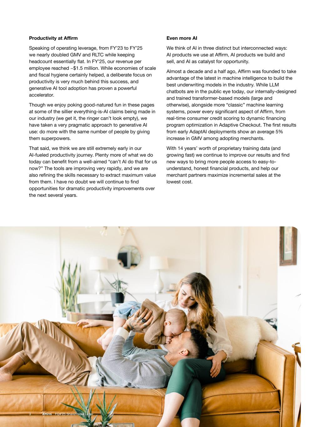 3 Affirm FQ4’25 Shareholder Letter Productivity at Affirm Speaking of operating leverage, from FY’23 to FY’25 we nearly doubled GMV and RLTC while keeping headcount essentially flat. In FY’25, our revenue per employee reached ~$1.5 million. While economies of scale and fiscal hygiene certainly helped, a deliberate focus on productivity is very much behind this success, and generative AI tool adoption has proven a powerful accelerator. Though we enjoy poking good-natured fun in these pages at some of the sillier everything-is-AI claims being made in our industry (we get it, the ringer can’t look empty), we have taken a very pragmatic approach to generative AI use: do more with the same number of people by giving them superpowers. That said, we think we are still extremely early in our AI-fueled productivity journey. Plenty more of what we do today can benefit from a well-aimed “can’t AI do that for us now?” The tools are improving very rapidly, and we are also refining the skills necessary to extract maximum value from them. I have no doubt we will continue to find opportunities for dramatic productivity improvements over the next several years. Even more AI We think of AI in three distinct but interconnected ways: AI products we use at Affirm, AI products we build and sell, and AI as catalyst for opportunity. Almost a decade and a half ago, Affirm was founded to take advantage of the latest in machine intelligence to build the best underwriting models in the industry. While LLM chatbots are in the public eye today, our internally-designed and trained transformer-based models (large and otherwise), alongside more “classic” machine learning systems, power every significant aspect of Affirm, from real-time consumer credit scoring to dynamic financing program optimization in Adaptive Checkout. The first results from early AdaptAI deployments show an average 5% increase in GMV among adopting merchants. With 14 years’ worth of proprietary training data (and growing fast) we continue to improve our results and find new ways to bring more people access to easy-to- understand, honest financial products, and help our merchant partners maximize incremental sales at the lowest cost.