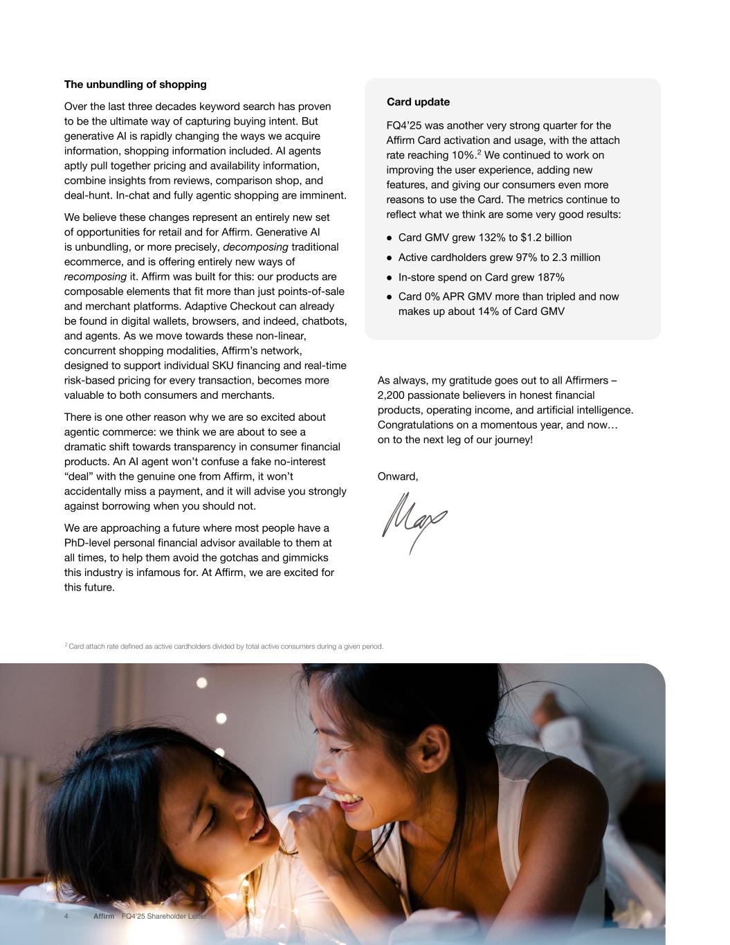44 Affirm FQ4’25 Shareholder Letter Card update FQ4’25 was another very strong quarter for the Affirm Card activation and usage, with the attach rate reaching 10%.2 We continued to work on improving the user experience, adding new features, and giving our consumers even more reasons to use the Card. The metrics continue to reflect what we think are some very good results: ● Card GMV grew 132% to $1.2 billion ● Active cardholders grew 97% to 2.3 million ● In-store spend on Card grew 187% ● Card 0% APR GMV more than tripled and now makes up about 14% of Card GMV As always, my gratitude goes out to all Affirmers – 2,200 passionate believers in honest financial products, operating income, and artificial intelligence. Congratulations on a momentous year, and now… on to the next leg of our journey! Onward, The unbundling of shopping Over the last three decades keyword search has proven to be the ultimate way of capturing buying intent. But generative AI is rapidly changing the ways we acquire information, shopping information included. AI agents aptly pull together pricing and availability information, combine insights from reviews, comparison shop, and deal-hunt. In-chat and fully agentic shopping are imminent. We believe these changes represent an entirely new set of opportunities for retail and for Affirm. Generative AI is unbundling, or more precisely, decomposing traditional ecommerce, and is offering entirely new ways of recomposing it. Affirm was built for this: our products are composable elements that fit more than just points-of-sale and merchant platforms. Adaptive Checkout can already be found in digital wallets, browsers, and indeed, chatbots, and agents. As we move towards these non-linear, concurrent shopping modalities, Affirm’s network, designed to support individual SKU financing and real-time risk-based pricing for every transaction, becomes more valuable to both consumers and merchants. There is one other reason why we are so excited about agentic commerce: we think we are about to see a dramatic shift towards transparency in consumer financial products. An AI agent won’t confuse a fake no-interest “deal” with the genuine one from Affirm, it won’t accidentally miss a payment, and it will advise you strongly against borrowing when you should not. We are approaching a future where most people have a PhD-level personal financial advisor available to them at all times, to help them avoid the gotchas and gimmicks this industry is infamous for. At Affirm, we are excited for this future. 2 Card attach rate defined as active cardholders divided by total active consumers during a given period.