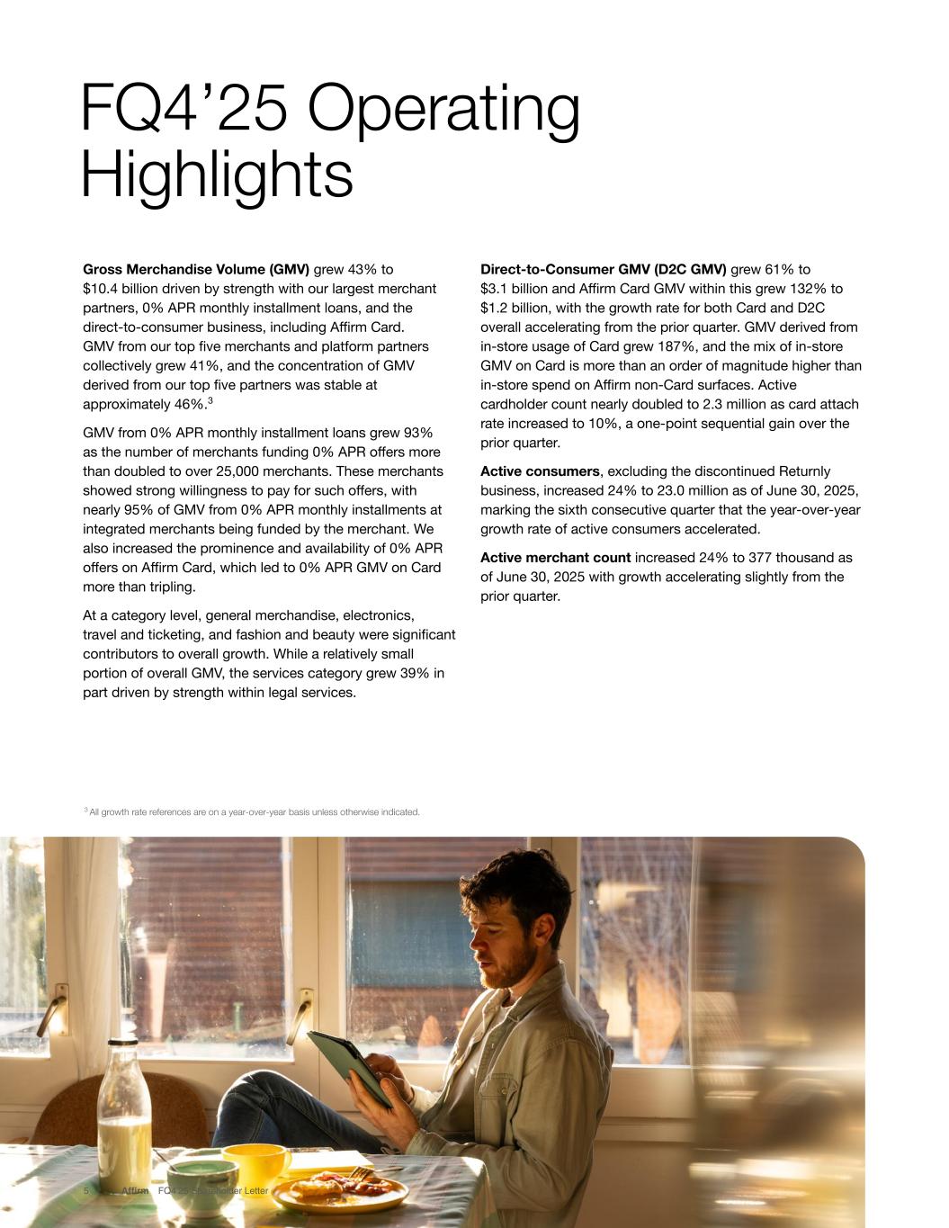 Gross Merchandise Volume (GMV) grew 43% to $10.4 billion driven by strength with our largest merchant partners, 0% APR monthly installment loans, and the direct-to-consumer business, including Affirm Card. GMV from our top five merchants and platform partners collectively grew 41%, and the concentration of GMV derived from our top five partners was stable at approximately 46%.3 GMV from 0% APR monthly installment loans grew 93% as the number of merchants funding 0% APR offers more than doubled to over 25,000 merchants. These merchants showed strong willingness to pay for such offers, with nearly 95% of GMV from 0% APR monthly installments at integrated merchants being funded by the merchant. We also increased the prominence and availability of 0% APR offers on Affirm Card, which led to 0% APR GMV on Card more than tripling. At a category level, general merchandise, electronics, travel and ticketing, and fashion and beauty were significant contributors to overall growth. While a relatively small portion of overall GMV, the services category grew 39% in part driven by strength within legal services. FQ4’25 Operating Highlights 5 Affirm FQ4’25 Shareholder Letter Direct-to-Consumer GMV (D2C GMV) grew 61% to $3.1 billion and Affirm Card GMV within this grew 132% to $1.2 billion, with the growth rate for both Card and D2C overall accelerating from the prior quarter. GMV derived from in-store usage of Card grew 187%, and the mix of in-store GMV on Card is more than an order of magnitude higher than in-store spend on Affirm non-Card surfaces. Active cardholder count nearly doubled to 2.3 million as card attach rate increased to 10%, a one-point sequential gain over the prior quarter. Active consumers, excluding the discontinued Returnly business, increased 24% to 23.0 million as of June 30, 2025, marking the sixth consecutive quarter that the year-over-year growth rate of active consumers accelerated. Active merchant count increased 24% to 377 thousand as of June 30, 2025 with growth accelerating slightly from the prior quarter. 3 All growth rate references are on a year-over-year basis unless otherwise indicated.