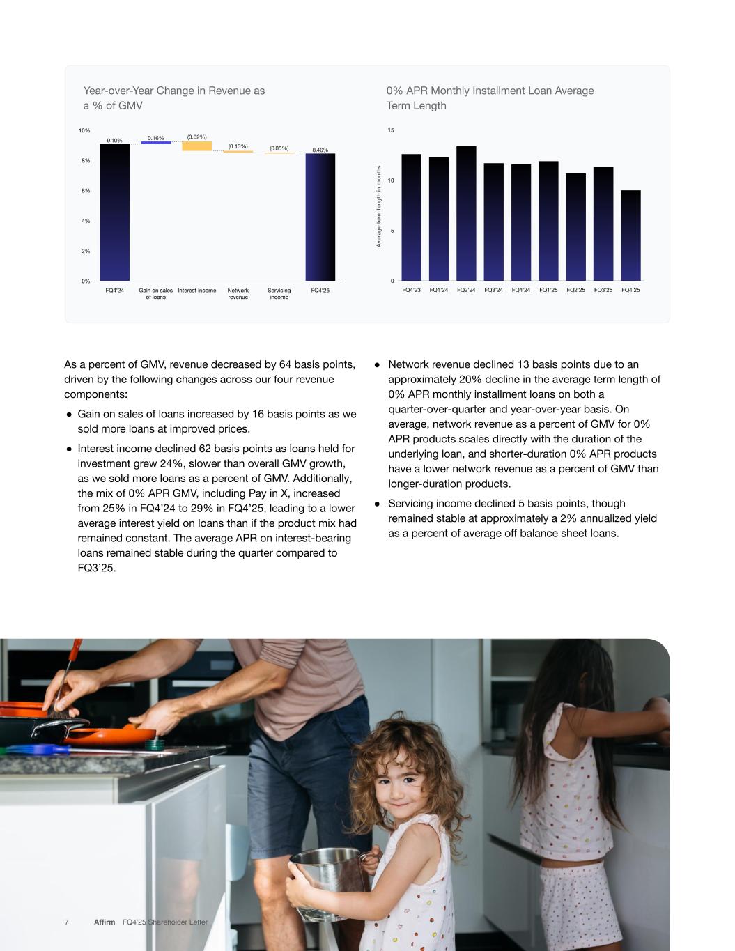 Year-over-Year Change in Revenue as a % of GMV 0% APR Monthly Installment Loan Average Term Length 7 Affirm FQ4’25 Shareholder Letter As a percent of GMV, revenue decreased by 64 basis points, driven by the following changes across our four revenue components: ● Gain on sales of loans increased by 16 basis points as we sold more loans at improved prices. ● Interest income declined 62 basis points as loans held for investment grew 24%, slower than overall GMV growth, as we sold more loans as a percent of GMV. Additionally, the mix of 0% APR GMV, including Pay in X, increased from 25% in FQ4’24 to 29% in FQ4’25, leading to a lower average interest yield on loans than if the product mix had remained constant. The average APR on interest-bearing loans remained stable during the quarter compared to FQ3’25. ● Network revenue declined 13 basis points due to an approximately 20% decline in the average term length of 0% APR monthly installment loans on both a quarter-over-quarter and year-over-year basis. On average, network revenue as a percent of GMV for 0% APR products scales directly with the duration of the underlying loan, and shorter-duration 0% APR products have a lower network revenue as a percent of GMV than longer-duration products. ● Servicing income declined 5 basis points, though remained stable at approximately a 2% annualized yield as a percent of average off balance sheet loans.