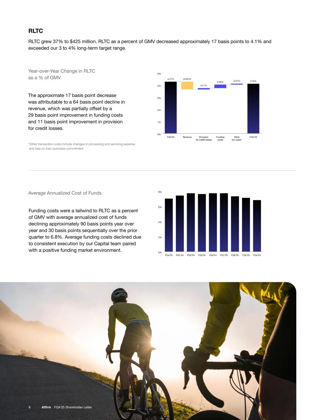 8 Affirm FQ4’25 Shareholder Letter RLTC RLTC grew 37% to $425 million. RLTC as a percent of GMV decreased approximately 17 basis points to 4.1% and exceeded our 3 to 4% long-term target range. The approximate 17 basis point decrease was attributable to a 64 basis point decline in revenue, which was partially offset by a 29 basis point improvement in funding costs and 11 basis point improvement in provision for credit losses. Year-over-Year Change in RLTC as a % of GMV Funding costs were a tailwind to RLTC as a percent of GMV with average annualized cost of funds declining approximately 90 basis points year over year and 30 basis points sequentially over the prior quarter to 6.8%. Average funding costs declined due to consistent execution by our Capital team paired with a positive funding market environment. *Other transaction costs include changes in processing and servicing expense and loss on loan purchase commitment Average Annualized Cost of Funds