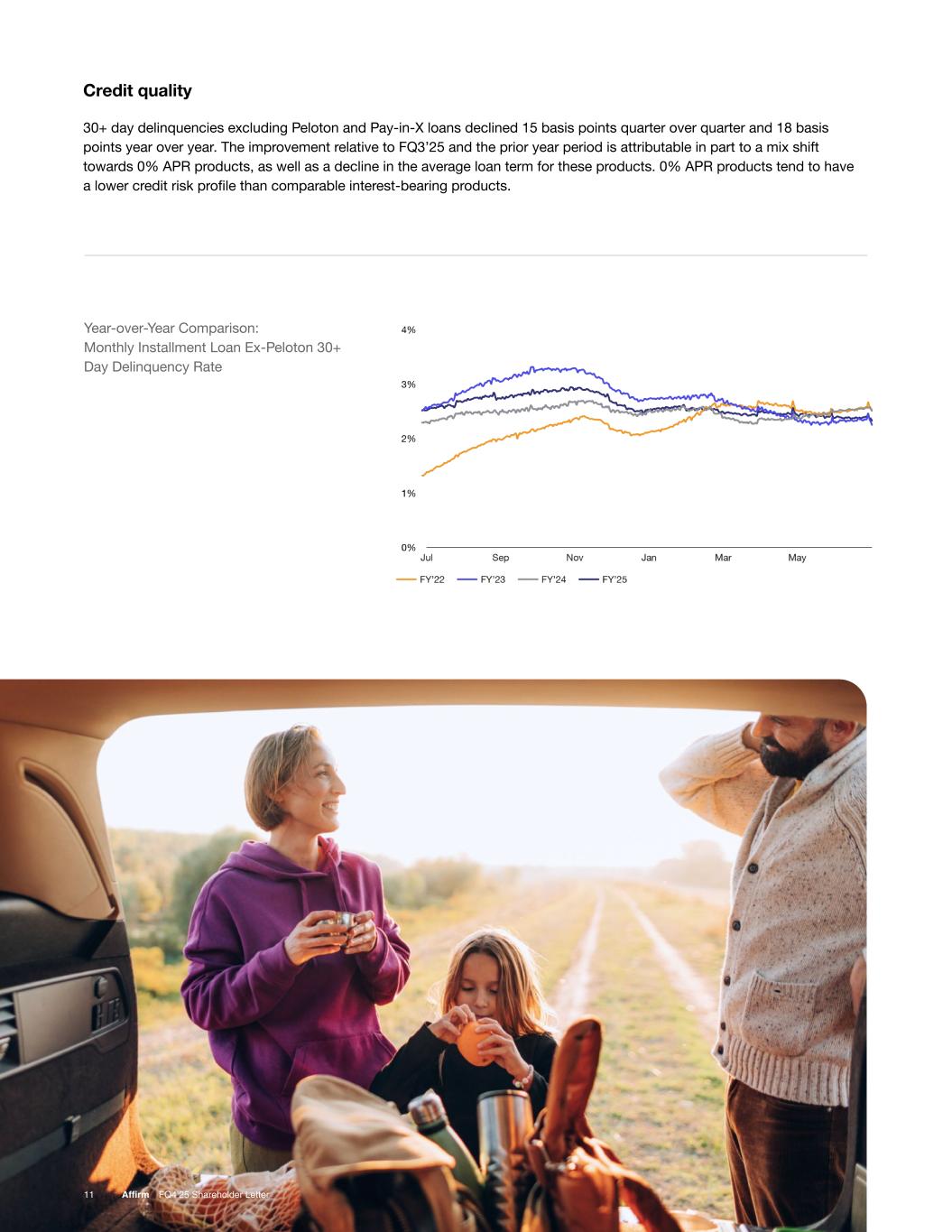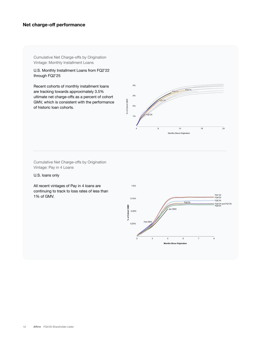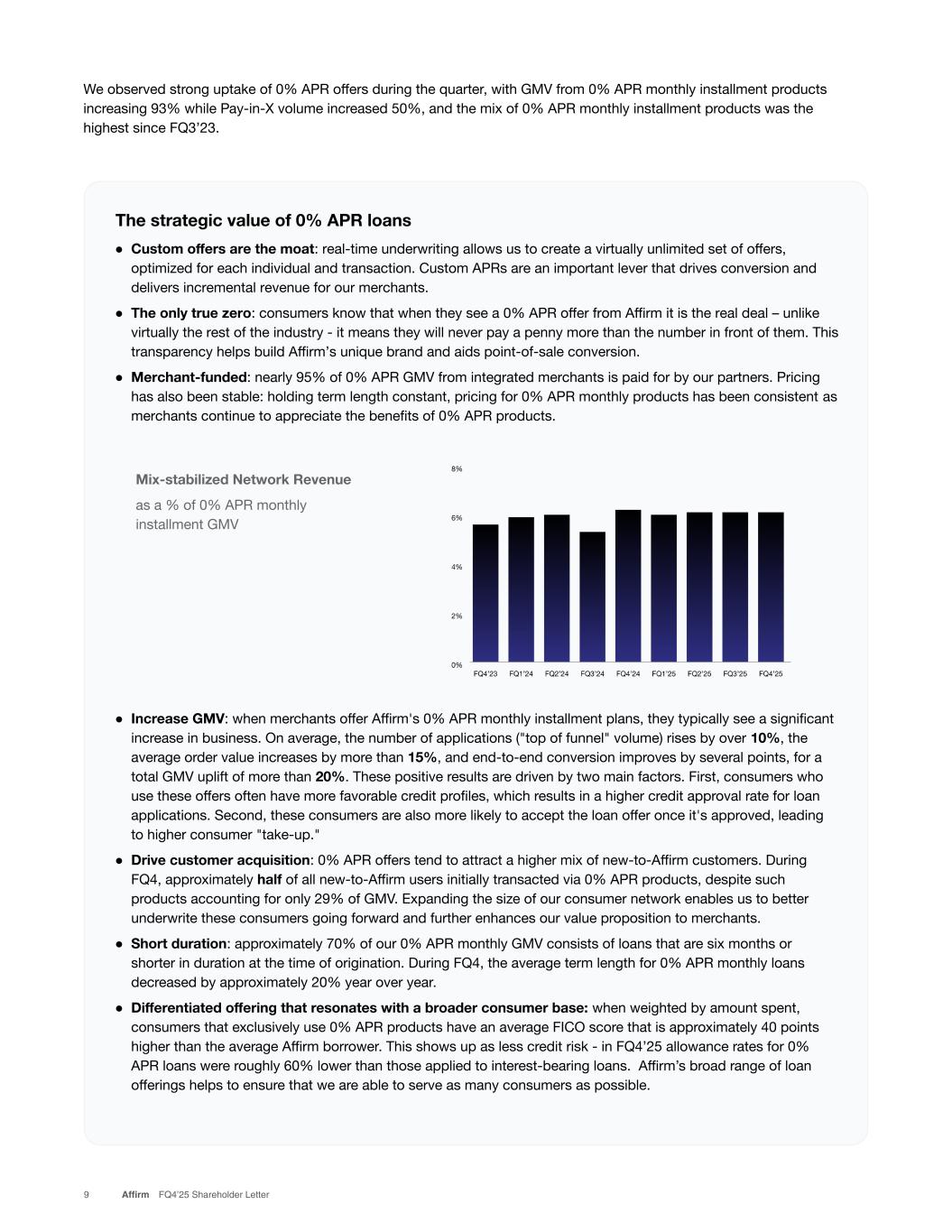 9 Affirm FQ4’25 Shareholder Letter We observed strong uptake of 0% APR offers during the quarter, with GMV from 0% APR monthly installment products increasing 93% while Pay-in-X volume increased 50%, and the mix of 0% APR monthly installment products was the highest since FQ3’23. The strategic value of 0% APR loans ● Custom offers are the moat: real-time underwriting allows us to create a virtually unlimited set of offers, optimized for each individual and transaction. Custom APRs are an important lever that drives conversion and delivers incremental revenue for our merchants. ● The only true zero: consumers know that when they see a 0% APR offer from Affirm it is the real deal – unlike virtually the rest of the industry - it means they will never pay a penny more than the number in front of them. This transparency helps build Affirm’s unique brand and aids point-of-sale conversion. ● Merchant-funded: nearly 95% of 0% APR GMV from integrated merchants is paid for by our partners. Pricing has also been stable: holding term length constant, pricing for 0% APR monthly products has been consistent as merchants continue to appreciate the benefits of 0% APR products. ● Increase GMV: when merchants offer Affirm's 0% APR monthly installment plans, they typically see a significant increase in business. On average, the number of applications ("top of funnel" volume) rises by over 10%, the average order value increases by more than 15%, and end-to-end conversion improves by several points, for a total GMV uplift of more than 20%. These positive results are driven by two main factors. First, consumers who use these offers often have more favorable credit profiles, which results in a higher credit approval rate for loan applications. Second, these consumers are also more likely to accept the loan offer once it's approved, leading to higher consumer "take-up." ● Drive customer acquisition: 0% APR offers tend to attract a higher mix of new-to-Affirm customers. During FQ4, approximately half of all new-to-Affirm users initially transacted via 0% APR products, despite such products accounting for only 29% of GMV. Expanding the size of our consumer network enables us to better underwrite these consumers going forward and further enhances our value proposition to merchants. ● Short duration: approximately 70% of our 0% APR monthly GMV consists of loans that are six months or shorter in duration at the time of origination. During FQ4, the average term length for 0% APR monthly loans decreased by approximately 20% year over year. ● Differentiated offering that resonates with a broader consumer base: when weighted by amount spent, consumers that exclusively use 0% APR products have an average FICO score that is approximately 40 points higher than the average Affirm borrower. This shows up as less credit risk - in FQ4’25 allowance rates for 0% APR loans were roughly 60% lower than those applied to interest-bearing loans. Affirm’s broad range of loan offerings helps to ensure that we are able to serve as many consumers as possible. Mix-stabilized Network Revenue as a % of 0% APR monthly installment GMV