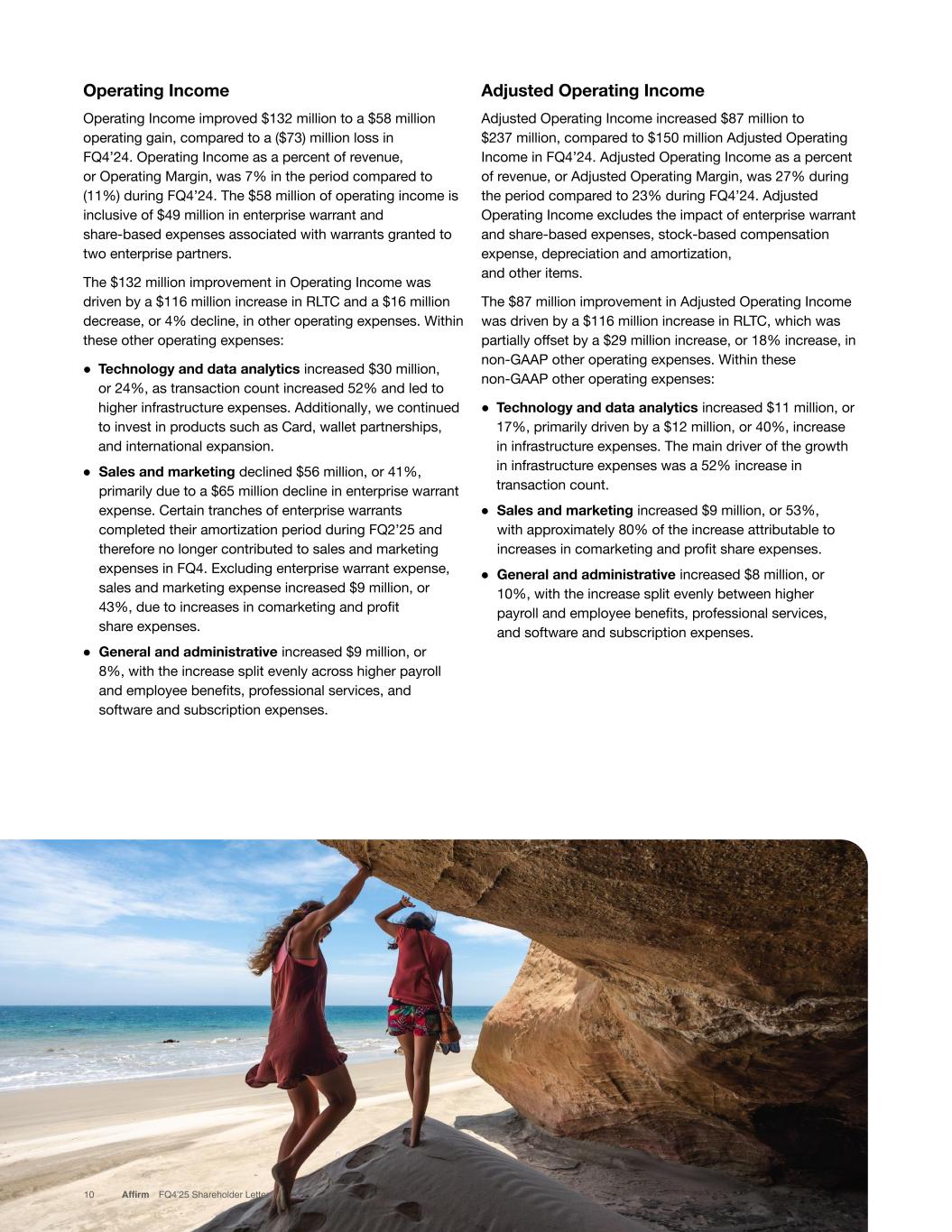 Adjusted Operating Income Adjusted Operating Income increased $87 million to $237 million, compared to $150 million Adjusted Operating Income in FQ4’24. Adjusted Operating Income as a percent of revenue, or Adjusted Operating Margin, was 27% during the period compared to 23% during FQ4’24. Adjusted Operating Income excludes the impact of enterprise warrant and share-based expenses, stock-based compensation expense, depreciation and amortization, and other items. The $87 million improvement in Adjusted Operating Income was driven by a $116 million increase in RLTC, which was partially offset by a $29 million increase, or 18% increase, in non-GAAP other operating expenses. Within these non-GAAP other operating expenses: ● Technology and data analytics increased $11 million, or 17%, primarily driven by a $12 million, or 40%, increase in infrastructure expenses. The main driver of the growth in infrastructure expenses was a 52% increase in transaction count. ● Sales and marketing increased $9 million, or 53%, with approximately 80% of the increase attributable to increases in comarketing and profit share expenses. ● General and administrative increased $8 million, or 10%, with the increase split evenly between higher payroll and employee benefits, professional services, and software and subscription expenses. 10 Affirm FQ4’25 Shareholder Letter Operating Income Operating Income improved $132 million to a $58 million operating gain, compared to a ($73) million loss in FQ4’24. Operating Income as a percent of revenue, or Operating Margin, was 7% in the period compared to (11%) during FQ4’24. The $58 million of operating income is inclusive of $49 million in enterprise warrant and share-based expenses associated with warrants granted to two enterprise partners. The $132 million improvement in Operating Income was driven by a $116 million increase in RLTC and a $16 million decrease, or 4% decline, in other operating expenses. Within these other operating expenses: ● Technology and data analytics increased $30 million, or 24%, as transaction count increased 52% and led to higher infrastructure expenses. Additionally, we continued to invest in products such as Card, wallet partnerships, and international expansion. ● Sales and marketing declined $56 million, or 41%, primarily due to a $65 million decline in enterprise warrant expense. Certain tranches of enterprise warrants completed their amortization period during FQ2’25 and therefore no longer contributed to sales and marketing expenses in FQ4. Excluding enterprise warrant expense, sales and marketing expense increased $9 million, or 43%, due to increases in comarketing and profit share expenses. ● General and administrative increased $9 million, or 8%, with the increase split evenly across higher payroll and employee benefits, professional services, and software and subscription expenses.