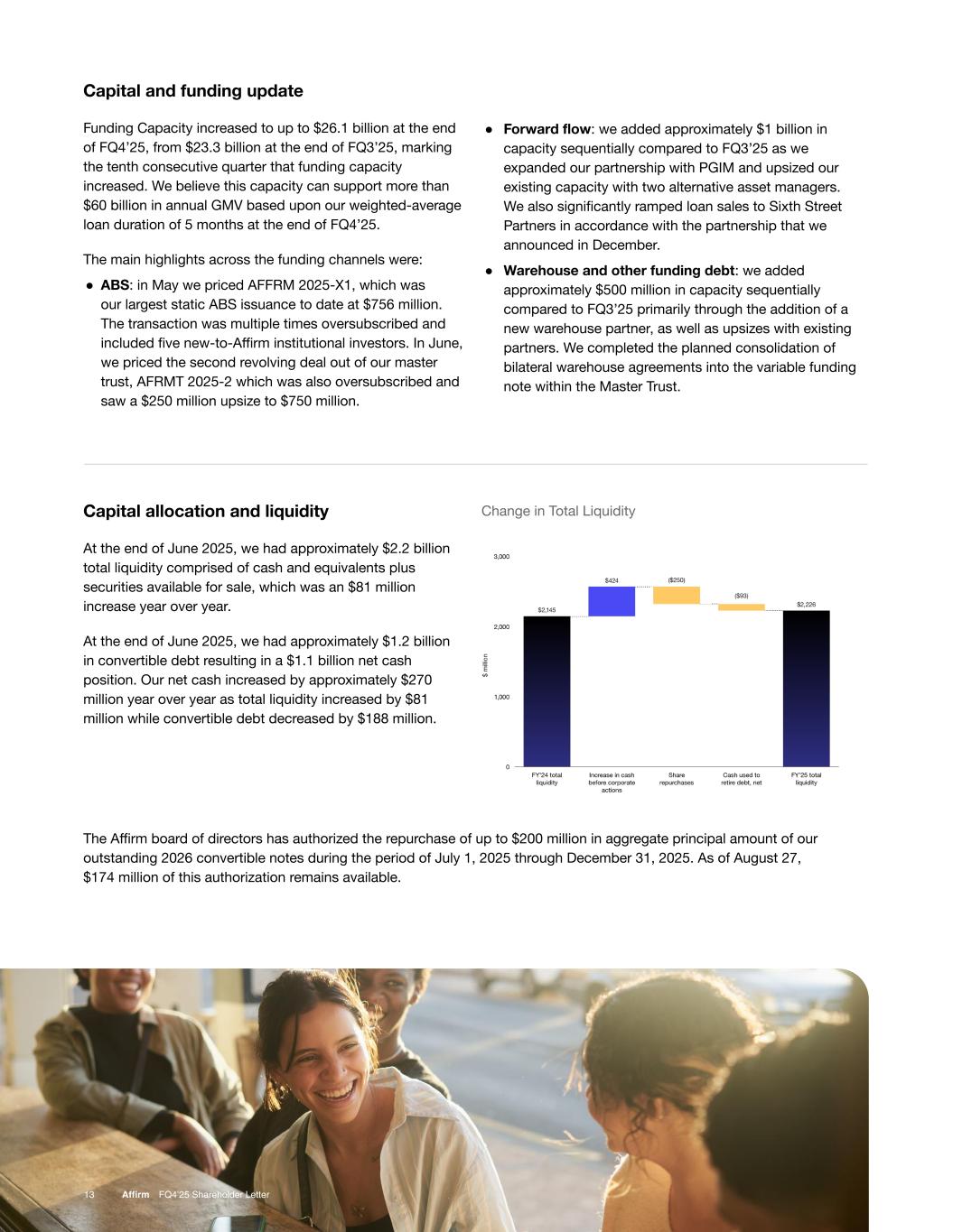13 Affirm FQ4’25 Shareholder Letter Capital and funding update Funding Capacity increased to up to $26.1 billion at the end of FQ4’25, from $23.3 billion at the end of FQ3’25, marking the tenth consecutive quarter that funding capacity increased. We believe this capacity can support more than $60 billion in annual GMV based upon our weighted-average loan duration of 5 months at the end of FQ4’25. The main highlights across the funding channels were: ● ABS: in May we priced AFFRM 2025-X1, which was our largest static ABS issuance to date at $756 million. The transaction was multiple times oversubscribed and included five new-to-Affirm institutional investors. In June, we priced the second revolving deal out of our master trust, AFRMT 2025-2 which was also oversubscribed and saw a $250 million upsize to $750 million. ● Forward flow: we added approximately $1 billion in capacity sequentially compared to FQ3’25 as we expanded our partnership with PGIM and upsized our existing capacity with two alternative asset managers. We also significantly ramped loan sales to Sixth Street Partners in accordance with the partnership that we announced in December. ● Warehouse and other funding debt: we added approximately $500 million in capacity sequentially compared to FQ3’25 primarily through the addition of a new warehouse partner, as well as upsizes with existing partners. We completed the planned consolidation of bilateral warehouse agreements into the variable funding note within the Master Trust. Capital allocation and liquidity At the end of June 2025, we had approximately $2.2 billion total liquidity comprised of cash and equivalents plus securities available for sale, which was an $81 million increase year over year. At the end of June 2025, we had approximately $1.2 billion in convertible debt resulting in a $1.1 billion net cash position. Our net cash increased by approximately $270 million year over year as total liquidity increased by $81 million while convertible debt decreased by $188 million. The Affirm board of directors has authorized the repurchase of up to $200 million in aggregate principal amount of our outstanding 2026 convertible notes during the period of July 1, 2025 through December 31, 2025. As of August 27, $174 million of this authorization remains available. Change in Total Liquidity