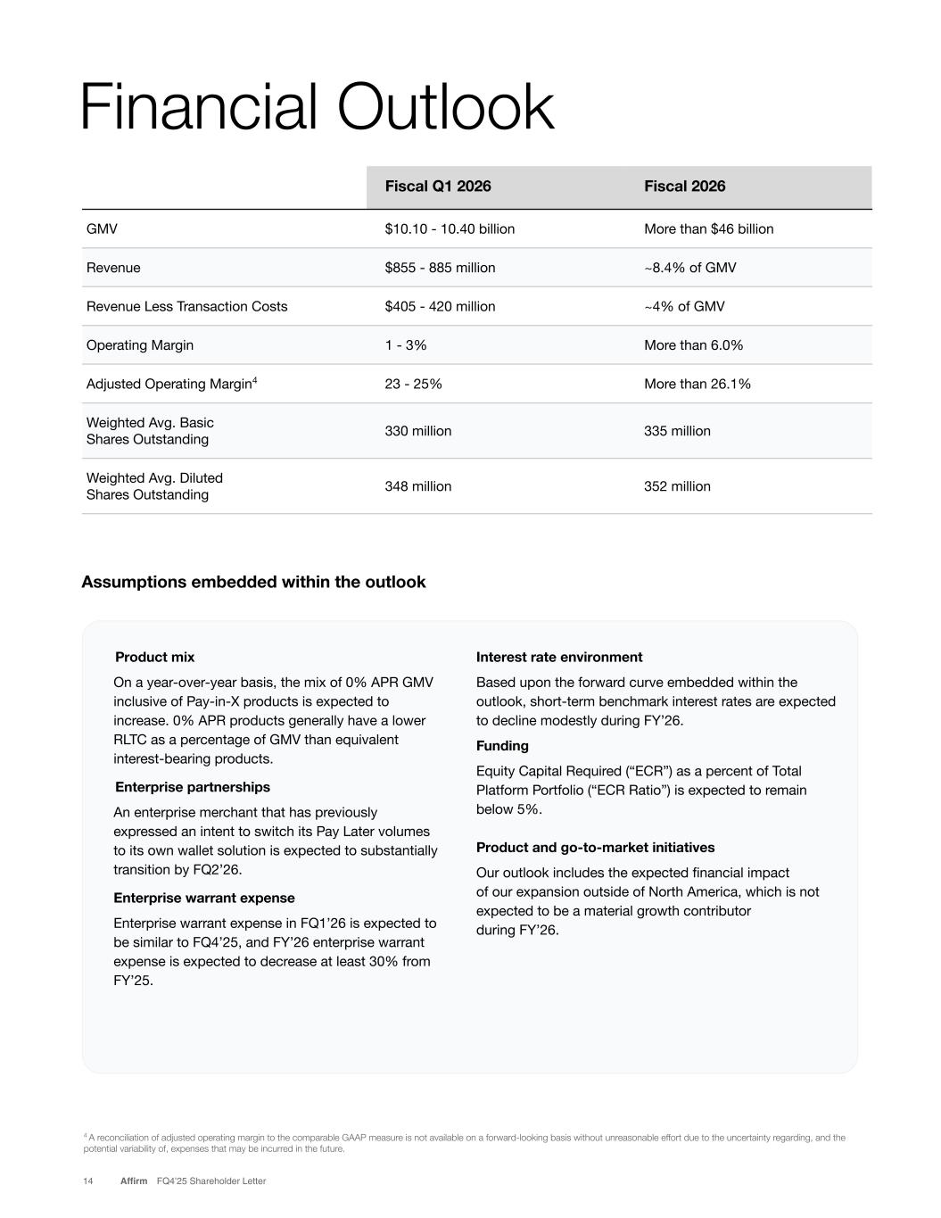 1414 Affirm FQ4’25 Shareholder Letter Assumptions embedded within the outlook Product mix On a year-over-year basis, the mix of 0% APR GMV inclusive of Pay-in-X products is expected to increase. 0% APR products generally have a lower RLTC as a percentage of GMV than equivalent interest-bearing products. Enterprise partnerships An enterprise merchant that has previously expressed an intent to switch its Pay Later volumes to its own wallet solution is expected to substantially transition by FQ2’26. Enterprise warrant expense Enterprise warrant expense in FQ1’26 is expected to be similar to FQ4’25, and FY’26 enterprise warrant expense is expected to decrease at least 30% from FY’25. Interest rate environment Based upon the forward curve embedded within the outlook, short-term benchmark interest rates are expected to decline modestly during FY’26. Funding Equity Capital Required (“ECR”) as a percent of Total Platform Portfolio (“ECR Ratio”) is expected to remain below 5%. Product and go-to-market initiatives Our outlook includes the expected financial impact of our expansion outside of North America, which is not expected to be a material growth contributor during FY’26. Fiscal Q1 2026 Fiscal 2026 GMV $10.10 - 10.40 billion More than $46 billion Revenue $855 - 885 million ~8.4% of GMV Revenue Less Transaction Costs $405 - 420 million ~4% of GMV Operating Margin 1 - 3% More than 6.0% Adjusted Operating Margin4 23 - 25% More than 26.1% Weighted Avg. Basic Shares Outstanding 330 million 335 million Weighted Avg. Diluted Shares Outstanding 348 million 352 million Financial Outlook 4 A reconciliation of adjusted operating margin to the comparable GAAP measure is not available on a forward-looking basis without unreasonable effort due to the uncertainty regarding, and the potential variability of, expenses that may be incurred in the future.