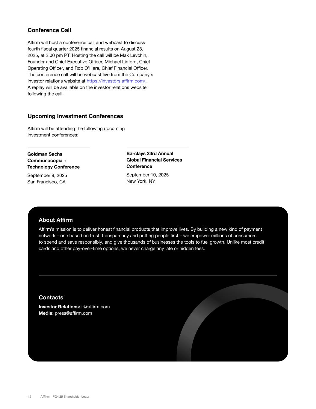 15 Affirm FQ4’25 Shareholder Letter About Affirm Affirm’s mission is to deliver honest financial products that improve lives. By building a new kind of payment network – one based on trust, transparency and putting people first – we empower millions of consumers to spend and save responsibly, and give thousands of businesses the tools to fuel growth. Unlike most credit cards and other pay-over-time options, we show consumers exactly what they will pay up front, and never charge any late or hidden fees. Contacts Investor Relations: ir@affirm.com Media: press@affirm.com Conference Call Affirm will host a conference call and webcast to discuss fourth fiscal quarter 2025 financial results on August 28, 2025, at 2:00 pm PT. Hosting the call will be Max Levchin, Founder and Chief Executive Officer, Michael Linford, Chief Operating Officer, and Rob O’Hare, Chief Financial Officer. The conference call will be webcast live from the Company's investor relations website at https://investors.affirm.com/. A replay will be available on the investor relations website following the call. Goldman Sachs Communacopia + Technology Conference September 9, 2025 San Francisco, CA Barclays 23rd Annual Global Financial Services Conference September 10, 2025 New York, NY Upcoming Investment Conferences Affirm will be attending the following upcoming investment conferences: never harge any late or hidden f es.