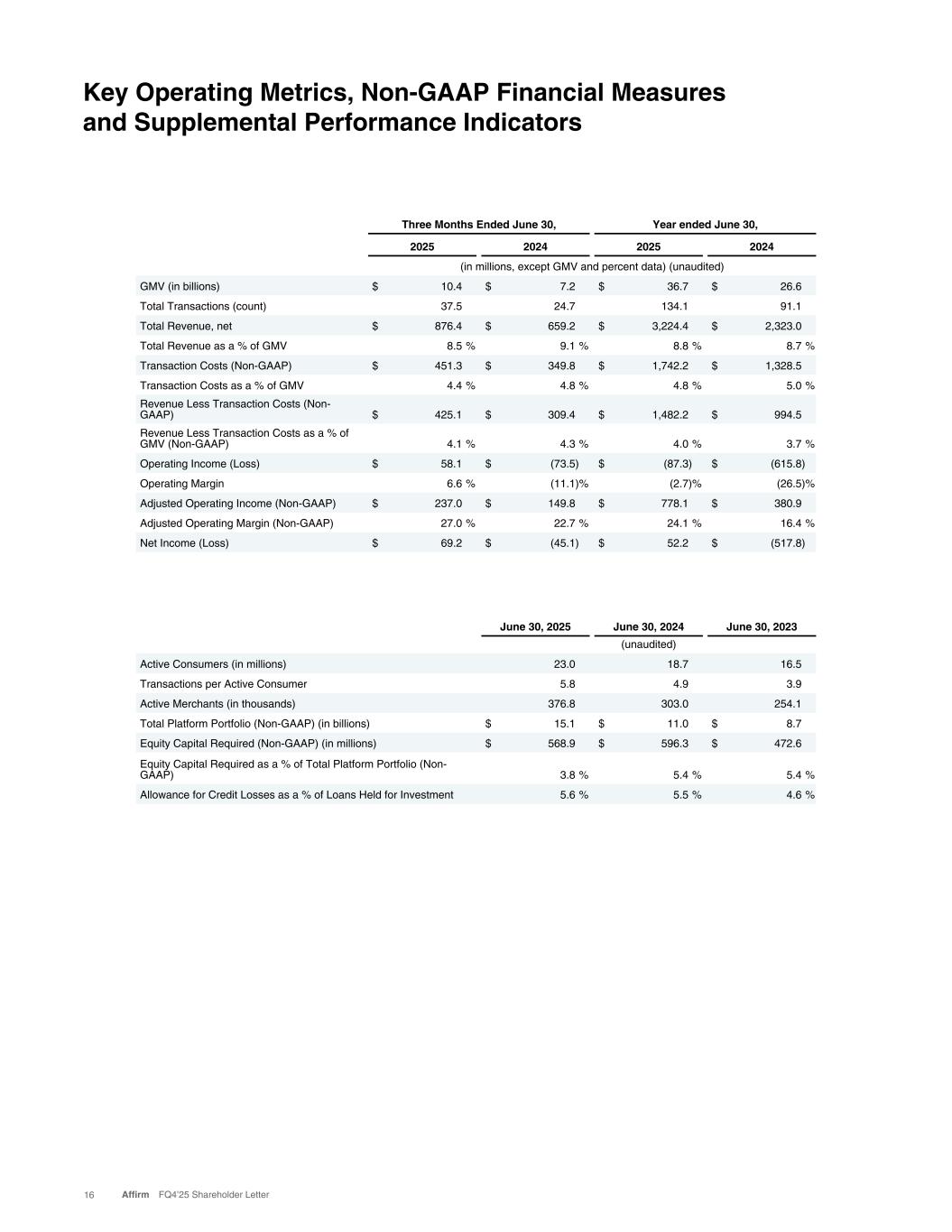 Three Months Ended June 30, Year ended June 30, 2025 2024 2025 2024 (in millions, except GMV and percent data) (unaudited) GMV (in billions) $ 10.4 $ 7.2 $ 36.7 $ 26.6 Total Transactions (count) 37.5 24.7 134.1 91.1 Total Revenue, net $ 876.4 $ 659.2 $ 3,224.4 $ 2,323.0 Total Revenue as a % of GMV 8.5 % 9.1 % 8.8 % 8.7 % Transaction Costs (Non-GAAP) $ 451.3 $ 349.8 $ 1,742.2 $ 1,328.5 Transaction Costs as a % of GMV 4.4 % 4.8 % 4.8 % 5.0 % Revenue Less Transaction Costs (Non- GAAP) $ 425.1 $ 309.4 $ 1,482.2 $ 994.5 Revenue Less Transaction Costs as a % of GMV (Non-GAAP) 4.1 % 4.3 % 4.0 % 3.7 % Operating Income (Loss) $ 58.1 $ (73.5) $ (87.3) $ (615.8) Operating Margin 6.6 % (11.1) % (2.7) % (26.5) % Adjusted Operating Income (Non-GAAP) $ 237.0 $ 149.8 $ 778.1 $ 380.9 Adjusted Operating Margin (Non-GAAP) 27.0 % 22.7 % 24.1 % 16.4 % Net Income (Loss) $ 69.2 $ (45.1) $ 52.2 $ (517.8) Key Operating Metrics, Non-GAAP Financial Measures and Supplemental Performance Indicators June 30, 2025 June 30, 2024 June 30, 2023 (unaudited) Active Consumers (in millions) 23.0 18.7 16.5 Transactions per Active Consumer 5.8 4.9 3.9 Active Merchants (in thousands) 376.8 303.0 254.1 Total Platform Portfolio (Non-GAAP) (in billions) $ 15.1 $ 11.0 $ 8.7 Equity Capital Required (Non-GAAP) (in millions) $ 568.9 $ 596.3 $ 472.6 Equity Capital Required as a % of Total Platform Portfolio (Non- GAAP) 3.8 % 5.4 % 5.4 % Allowance for Credit Losses as a % of Loans Held for Investment 5.6 % 5.5 % 4.6 % Affirm FQ4’25 Shareholder Letter16