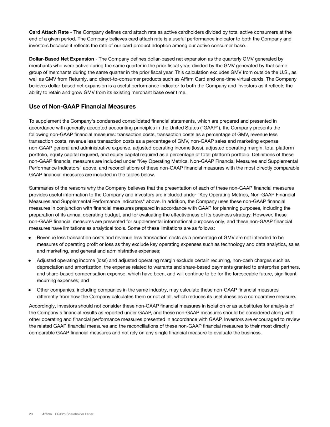 Card Attach Rate - The Company defines card attach rate as active cardholders divided by total active consumers at the end of a given period. The Company believes card attach rate is a useful performance indicator to both the Company and investors because it reflects the rate of our card product adoption among our active consumer base. Dollar-Based Net Expansion - The Company defines dollar-based net expansion as the quarterly GMV generated by merchants who were active during the same quarter in the prior fiscal year, divided by the GMV generated by that same group of merchants during the same quarter in the prior fiscal year. This calculation excludes GMV from outside the U.S., as well as GMV from Returnly, and direct-to-consumer products such as Affirm Card and one-time virtual cards. The Company believes dollar-based net expansion is a useful performance indicator to both the Company and investors as it reflects the ability to retain and grow GMV from its existing merchant base over time. Use of Non-GAAP Financial Measures To supplement the Company's condensed consolidated financial statements, which are prepared and presented in accordance with generally accepted accounting principles in the United States ("GAAP"), the Company presents the following non-GAAP financial measures: transaction costs, transaction costs as a percentage of GMV, revenue less transaction costs, revenue less transaction costs as a percentage of GMV, non-GAAP sales and marketing expense, non-GAAP general and administrative expense, adjusted operating income (loss), adjusted operating margin, total platform portfolio, equity capital required, and equity capital required as a percentage of total platform portfolio. Definitions of these non-GAAP financial measures are included under "Key Operating Metrics, Non-GAAP Financial Measures and Supplemental Performance Indicators" above, and reconciliations of these non-GAAP financial measures with the most directly comparable GAAP financial measures are included in the tables below. Summaries of the reasons why the Company believes that the presentation of each of these non-GAAP financial measures provides useful information to the Company and investors are included under "Key Operating Metrics, Non-GAAP Financial Measures and Supplemental Performance Indicators" above. In addition, the Company uses these non-GAAP financial measures in conjunction with financial measures prepared in accordance with GAAP for planning purposes, including the preparation of its annual operating budget, and for evaluating the effectiveness of its business strategy. However, these non-GAAP financial measures are presented for supplemental informational purposes only, and these non-GAAP financial measures have limitations as analytical tools. Some of these limitations are as follows: ● Revenue less transaction costs and revenue less transaction costs as a percentage of GMV are not intended to be measures of operating profit or loss as they exclude key operating expenses such as technology and data analytics, sales and marketing, and general and administrative expenses; ● Adjusted operating income (loss) and adjusted operating margin exclude certain recurring, non-cash charges such as depreciation and amortization, the expense related to warrants and share-based payments granted to enterprise partners, and share-based compensation expense, which have been, and will continue to be for the foreseeable future, significant recurring expenses; and ● Other companies, including companies in the same industry, may calculate these non-GAAP financial measures differently from how the Company calculates them or not at all, which reduces its usefulness as a comparative measure. Accordingly, investors should not consider these non-GAAP financial measures in isolation or as substitutes for analysis of the Company's financial results as reported under GAAP, and these non-GAAP measures should be considered along with other operating and financial performance measures presented in accordance with GAAP. Investors are encouraged to review the related GAAP financial measures and the reconciliations of these non-GAAP financial measures to their most directly comparable GAAP financial measures and not rely on any single financial measure to evaluate the business. 20 Affirm FQ4’25 Shareholder Letter