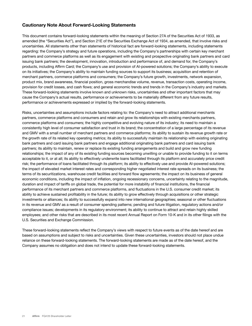 Key Operating Metrics Gross Merchandise Volume (“GMV”) - The Company defines GMV as the total dollar amount of all transactions on the Affirm platform during the applicable period, net of refunds. GMV does not represent revenue earned by the Company. However, the Company believes that GMV is a useful operating metric to both the Company and investors in assessing the volume of transactions that take place on the Company's platform, which is an indicator of the success of the Company's merchants and the strength of that platform. Active Consumers - The Company defines an active consumer as a consumer who completes at least one transaction on its platform during the twelve months prior to the measurement date. The Company believes that active consumers is a useful operating metric to both the Company and investors in assessing consumer adoption and engagement and measuring the size of the Company's network. Transactions per Active Consumer - Transactions per active consumer is defined as the average number of transactions that an active consumer has conducted on its platform during the twelve months prior to the measurement date. The Company believes that transactions per active consumer is a useful operating metric to both the Company and investors in assessing consumer engagement and repeat usage, which is an indicator of the value of the Company's network. Non-GAAP Financial Measures Transaction Costs - The Company defines transaction costs as the sum of loss on loan purchase commitment, provision for credit losses, funding costs, and processing and servicing expense. The Company believes that transaction costs is a useful financial measure to both the Company and investors of those costs, which vary with the volume of transactions processed on the Company's platform. Transaction Costs as a Percentage of GMV - The Company defines transaction costs as a Percentage of GMV as transaction costs, as defined above, as a percentage of GMV, as defined above. The Company believes that transaction costs as a percentage of GMV is a useful financial measure to both the Company and investors as it approximates the variable cost efficiency of transactions processed on the Company's platform. Revenue Less Transaction Costs (“RLTC”) - The Company defines revenue less transaction costs as GAAP total revenue less transaction costs, as defined above. The Company believes that revenue less transaction costs is a useful financial measure to both the Company and investors of the economic value generated by transactions processed on the Company's platform. Revenue Less Transaction Costs as a Percentage of GMV - The Company defines revenue less transaction costs as a percentage of GMV as revenue less transaction costs, as defined above, as a percentage of GMV, as defined above. The Company believes that revenue less transaction costs as a percentage of GMV is a useful financial measure to both the Company and investors of the unit economics of transactions processed on the Company's platform. Adjusted Operating Income - The Company defines adjusted operating income as its GAAP operating loss, excluding: (a) depreciation and amortization; (b) stock-based compensation included in GAAP operating loss; (c) the expense related to warrants and share-based payments granted to enterprise partners; (d) restructuring costs included in GAAP operating loss; and (e) certain other costs as set forth in the reconciliation of adjusted operating income (loss) to GAAP operating loss included in the tables at the end of this letter. Adjusted operating income is presented because the Company believes that it is a useful financial measure to both the Company and investors for evaluating its operating performance and that it facilitates period to period comparisons of the Company's results of operations as the items excluded generally are not a function of the Company's operating performance. 17 Affirm FQ4’25 Shareholder Letter