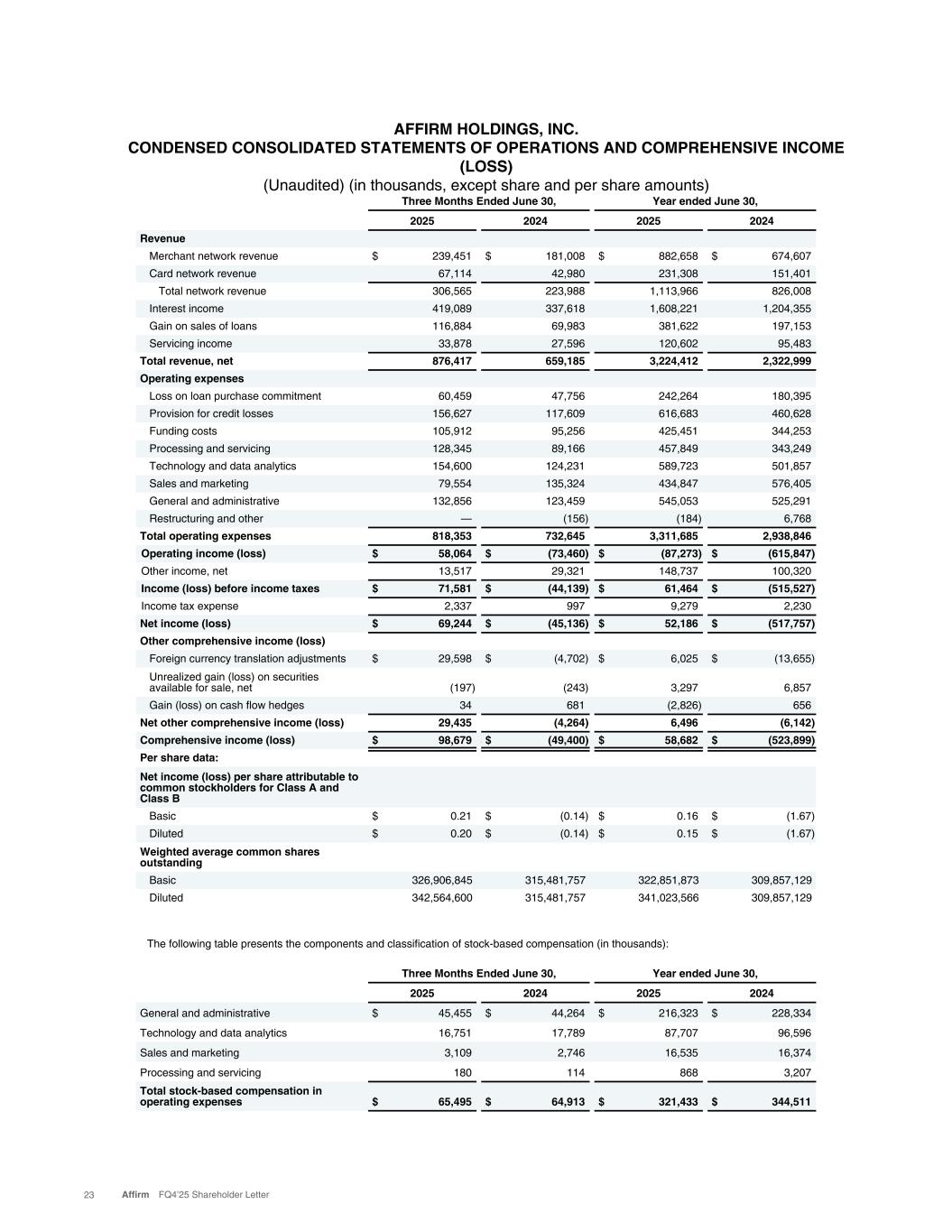 AFFIRM HOLDINGS, INC. CONDENSED CONSOLIDATED STATEMENTS OF OPERATIONS AND COMPREHENSIVE INCOME (LOSS) (Unaudited) (in thousands, except share and per share amounts) Three Months Ended June 30, Year ended June 30, 2025 2024 2025 2024 Revenue Merchant network revenue $ 239,451 $ 181,008 $ 882,658 $ 674,607 Card network revenue 67,114 42,980 231,308 151,401 Total network revenue 306,565 223,988 1,113,966 826,008 Interest income 419,089 337,618 1,608,221 1,204,355 Gain on sales of loans 116,884 69,983 381,622 197,153 Servicing income 33,878 27,596 120,602 95,483 Total revenue, net 876,417 659,185 3,224,412 2,322,999 Operating expenses Loss on loan purchase commitment 60,459 47,756 242,264 180,395 Provision for credit losses 156,627 117,609 616,683 460,628 Funding costs 105,912 95,256 425,451 344,253 Processing and servicing 128,345 89,166 457,849 343,249 Technology and data analytics 154,600 124,231 589,723 501,857 Sales and marketing 79,554 135,324 434,847 576,405 General and administrative 132,856 123,459 545,053 525,291 Restructuring and other — (156) (184) 6,768 Total operating expenses 818,353 732,645 3,311,685 2,938,846 Operating income (loss) $ 58,064 $ (73,460) $ (87,273) $ (615,847) Other income, net 13,517 29,321 148,737 100,320 Income (loss) before income taxes $ 71,581 $ (44,139) $ 61,464 $ (515,527) Income tax expense 2,337 997 9,279 2,230 Net income (loss) $ 69,244 $ (45,136) $ 52,186 $ (517,757) Other comprehensive income (loss) Foreign currency translation adjustments $ 29,598 $ (4,702) $ 6,025 $ (13,655) Unrealized gain (loss) on securities available for sale, net (197) (243) 3,297 6,857 Gain (loss) on cash flow hedges 34 681 (2,826) 656 Net other comprehensive income (loss) 29,435 (4,264) 6,496 (6,142) Comprehensive income (loss) $ 98,679 $—$ (49,400) $ 58,682 $ (523,899) Per share data: Net income (loss) per share attributable to common stockholders for Class A and Class B Basic $ 0.21 $ (0.14) $ 0.16 $ (1.67) Diluted $ 0.20 $ (0.14) $ 0.15 $ (1.67) Weighted average common shares outstanding Basic 326,906,845 315,481,757 322,851,873 309,857,129 Diluted 342,564,600 315,481,757 341,023,566 309,857,129 Three Months Ended June 30, Year ended June 30, 2025 2024 2025 2024 General and administrative $ 45,455 $ 44,264 $ 216,323 $ 228,334 Technology and data analytics 16,751 17,789 87,707 96,596 Sales and marketing 3,109 2,746 16,535 16,374 Processing and servicing 180 114 868 3,207 Total stock-based compensation in operating expenses $ 65,495 $ 64,913 $ 321,433 $ 344,511 The following table presents the components and classification of stock-based compensation (in thousands): 23 Affirm FQ4’25 Shareholder Letter