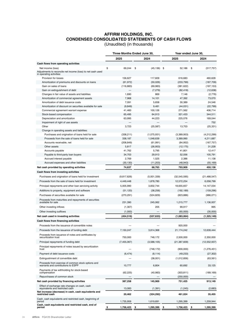AFFIRM HOLDINGS, INC. CONDENSED CONSOLIDATED STATEMENTS OF CASH FLOWS (Unaudited) (in thousands) Three Months Ended June 30, Year ended June 30, 2025 2024 2025 2024 Cash flows from operating activities Net income (loss) $ 69,244 $ (45,136) $ 52,186 $ (517,757) Adjustments to reconcile net income (loss) to net cash used in operating activities: Provision for losses 156,627 117,609 616,683 460,628 Amortization of premiums and discounts on loans (61,972) (50,026) (233,799) (187,709) Gain on sales of loans (116,883) (69,983) (381,622) (197,153) Gain on extinguishment of debt — (7,279) (82,418) (12,638) Changes in fair value of assets and liabilities 1,690 869 7,146 (2,776) Amortization of commercial agreement assets 7,968 14,101 47,392 73,070 Amortization of debt issuance costs 7,091 5,658 30,389 24,546 Amortization of discount on securities available for sale (9,849) 9,481 (44,031) (22,799) Commercial agreement warrant expense 41,460 100,126 271,562 406,714 Stock-based compensation 65,495 64,913 321,433 344,511 Depreciation and amortization 63,995 44,223 225,076 169,044 Impairment of right of use assets — — — 752 Other 3,723 (25,587) 13,703 (25,331) Change in operating assets and liabilities: Purchases and origination of loans held for sale (338,211) (1,075,931) (3,389,953) (4,212,299) Proceeds from the sale of loans held for sale 338,187 1,048,639 3,389,990 4,211,687 Accounts receivable, net (208,849) (61,991) (84,952) (167,757) Other assets 5,817 (26,953) (12,175) 31,228 Accounts payable 41,762 5,795 41,801 12,417 Payable to third-party loan buyers 34,703 29,913 52,056 105,791 Accrued interest payable 2,769 1,525 2,386 11,138 Accrued expenses and other liabilities (30,130) (11,203) (48,943) (55,169) Net cash provided by operating activities 74,637 68,763 793,909 450,138 Cash flows from investing activities Purchases and origination of loans held for investment (9,817,626) (5,931,339) (32,545,595) (21,488,547) Proceeds from the sale of loans held for investment 4,449,448 1,878,780 12,572,254 6,058,799 Principal repayments and other loan servicing activity 5,005,990 3,832,744 18,655,657 14,147,034 Additions to property, equipment and software (51,120) (38,256) (192,189) (159,296) Purchases of securities available for sale (270,291) (524,829) (823,886) (986,071) Proceeds from maturities and repayments of securities available for sale 231,390 245,062 1,215,777 1,136,937 Other investing inflows (1,307) 205 99,917 995 Other investing outflows (1,000) — (65,000) (35,000) Net cash used in investing activities (454,516) (537,633) (1,083,064) (1,325,149) Cash flows from financing activities Proceeds from the issuance of convertible notes — — 920,000 — Proceeds from the issuance of funding debt 7,150,247 3,814,368 21,174,242 12,639,444 Proceeds from issuance of notes and certificates by securitization trust 750,000 748,172 2,500,000 2,350,000 Principal repayments of funding debt (7,455,067) (3,588,105) (21,387,609) (12,552,937) Principal repayments of notes issued by securitization trust — (748,172) (900,000) (1,276,451) Payment of debt issuance costs (6,474) (8,114) (49,233) (27,302) Extinguishment of convertible debt — (38,001) (1,012,856) (63,561) Proceeds from exercise of common stock options and warrants and contributions to ESPP 10,777 6,804 60,692 33,125 Payments of tax withholding for stock-based compensation (62,225) (40,983) (303,811) (189,169) Repurchases of common stock — — (250,000) — Net cash provided by financing activities 387,258 145,969 751,425 913,149 Effect of exchange rate changes on cash, cash equivalents and restricted cash 13,083 (1,391) (1,245) (2,683) Net increase (decrease) in cash, cash equivalents and restricted cash 20,462 (324,292) 461,024 35,455 Cash, cash equivalents and restricted cash, beginning of period 1,735,959 1,619,691 1,295,399 1,259,944 Cash, cash equivalents and restricted cash, end of period $ 1,756,423 $ 1,295,399 $ 1,756,423 $ 1,295,399 24 Affirm FQ4’25 Shareholder Letter