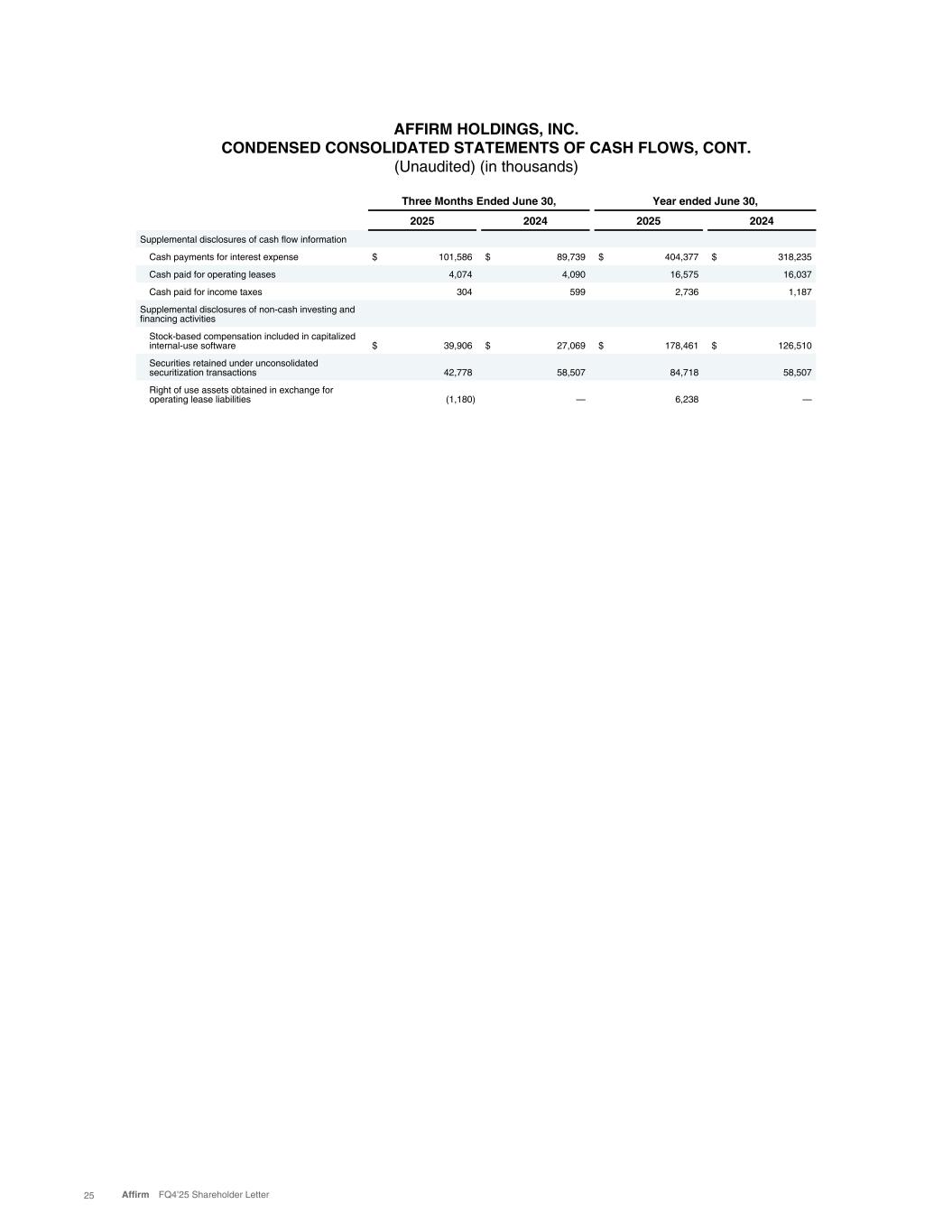 AFFIRM HOLDINGS, INC. CONDENSED CONSOLIDATED STATEMENTS OF CASH FLOWS, CONT. (Unaudited) (in thousands) Three Months Ended June 30, Year ended June 30, 2025 2024 2025 2024 Supplemental disclosures of cash flow information Cash payments for interest expense $ 101,586 $ 89,739 $ 404,377 $ 318,235 Cash paid for operating leases 4,074 4,090 16,575 16,037 Cash paid for income taxes 304 599 2,736 1,187 Supplemental disclosures of non-cash investing and financing activities Stock-based compensation included in capitalized internal-use software $ 39,906 $ 27,069 $ 178,461 $ 126,510 Securities retained under unconsolidated securitization transactions 42,778 58,507 84,718 58,507 Right of use assets obtained in exchange for operating lease liabilities (1,180) — 6,238 — 25 Affirm FQ4’25 Shareholder Letter