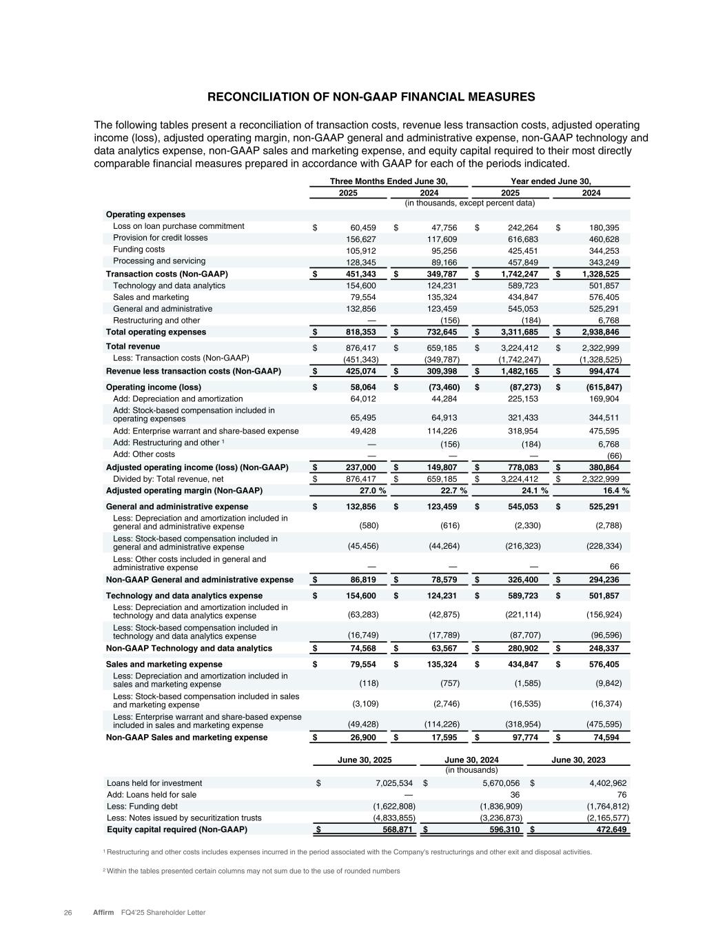 RECONCILIATION OF NON-GAAP FINANCIAL MEASURES The following tables present a reconciliation of transaction costs, revenue less transaction costs, adjusted operating income (loss), adjusted operating margin, non-GAAP general and administrative expense, non-GAAP technology and data analytics expense, non-GAAP sales and marketing expense, and equity capital required to their most directly comparable financial measures prepared in accordance with GAAP for each of the periods indicated. Three Months Ended June 30, Year ended June 30, 2025 2024 2025 2024 (in thousands, except percent data) Operating expenses Loss on loan purchase commitment $ 60,459 $ 47,756 $ 242,264 $ 180,395 Provision for credit losses 156,627 117,609 616,683 460,628 Funding costs 105,912 95,256 425,451 344,253 Processing and servicing 128,345 89,166 457,849 343,249 Transaction costs (Non-GAAP) $ 451,343 $ 349,787 $ 1,742,247 $ 1,328,525 Technology and data analytics 154,600 124,231 589,723 501,857 Sales and marketing 79,554 135,324 434,847 576,405 General and administrative 132,856 123,459 545,053 525,291 Restructuring and other — (156) (184) 6,768 Total operating expenses $ 818,353 $ 732,645 $ 3,311,685 $ 2,938,846 Total revenue $ 876,417 $ 659,185 $ 3,224,412 $ 2,322,999 Less: Transaction costs (Non-GAAP) (451,343) (349,787) (1,742,247) (1,328,525) Revenue less transaction costs (Non-GAAP) $ 425,074 $ 309,398 $ 1,482,165 $ 994,474 Operating income (loss) $ 58,064 $ (73,460) $ (87,273) $ (615,847) Add: Depreciation and amortization 64,012 44,284 225,153 169,904 Add: Stock-based compensation included in operating expenses 65,495 64,913 321,433 344,511 Add: Enterprise warrant and share-based expense 49,428 114,226 318,954 475,595 Add: Restructuring and other 1 — (156) (184) 6,768 Add: Other costs — — — (66) Adjusted operating income (loss) (Non-GAAP) $ 237,000 $ 149,807 $ 778,083 $ 380,864 Divided by: Total revenue, net $ 876,417 $ 659,185 $ 3,224,412 $ 2,322,999 Adjusted operating margin (Non-GAAP) 27.0 % 22.7 % 24.1 % 16.4 % General and administrative expense $ 132,856 $ 123,459 $ 545,053 $ 525,291 Less: Depreciation and amortization included in general and administrative expense (580) (616) (2,330) (2,788) Less: Stock-based compensation included in general and administrative expense (45,456) (44,264) (216,323) (228,334) Less: Other costs included in general and administrative expense — — — 66 Non-GAAP General and administrative expense $ 86,819 $ 78,579 $ 326,400 $ 294,236 Technology and data analytics expense $ 154,600 $ 124,231 $ 589,723 $ 501,857 Less: Depreciation and amortization included in technology and data analytics expense (63,283) (42,875) (221,114) (156,924) Less: Stock-based compensation included in technology and data analytics expense (16,749) (17,789) (87,707) (96,596) Non-GAAP Technology and data analytics expense $ 74,568 $ 63,567 $ 280,902 $ 248,337 Sales and marketing expense $ 79,554 $ 135,324 $ 434,847 $ 576,405 Less: Depreciation and amortization included in sales and marketing expense (118) (757) (1,585) (9,842) Less: Stock-based compensation included in sales and marketing expense (3,109) (2,746) (16,535) (16,374) Less: Enterprise warrant and share-based expense included in sales and marketing expense (49,428) (114,226) (318,954) (475,595) Non-GAAP Sales and marketing expense $ 26,900 $ 17,595 $ 97,774 $ 74,594 June 30, 2025 June 30, 2024 June 30, 2023 (in thousands) Loans held for investment $ 7,025,534 $ 5,670,056 $ 4,402,962 Add: Loans held for sale — 36 76 Less: Funding debt (1,622,808) (1,836,909) (1,764,812) Less: Notes issued by securitization trusts (4,833,855) (3,236,873) (2,165,577) Equity capital required (Non-GAAP) $ 568,871 $ 596,310 $ 472,649 1 Restructuring and other costs includes expenses incurred in the period associated with the Company's restructurings and other exit and disposal activities. 2 Within the tables presented certain columns may not sum due to the use of rounded numbers 26 Affirm FQ4’25 Shareholder Letter