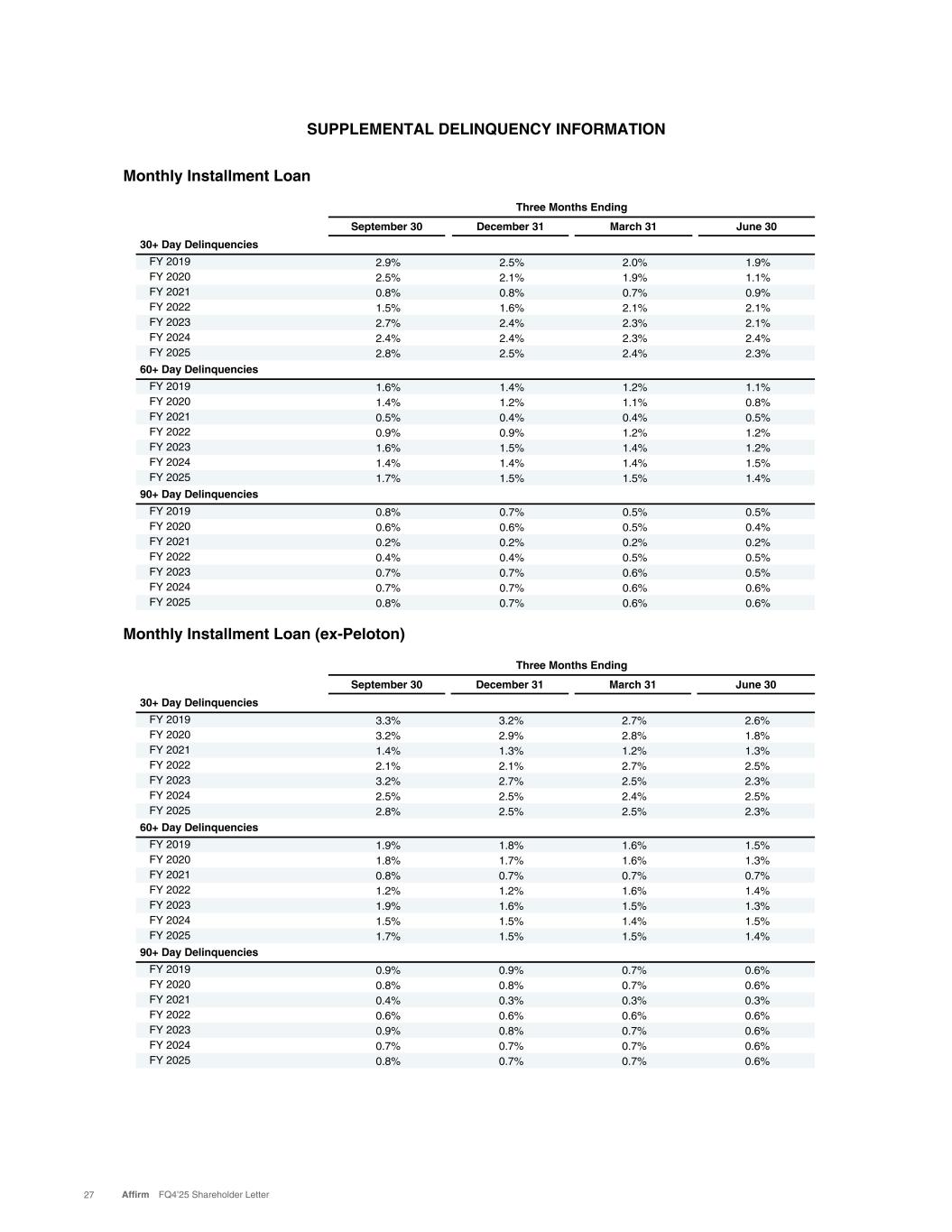 SUPPLEMENTAL DELINQUENCY INFORMATION Three Months Ending September 30 December 31 March 31 June 30 30+ Day Delinquencies FY 2019 2.9% 2.5% 2.0% 1.9% FY 2020 2.5% 2.1% 1.9% 1.1% FY 2021 0.8% 0.8% 0.7% 0.9% FY 2022 1.5% 1.6% 2.1% 2.1% FY 2023 2.7% 2.4% 2.3% 2.1% FY 2024 2.4% 2.4% 2.3% 2.4% FY 2025 2.8% 2.5% 2.4% 2.3% 60+ Day Delinquencies FY 2019 1.6% 1.4% 1.2% 1.1% FY 2020 1.4% 1.2% 1.1% 0.8% FY 2021 0.5% 0.4% 0.4% 0.5% FY 2022 0.9% 0.9% 1.2% 1.2% FY 2023 1.6% 1.5% 1.4% 1.2% FY 2024 1.4% 1.4% 1.4% 1.5% FY 2025 1.7% 1.5% 1.5% 1.4% 90+ Day Delinquencies FY 2019 0.8% 0.7% 0.5% 0.5% FY 2020 0.6% 0.6% 0.5% 0.4% FY 2021 0.2% 0.2% 0.2% 0.2% FY 2022 0.4% 0.4% 0.5% 0.5% FY 2023 0.7% 0.7% 0.6% 0.5% FY 2024 0.7% 0.7% 0.6% 0.6% FY 2025 0.8% 0.7% 0.6% 0.6% Three Months Ending September 30 December 31 March 31 June 30 30+ Day Delinquencies FY 2019 3.3% 3.2% 2.7% 2.6% FY 2020 3.2% 2.9% 2.8% 1.8% FY 2021 1.4% 1.3% 1.2% 1.3% FY 2022 2.1% 2.1% 2.7% 2.5% FY 2023 3.2% 2.7% 2.5% 2.3% FY 2024 2.5% 2.5% 2.4% 2.5% FY 2025 2.8% 2.5% 2.5% 2.3% 60+ Day Delinquencies FY 2019 1.9% 1.8% 1.6% 1.5% FY 2020 1.8% 1.7% 1.6% 1.3% FY 2021 0.8% 0.7% 0.7% 0.7% FY 2022 1.2% 1.2% 1.6% 1.4% FY 2023 1.9% 1.6% 1.5% 1.3% FY 2024 1.5% 1.5% 1.4% 1.5% FY 2025 1.7% 1.5% 1.5% 1.4% 90+ Day Delinquencies FY 2019 0.9% 0.9% 0.7% 0.6% FY 2020 0.8% 0.8% 0.7% 0.6% FY 2021 0.4% 0.3% 0.3% 0.3% FY 2022 0.6% 0.6% 0.6% 0.6% FY 2023 0.9% 0.8% 0.7% 0.6% FY 2024 0.7% 0.7% 0.7% 0.6% FY 2025 0.8% 0.7% 0.7% 0.6% Monthly Installment Loan (ex-Peloton) Monthly Installment Loan 27 Affirm FQ4’25 Shareholder Letter
