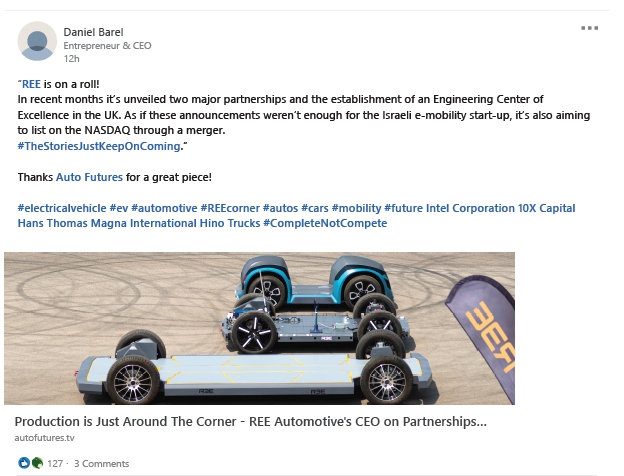 In April 2021, REE announced a strategic collaboration agreement with Magna International Inc., with the goal of bringing to market innovative, full-fledged Modular Electric Vehicles (MEVs) for tech companies and new electric mobility players under the ‘Powered by REE’ brand.