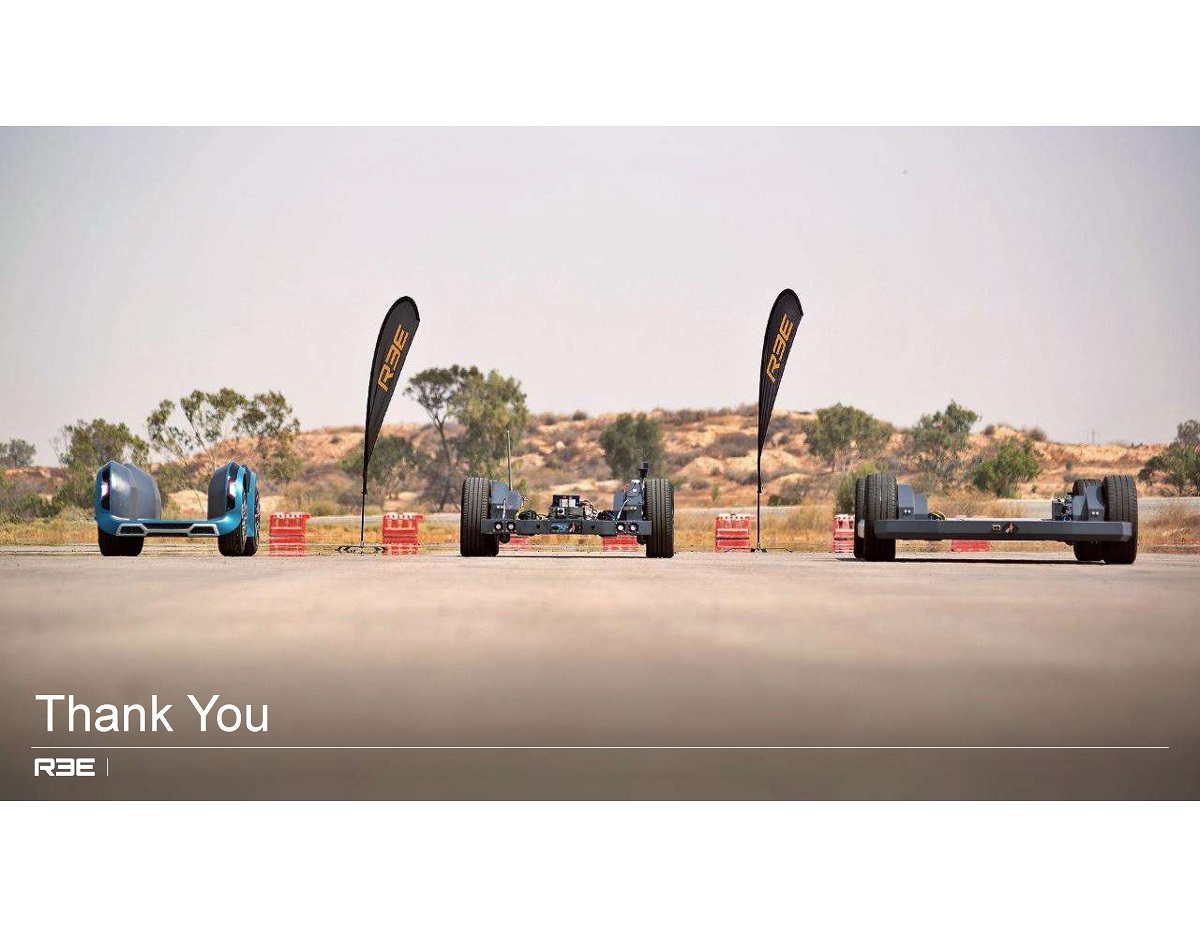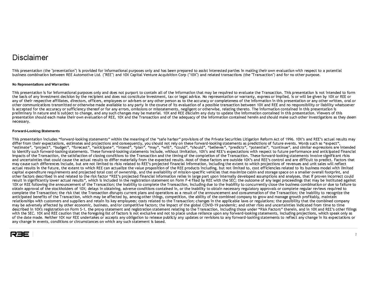 This communication includes forward-looking statements. These forward-looking statements are based on REE’s and 10X SPAC’s expectations and beliefs concerning future events and involve risks and uncertainties that may cause actual results to differ materially from current expectations. These factors are difficult to predict accurately and may be beyond REE’s and 10X SPAC’s control. Forward-looking statements in this communication or elsewhere speak only as of the date made. New uncertainties and risks arise from time to time, and it is impossible for REE or 10X SPAC to predict these events or how they may affect REE or 10X SPAC. Except as required by law, neither REE nor 10X SPAC has any duty to, and does not intend to, update or revise the forward-looking statements in this communication or elsewhere after the date this communication is issued. In light of these risks and uncertainties, investors should keep in mind that results, events or developments discussed in any forward-looking statement made in this communication may not occur. Uncertainties and risk factors that could affect REE’s and 10X SPAC’s future performance and cause results to differ from the forward-looking statements in this release include, but are not limited to: the occurrence of any event, change or other circumstances that could give rise to the termination of the business combination; the ability to realize the goals and targets described in this presentation; the outcome of any legal proceedings that may be instituted against REE or 10X SPAC, the combined company or others following the announcement of the business combination; the inability to complete the business combination due to the failure to obtain approval of the shareholders of 10X SPAC or to satisfy other conditions to closing; changes to the proposed structure of the business combination that may be required or appropriate as a result of applicable laws or regulations; the ability to meet stock exchange listing standards following the consummation of the business combination; the risk that the business combination disrupts current plans and operations of 10X SPAC or REE as a result of the announcement and consummation of the business combination; the ability to recognize the anticipated benefits of the business combination, which may be affected by, among other things, competition, the ability of the combined company to grow and manage growth profitably, maintain relationships with customers and retain its management and key employees; costs related to the business combination; changes in applicable laws or regulations; REE’s estimates of expenses and profitability and underlying assumptions with respect to shareholder redemptions and purchase price and other adjustments; intense competition in the e-mobility space, including with competitors who have significantly more resources; ability to grow and scale REE’s manufacturing capacity through new relationships with Tier 1 suppliers; ability to maintain relationships with current Tier 1 suppliers and strategic partners; ability to make continued investments in REE’s platform; the need to attract, train and retain highly-skilled technical workforce; the impact of the ongoing COVID-19 pandemic; changes in laws and regulations that impact REE; ability to enforce, protect and maintain intellectual property rights; and risks related to the fact that we are incorporated in Israel and governed by Israeli law; and other risks and uncertainties set forth in the section entitled “Risk Factors” and “Cautionary Note Regarding Forward-Looking Statements” in 10X SPAC’s final prospectus dated November 24, 2020 relating to its initial public offering and in subsequent filings with the SEC, and in the registration statement on Form F-4 relating to the business combination filed by REE on March 10, 2021.